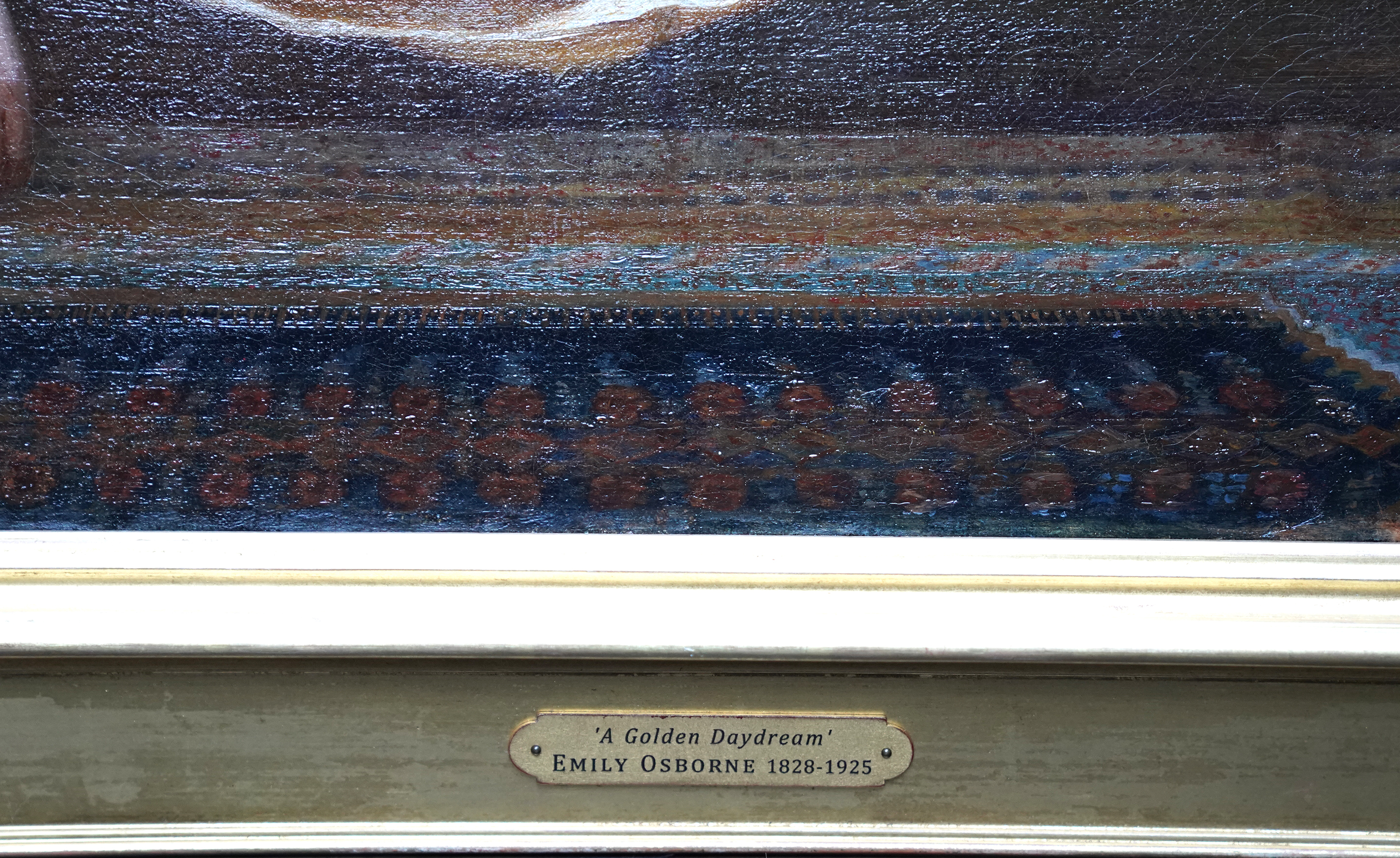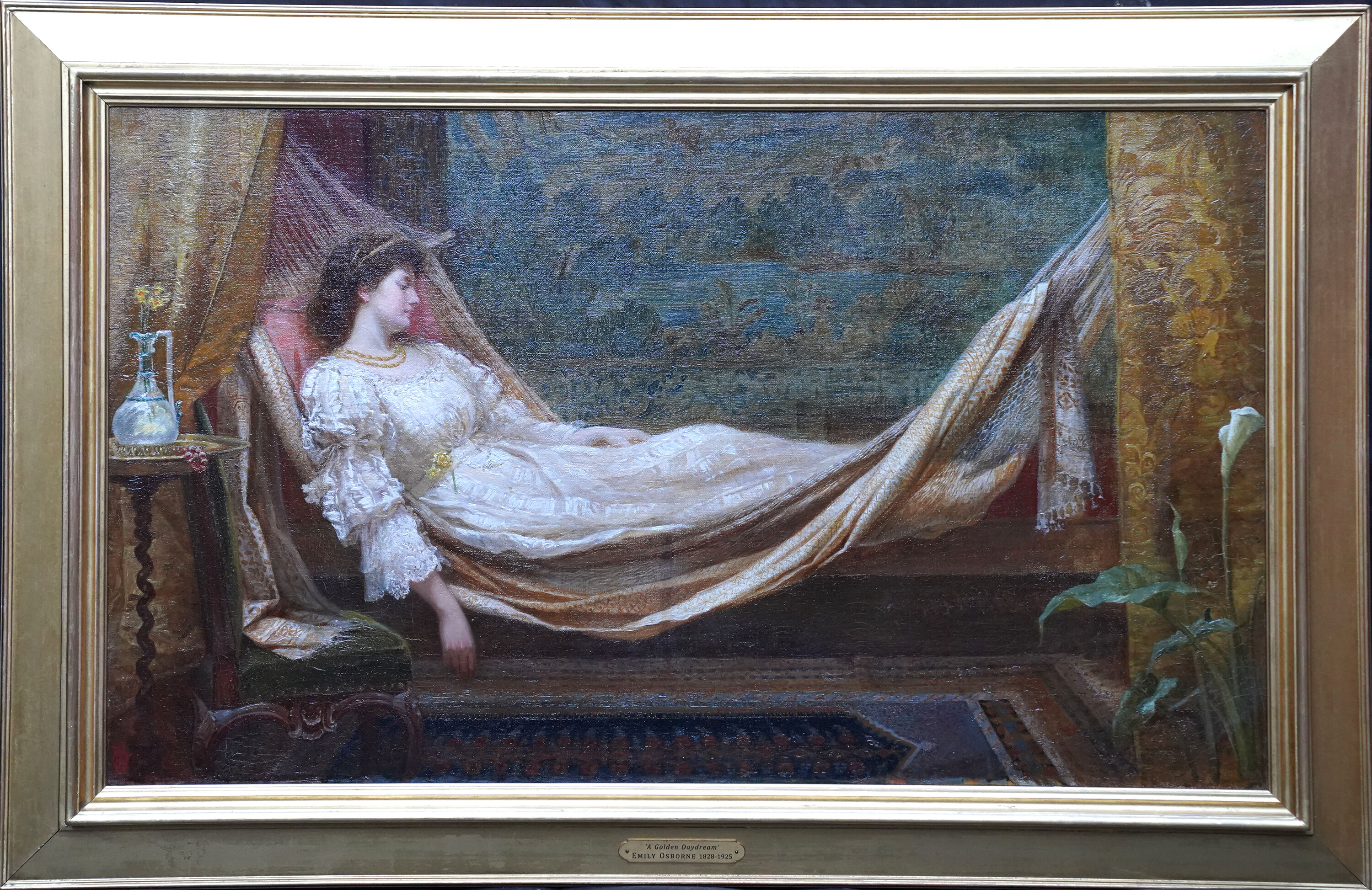 | Biography | Emily Mary Osborn (1828-1925) was one of the pioneering generation of women who succeeded in their ambitions to be professional artists at a time when opportunities for women were limited. Emily was the daughter of a parish minister Rev. Edward Osborn (1792–1859) and his wife Mary (née Bolland, 1806–1868). But as the eldest of nine siblings, his financial support of her artistic training was limited. Her mother, Mary was an amateur artist and also encouraged her daughter, 'and watched with pride the clever portraits Emily drew of her brothers and sisters' (The Lady, 2 September 1886). Emily's infancy was spent in Kentish Town in London but the family moved to West Tilbury when she was five and there was little opportunity for artistic expression. She later recalled having to resort to making her own paints using flower-petals from the garden soaked in methylated spirits. When the family moved back to London in 1842 Reverend Edward Osborn was able to pay for Emily to attend drawing classes at the Dickenson Academy on Maddox Street where she was taught by the artist John Mogford. After three months at the academy Rev. Osborn could no longer afford his daughter's lessons but one of the drawing-masters, James Mathews Leigh recognised her talent and offered to teach her privately. She exhibited her first picture at the Royal Academy in 1851 and she showed there every year until 1868 when her mother died and the devastated Emily ceased to paint for a few years. Osborn's most famous work is Nameless and Friendless (1857), which has been called The most ingenious of all Victorian widow pictures. It depicts a recently bereaved woman attempting to make a living as an artist by offering a picture to a dealer, while two "swells" at the left ogle her. The creation of this piece was a product of its time. In the 1850s there was an influx of middle-class women into the urban environment of London. Women began more freely to occupy the streets and travel the city. This opened up opportunities for women but also introduced new social dynamics and there were many debates about this new dynamic and way of urban life. Nameless and Friendless is one of the few publicly exhibited paintings by a woman to address these new urban dynamics during the 1850s. For six months, she and one of her sisters devoted themselves to nursing the wounded soldiers of the Franco-Prussian War. Emily seems to have been in Germany studying until at least 1870 when she sent a painting to the Royal Academy in London from an address in Munich. She was certainly back in London by 1873 and had resumed her career as a successful artist. Her work was purchased by Queen Victoria and by a Mrs Sturgis who commissioned a life-sized portrait of herself and her children for a cost of 200 guineas. Emily was also supported by the artist Barbara Bodichon and Lady Burdett-Coutts both of whom commissioned portraits. Osborn signed the Declaration in Favour of Women's Suffrage in 1889, by which time she was a well-respected and venerable artist. She lived until she was ninety-seven, never marrying but living for many years with a woman named Mary Elizabeth Dunn in St John's Wood until her death in 1925. The present picture was exhibited at the Royal Academy in 1877 as Dreaming Awake, described by the Art Journal as 'a figure subject showing a handsome young girl 'Dreaming Awake' in her hammock' (September 1877, p. 269) It was subsequently shown at the Birmingham Society of Artists the following year as A Golden Day Dream. The fashionably eclectic interior with the verdure tapestries, Persian carpets and exotic lilies, is typical of paintings of the Aesthetic Movement as is the languid subject of idle reverie. With this picture Osborn showed herself to be a versatile artist able to deviate from her usual subjects of portraiture, childhood or social adversity. |
