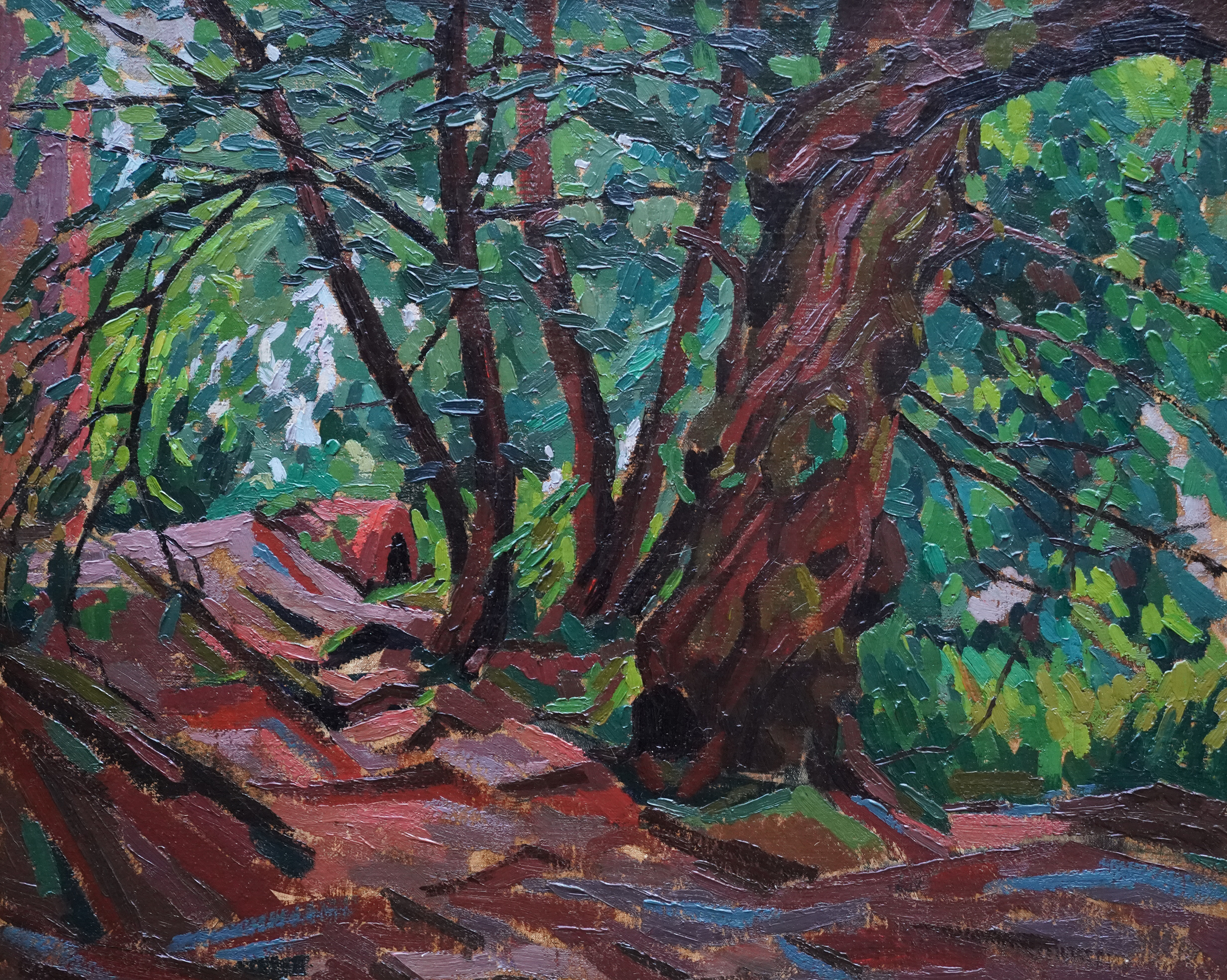 | Description | This lovely British Post Impressionist landscape oil painting is from a collection of Peter L Field paintings acquired from the family. Painted circa 1950 the composition is a densely wooded landscape, the foreground being leaves and branches on the woodland floor and then beyond a wonderful mix of green leaves and heavy brushwork and impasto. A really stunning oil painting and an excellent example of Peter Field’s work. Unsigned. |