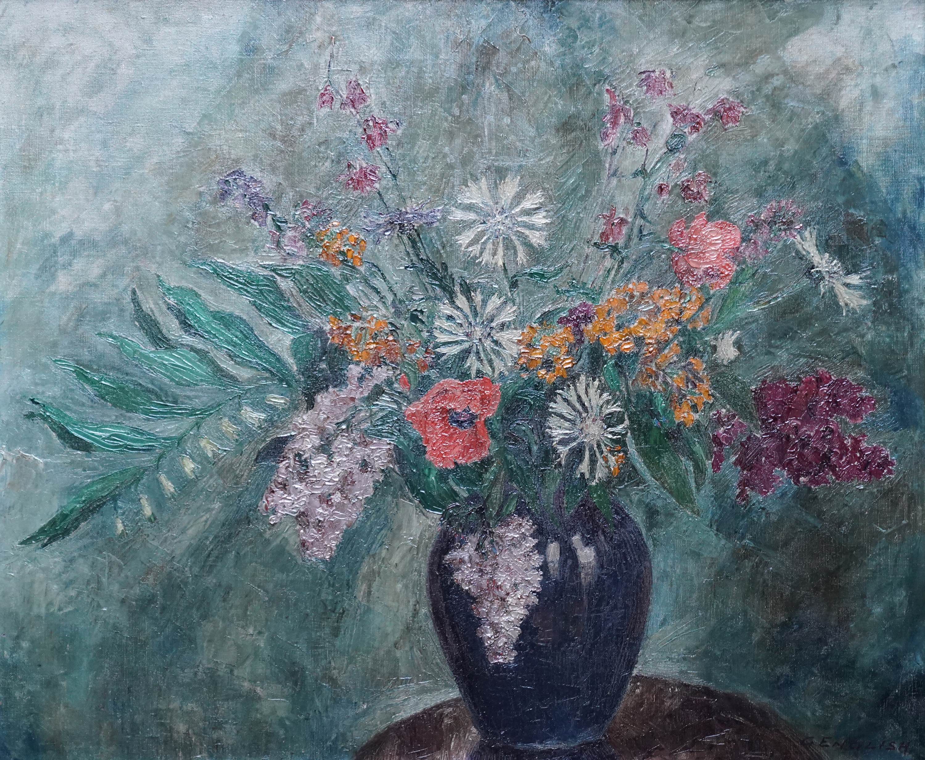 | Description | This lovely British 1930's Art Deco floral still life oil painting is by much exhibited Slade School female artist Grace English. Painted in 1930 the composition is of a mixed floral arrangement in a blue vase on a wooden table against a green background. The flowers include solomon's seal, corn flowers, lilac and poppies to name just a few. English has used bold brushwork and heavy impasto to great effect and the details and palette are superb. This is a great 1930 flower painting by a female artist and a lovely example of English's work which was exhibited at the WIAC Signed lower right and dated 1930 verso. |