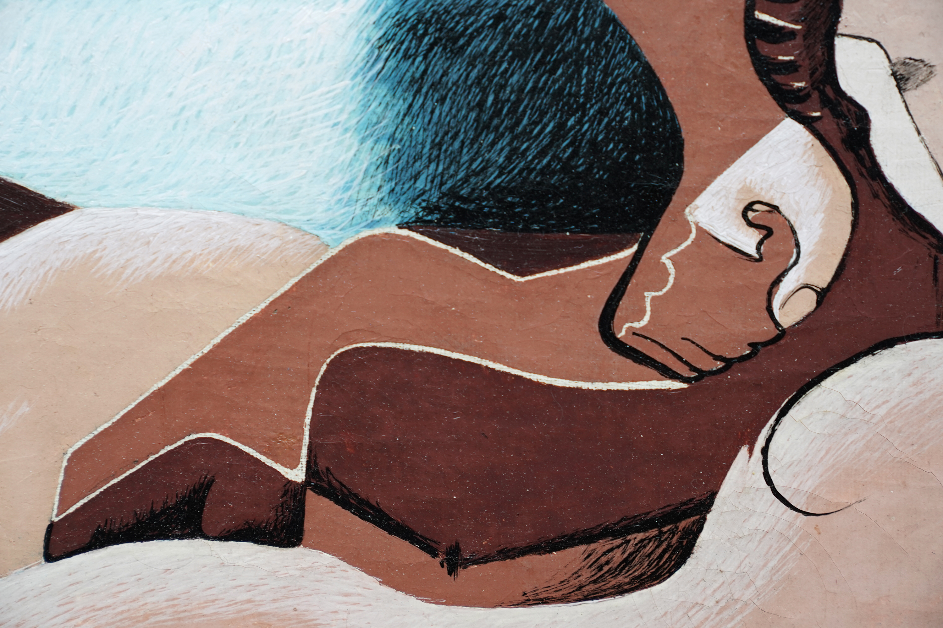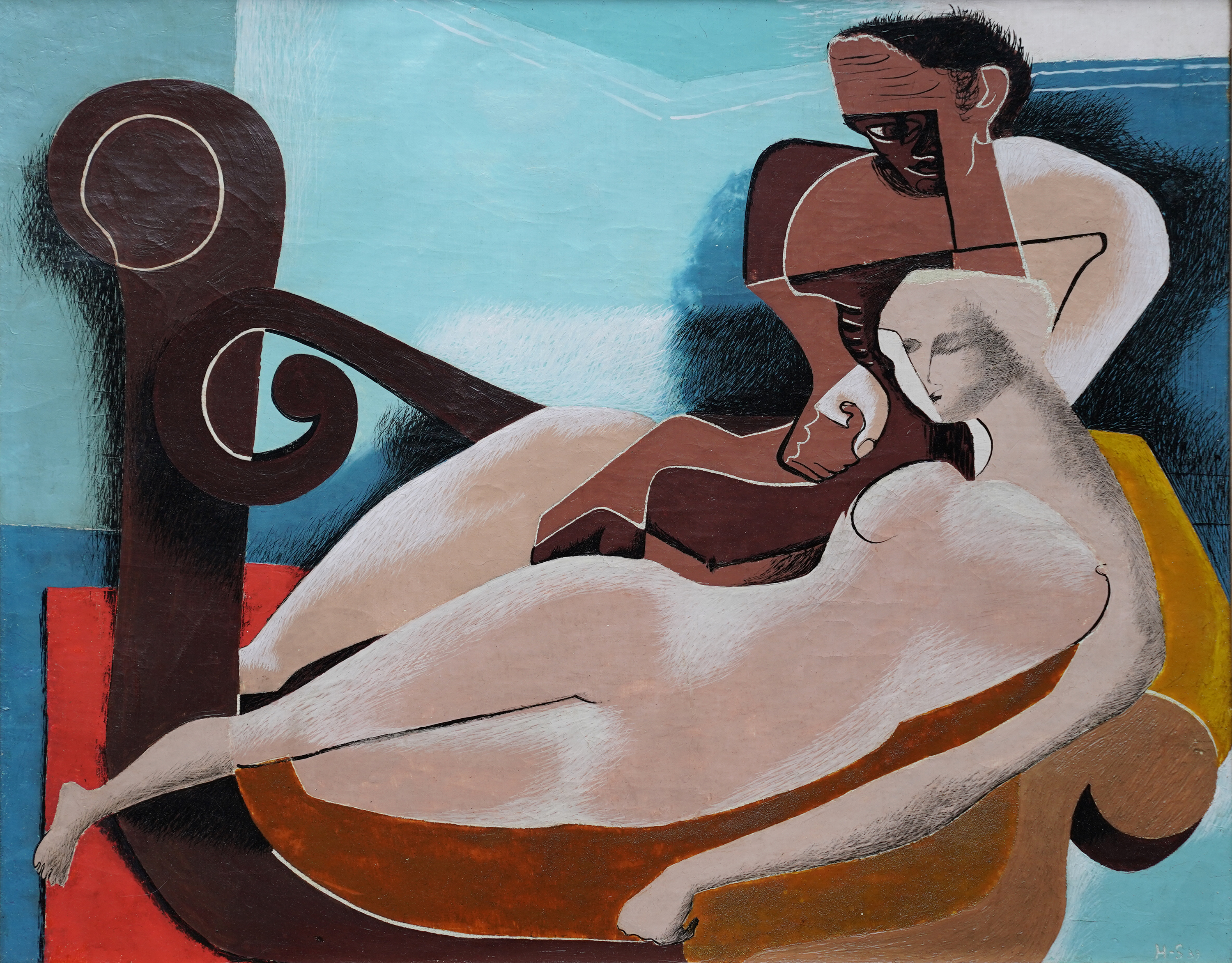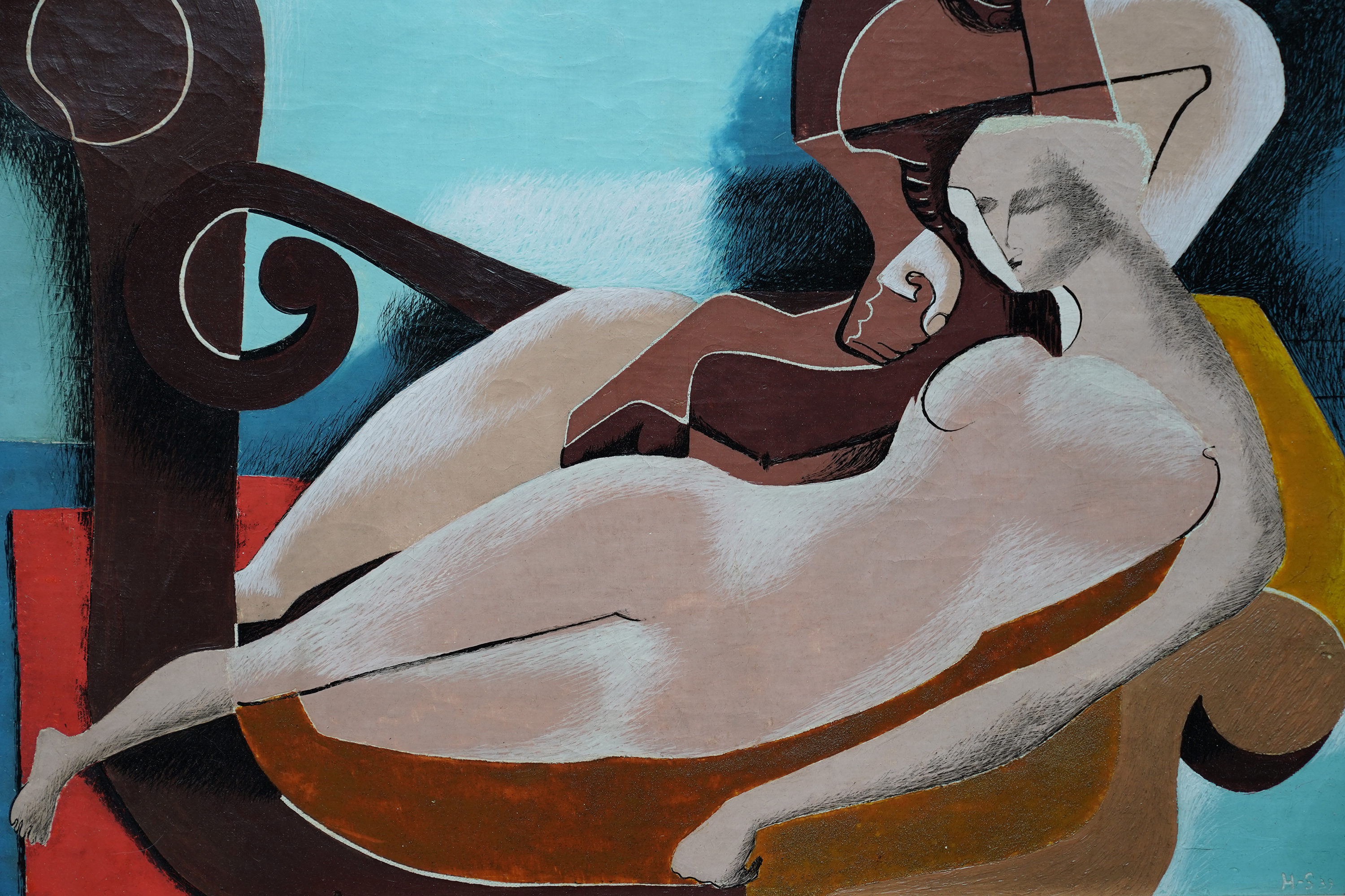 | Description | This superb British 1930's modern art tempera Surrealist painting is by noted interwar artist Blair Hughes-Stanton. Painted in 1939 it is entitled two Figures 1939 verso and may relate to Ida Graves, poet, novelist and associate of the Bloomsbury group with whom Hughes-Stanton started the Gemini Press in 1933 and had two children. The painting echoes the influence of Picasso and Stanton's interest in the female form. It is an excellent vibrant example of his work. Signed and dated lower right 'H-S 39'. Titled to label attached to the reverse. |