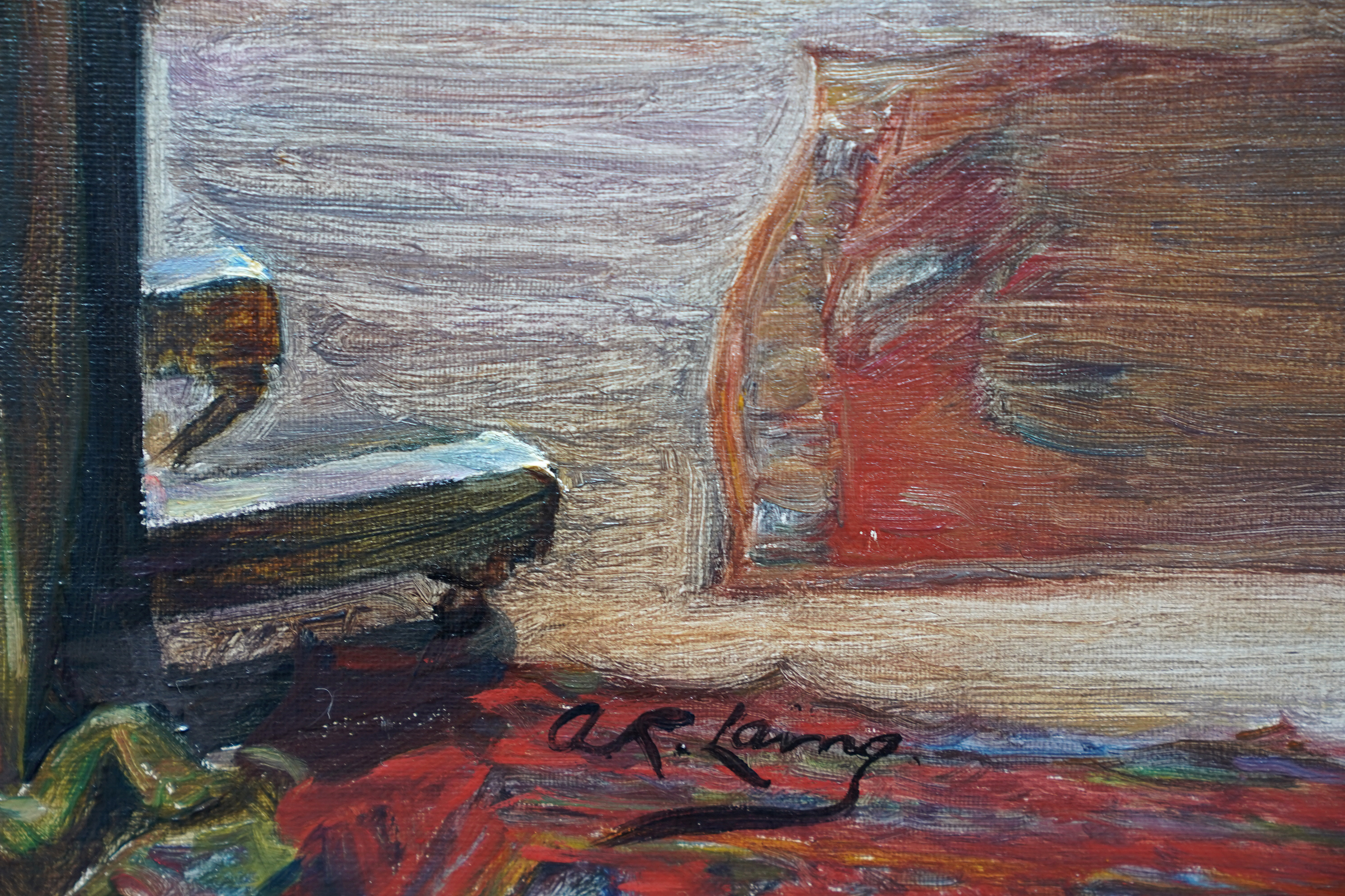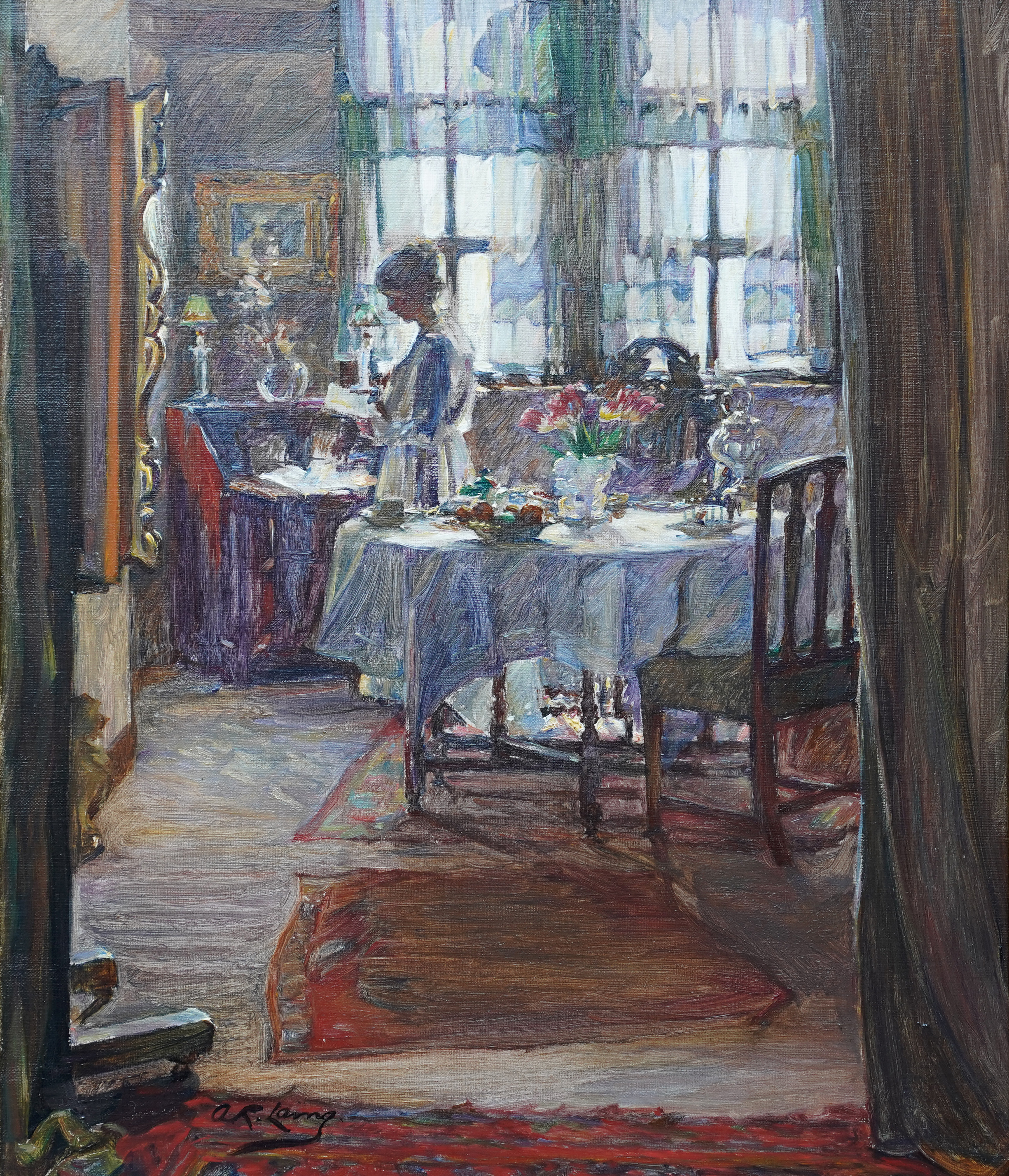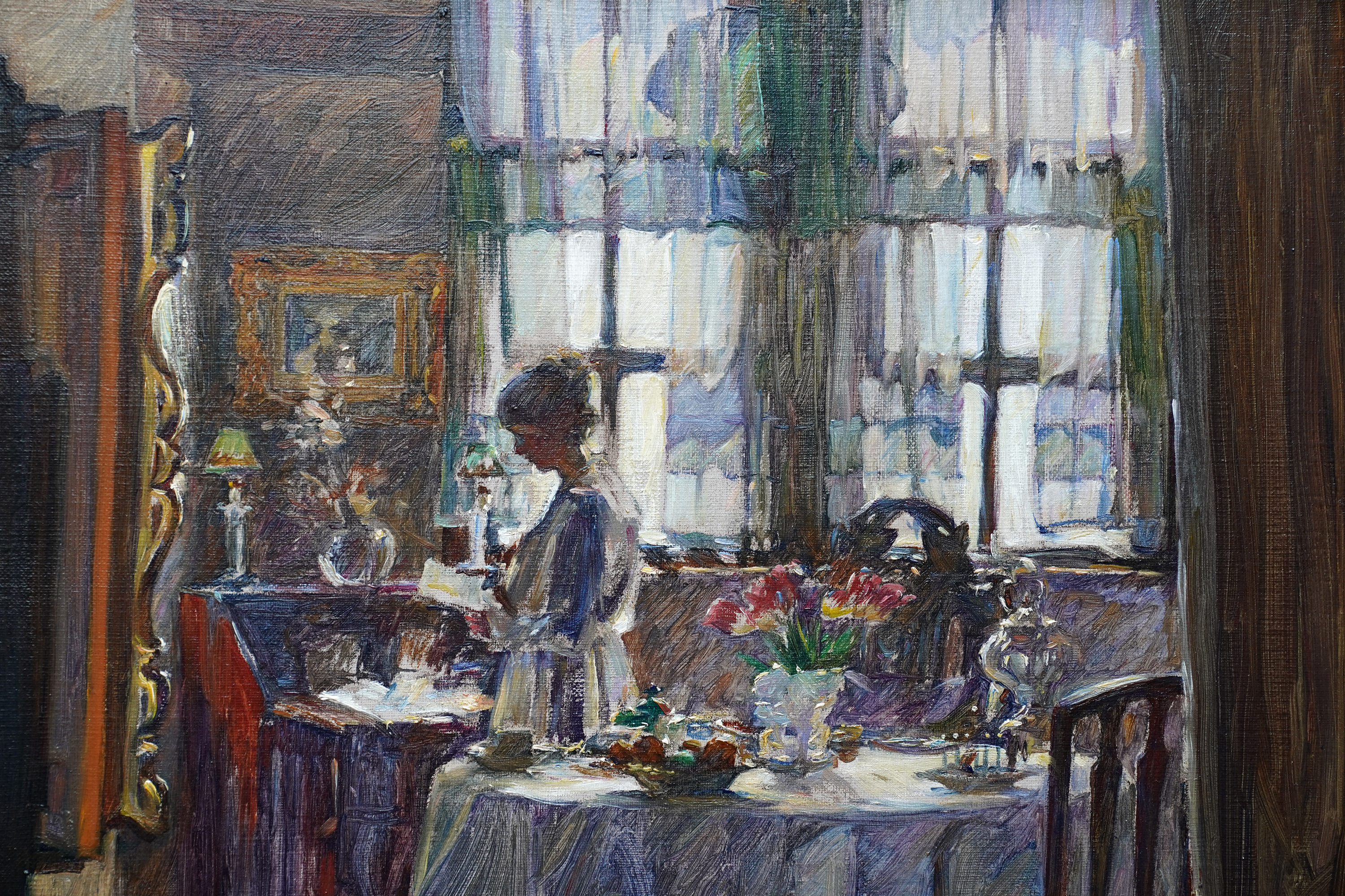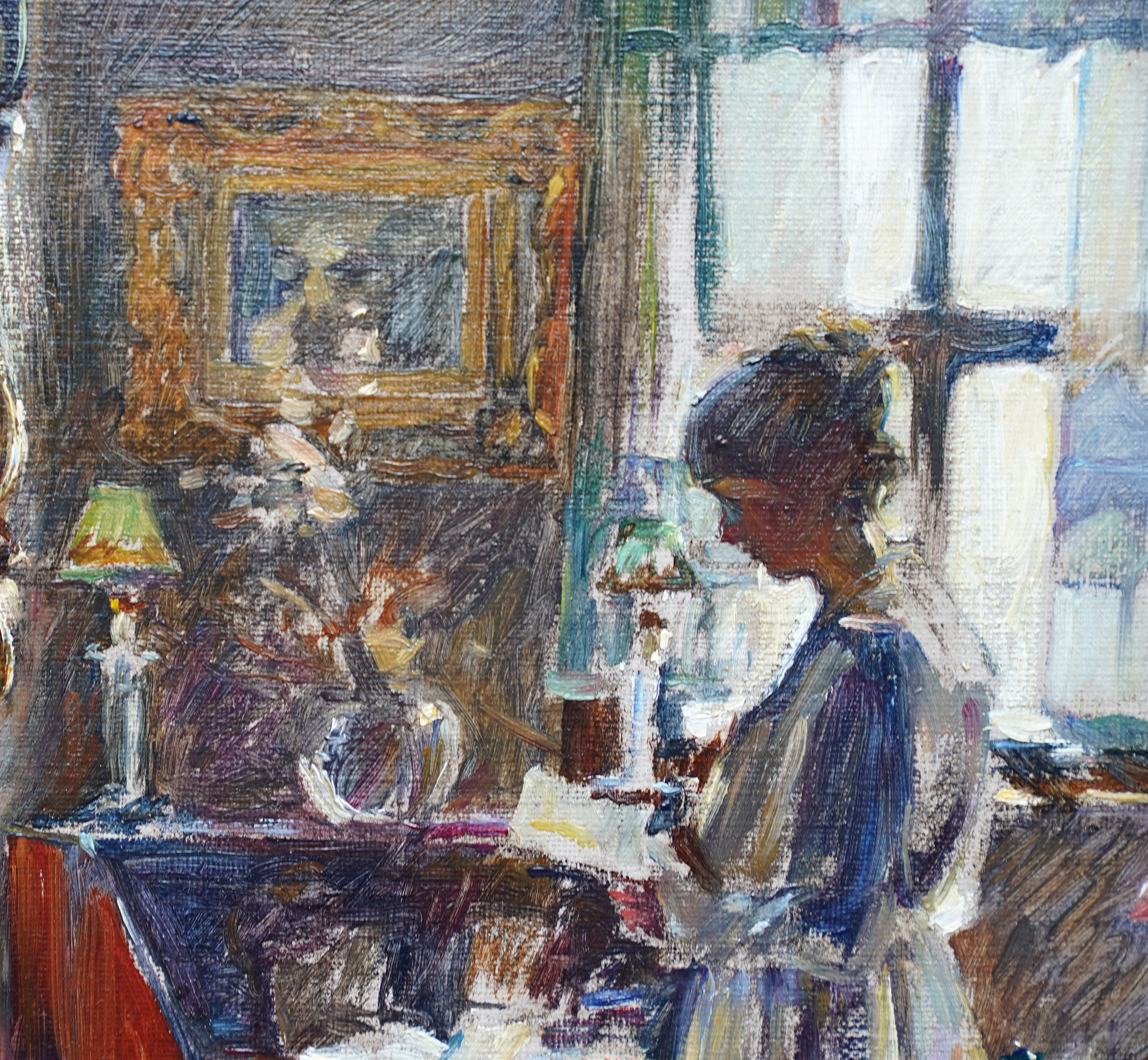 | Description | This superb Scottish Edwardian Impressionist interior oil painting is by noted Scottish female artist Annie Rose Laing. Painted circa 1910, the composition is the interior of a room with a lady stood between a table and writing desk, reading a letter. The whole scene has multiple shades of blue - on the window drapes, tablecloth, writing desk and the lady's dress. By contrast, splashes of red are on the tulips on the table, floor rugs and side of the writing desk. In the foreground one can just see the edge of a frame of a picture on an easel and another small painting above the writing desk. On the near right is the edge of a thick green velvet curtain at the door. One has the sense of peeping into a private, intimate world. This is an excellent example of a Scottish female artist at her prime. Signed lower left. |