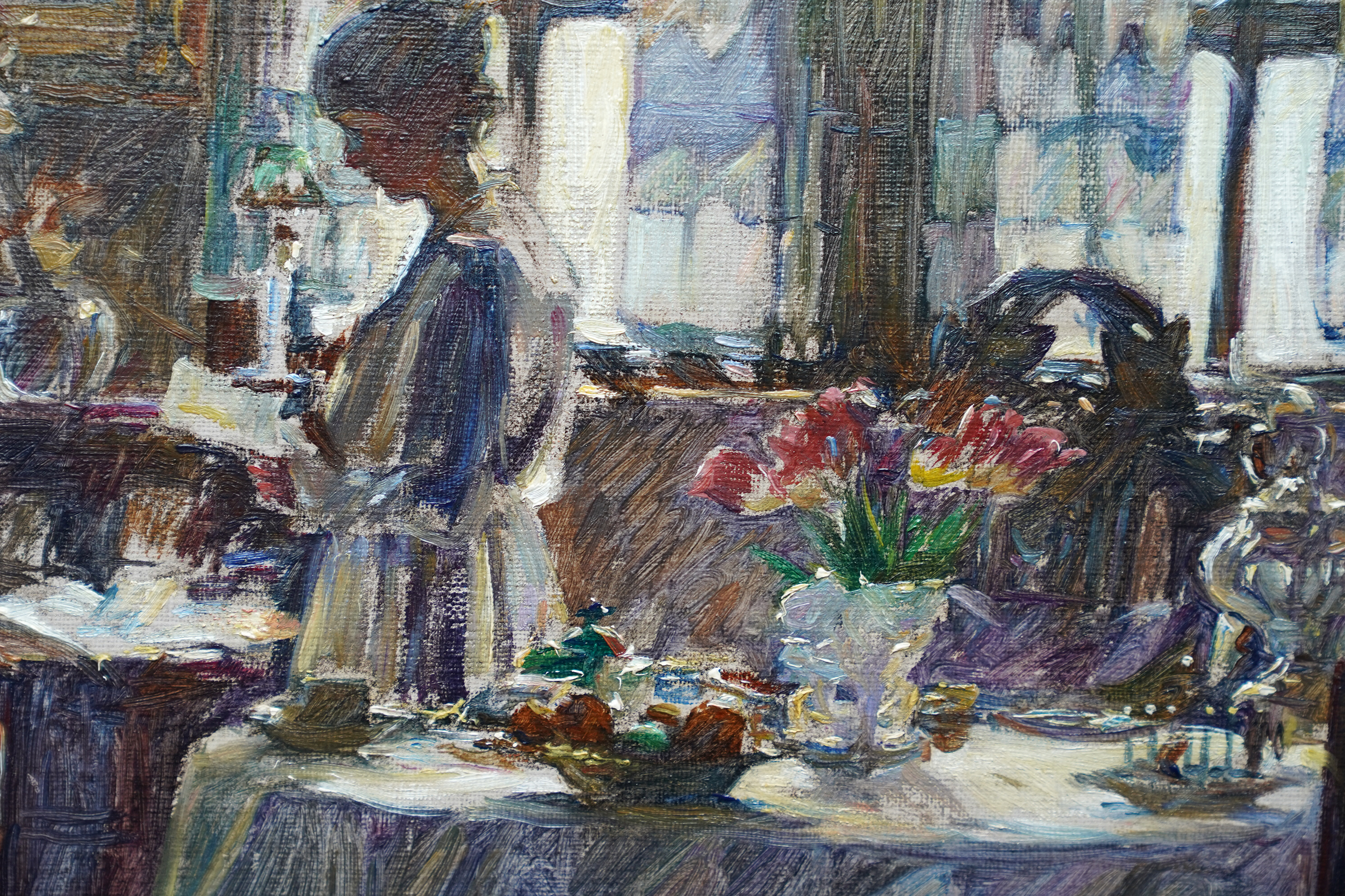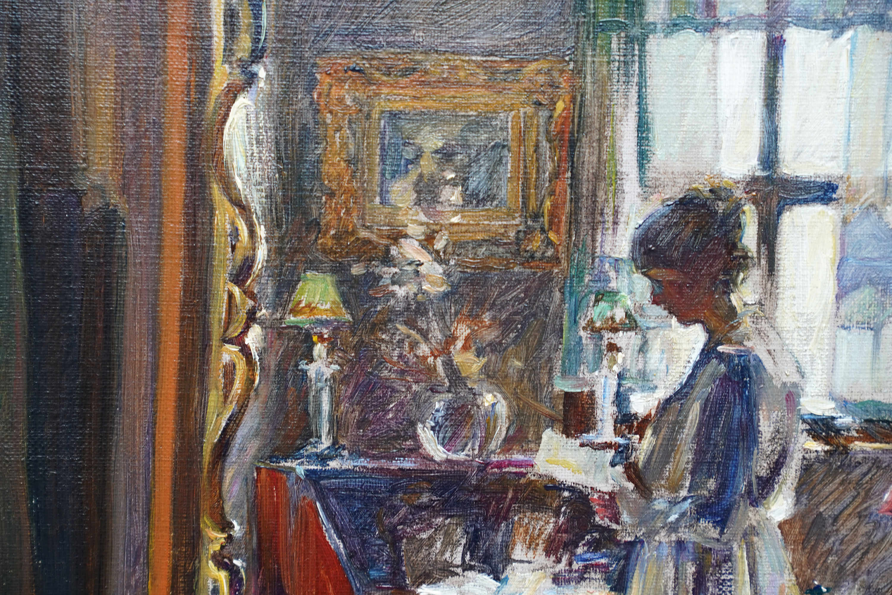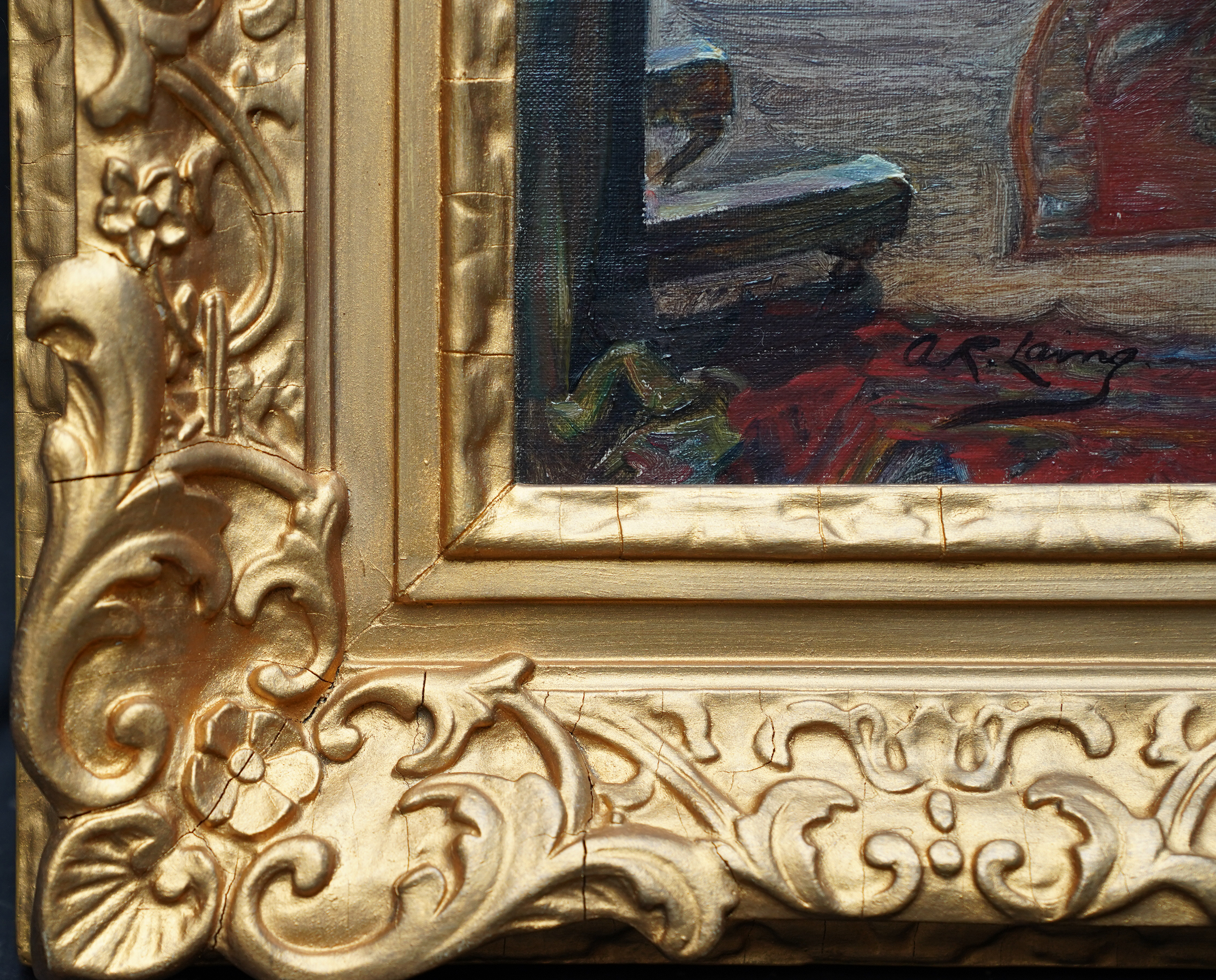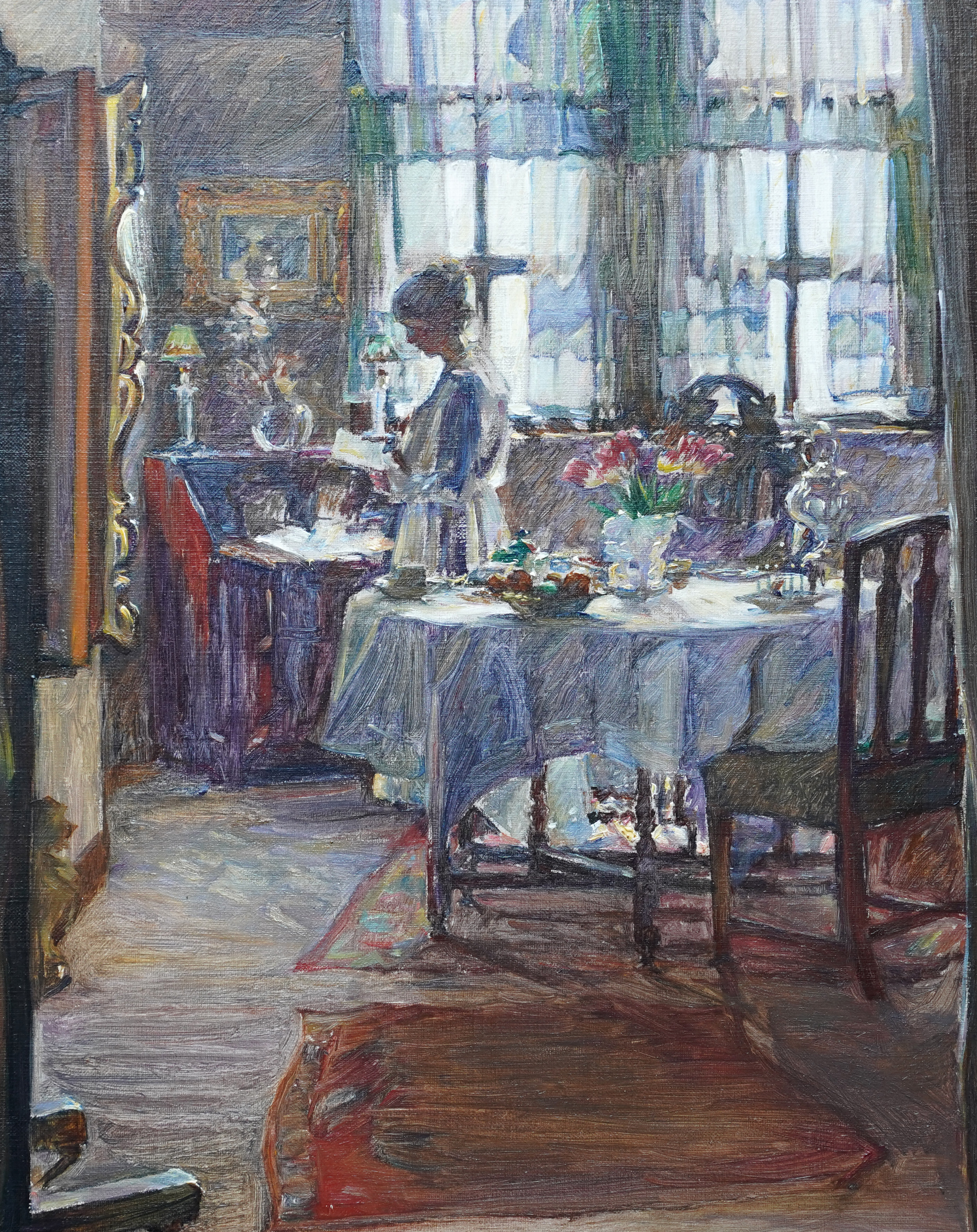 | Description | This superb Scottish Edwardian Impressionist interior oil painting is by noted Scottish female artist Annie Rose Laing. Painted circa 1910, the composition is the interior of a room with a lady stood between a table and writing desk, reading a letter. The whole scene has multiple shades of blue - on the window drapes, tablecloth, writing desk and the lady's dress. By contrast, splashes of red are on the tulips on the table, floor rugs and side of the writing desk. In the foreground one can just see the edge of a frame of a picture on an easel and another small painting above the writing desk. On the near right is the edge of a thick green velvet curtain at the door. One has the sense of peeping into a private, intimate world. This is an excellent example of a Scottish female artist at her prime. Signed lower left. |