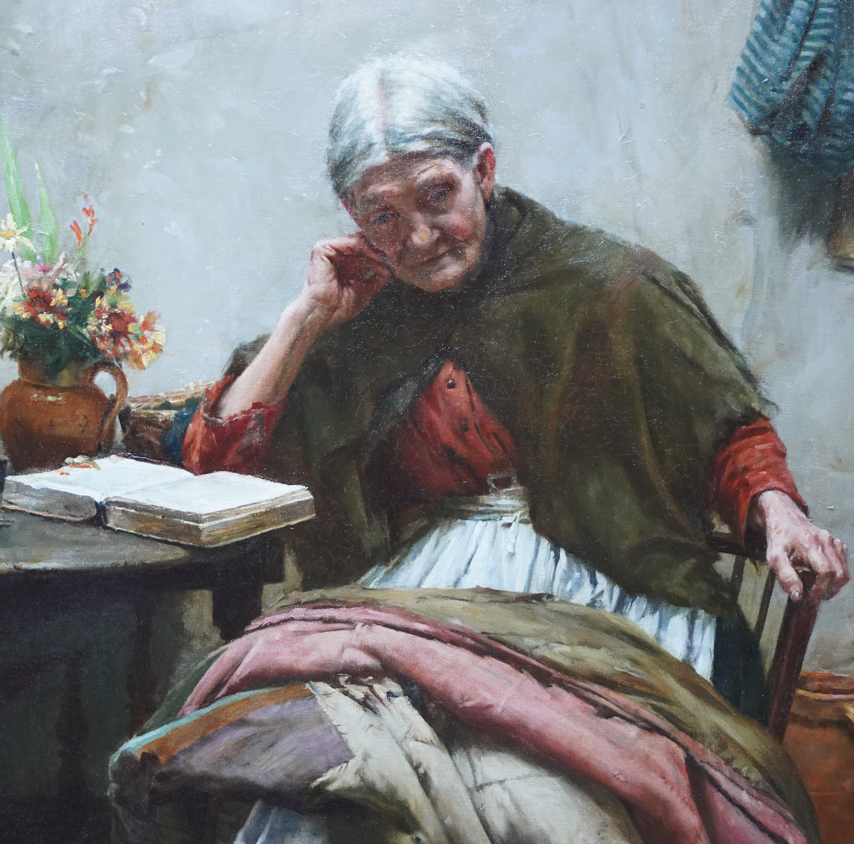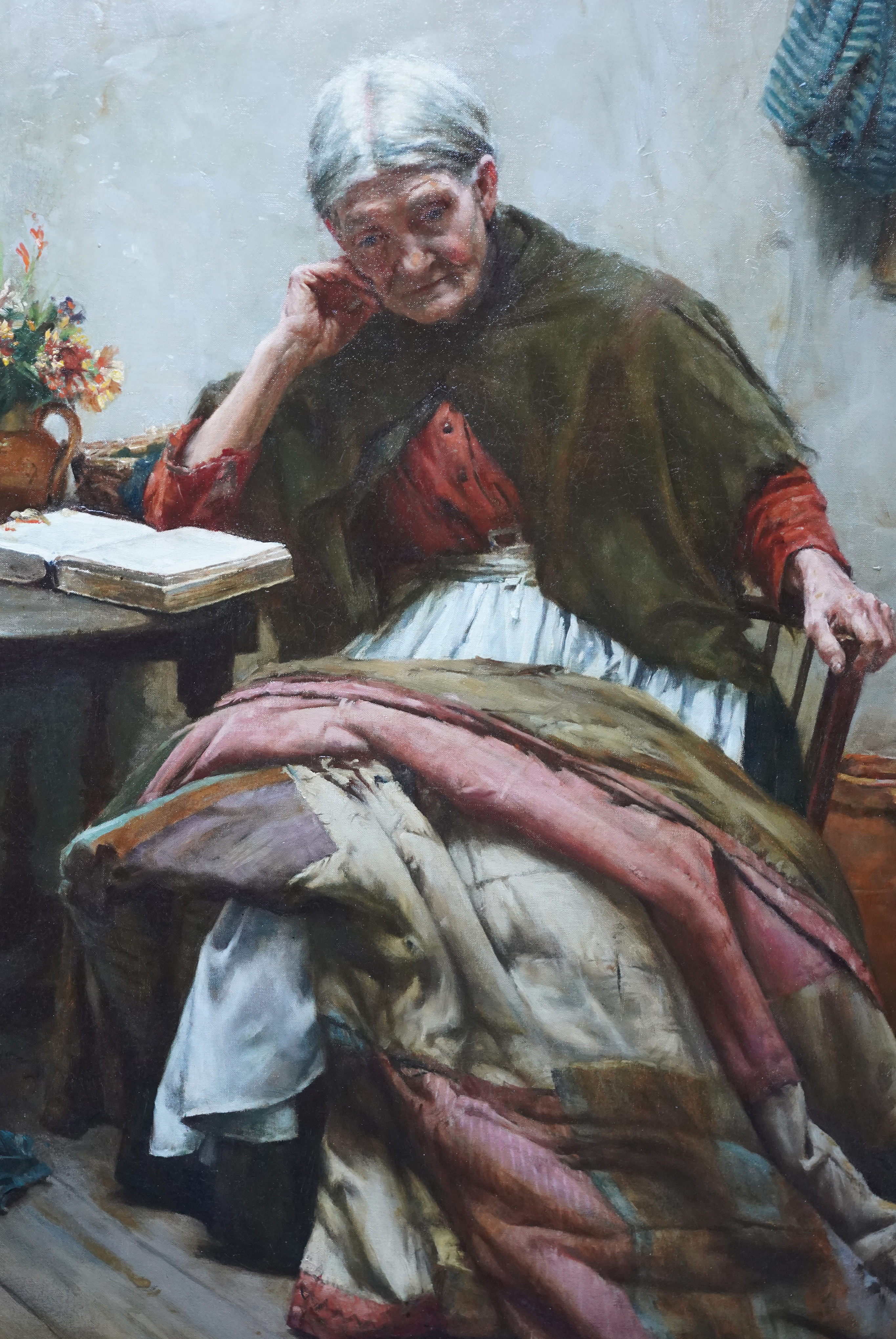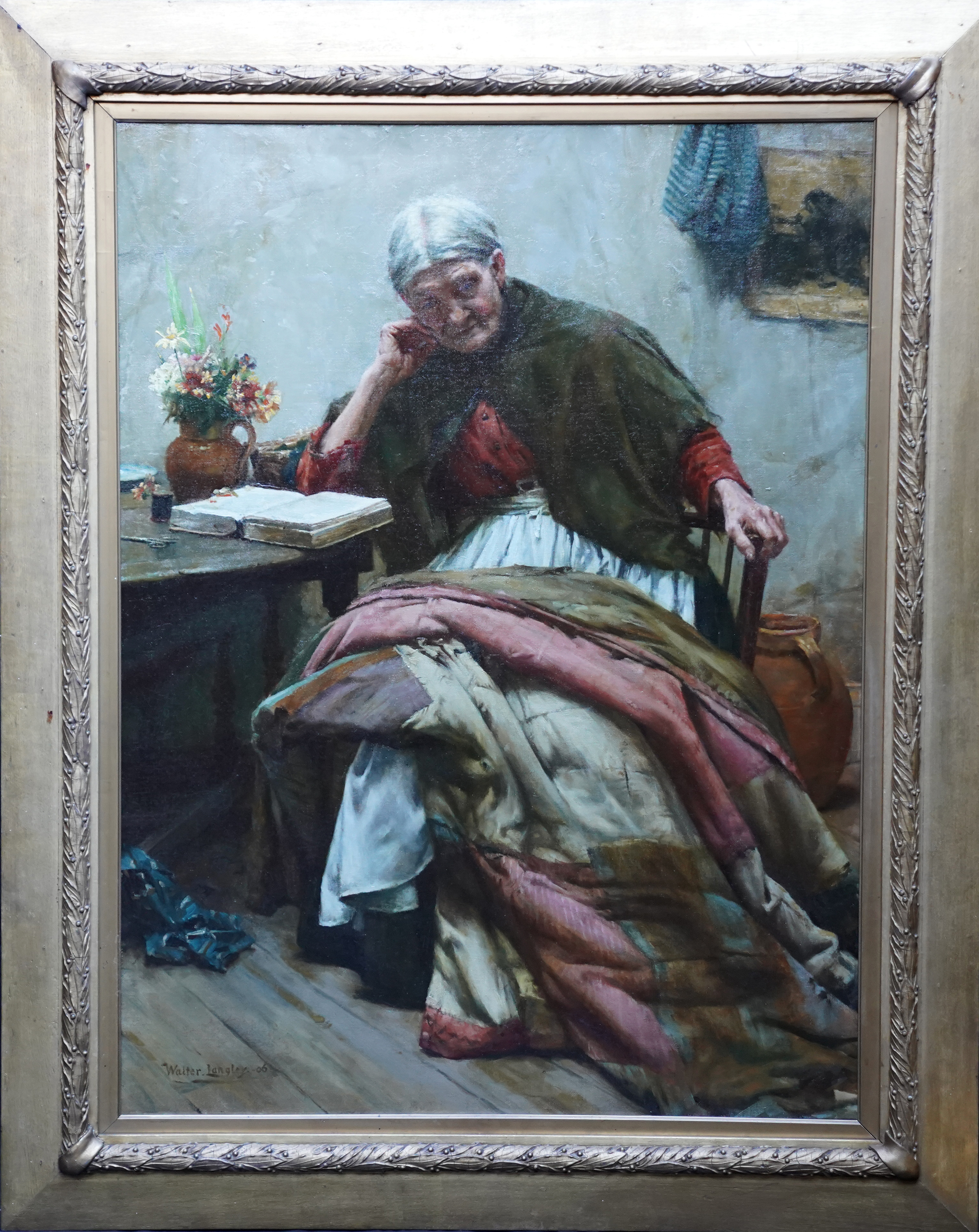 | Description | This stunning, large British Edwardian Newlyn School interior portrait oil painting is by much noted and exhibited artist Walter Langley. Originally from Birmingham, Langley and his family moved to St Ives in 1881. He was one of the first artists to settle and painted the local fishermen and their families. Painted in 1906 and entitled The Evening of Life, the painting is a full length seated portrait of an elderly lady in a cottage interior. She is sat by a table on which she has a bible, jug of flowers and her sewing equipment. Across her lap she has a large patchwork quilt to mend but is lost in thought. In fact the same sitter and quilt can be seen in Memories, also painted in 1906 and in the Ferens Art Gallery, Hull. Memories includes more of the cottage interior but the sitter's head is bowed towards her hands. The Evening of Life is more vibrant and the sitters face is much more visible as are the lovely colours of the quilt. The painting has fantastic detail, great brushwork and the Newlyn school palette of colours. The provenance is excellent, having been kept in the same family ownership so fresh to market. The painting appeared in the artist's catalogue Raisonne and was also in 1997 biography by Langely's grandson, Roger Langley, entitled Walter Langley: Pioneer of the Newlyn Art Colony. This a superb example of Langley's work, a good size and composition and a pleasure to gaze upon. Signed lower left and dated (19)06. |