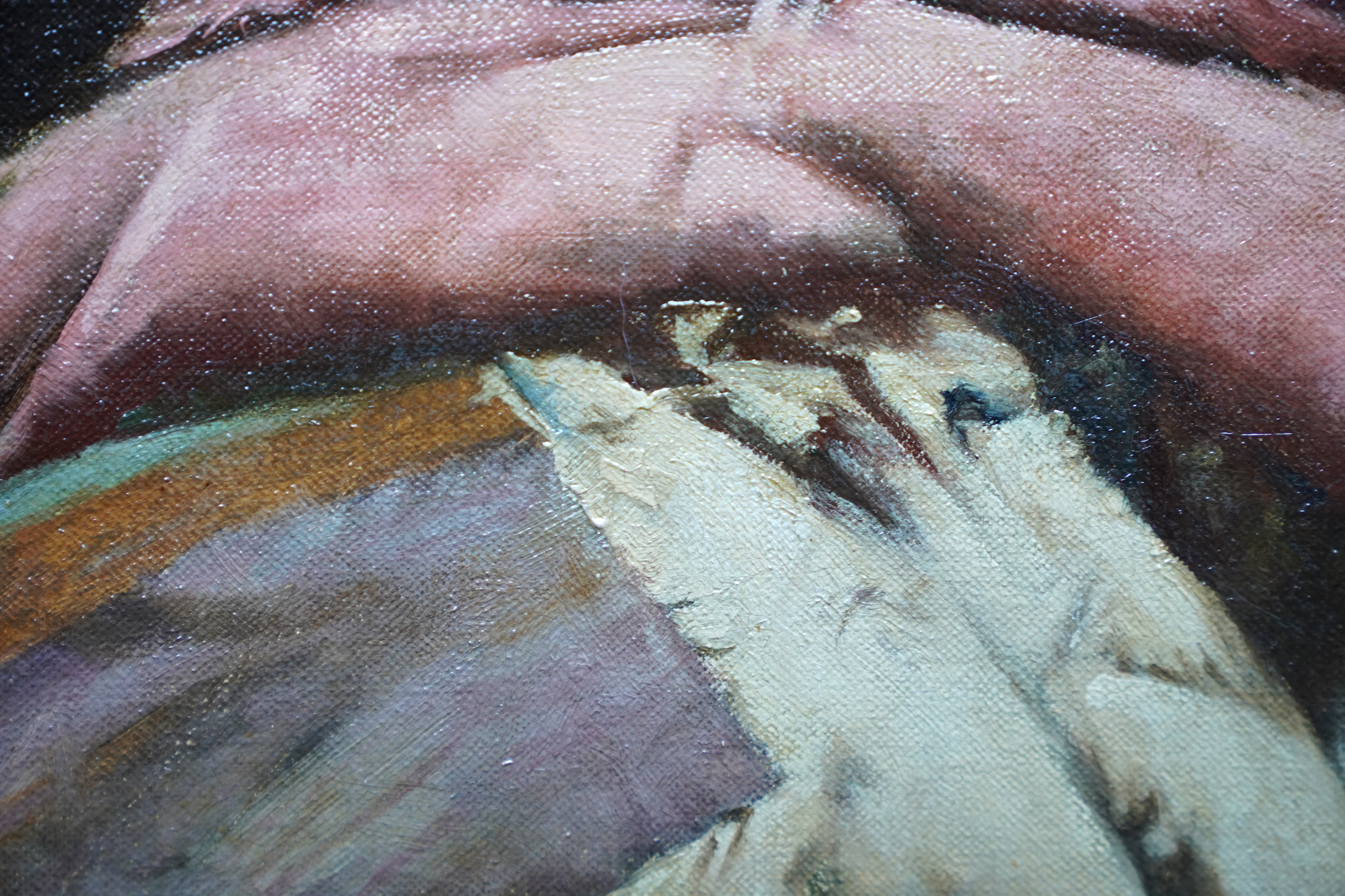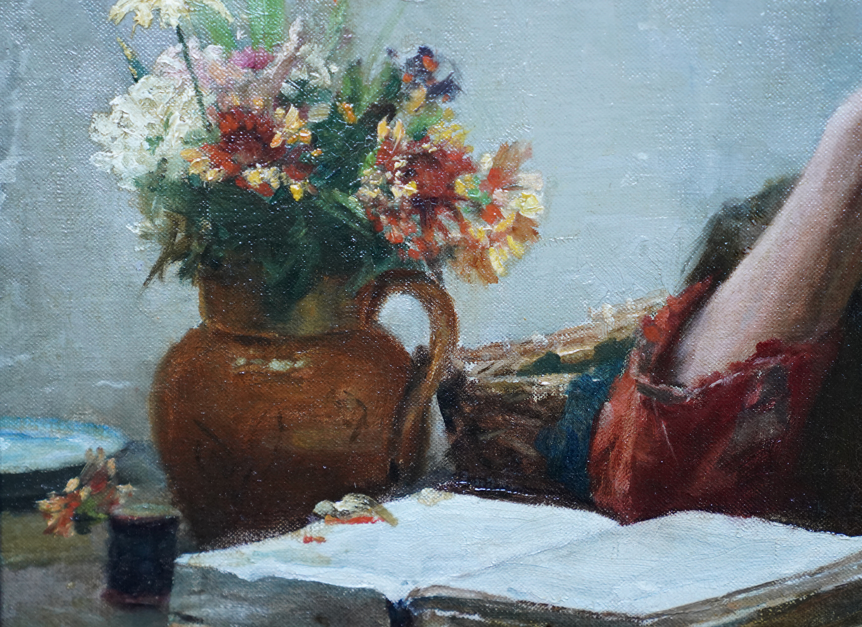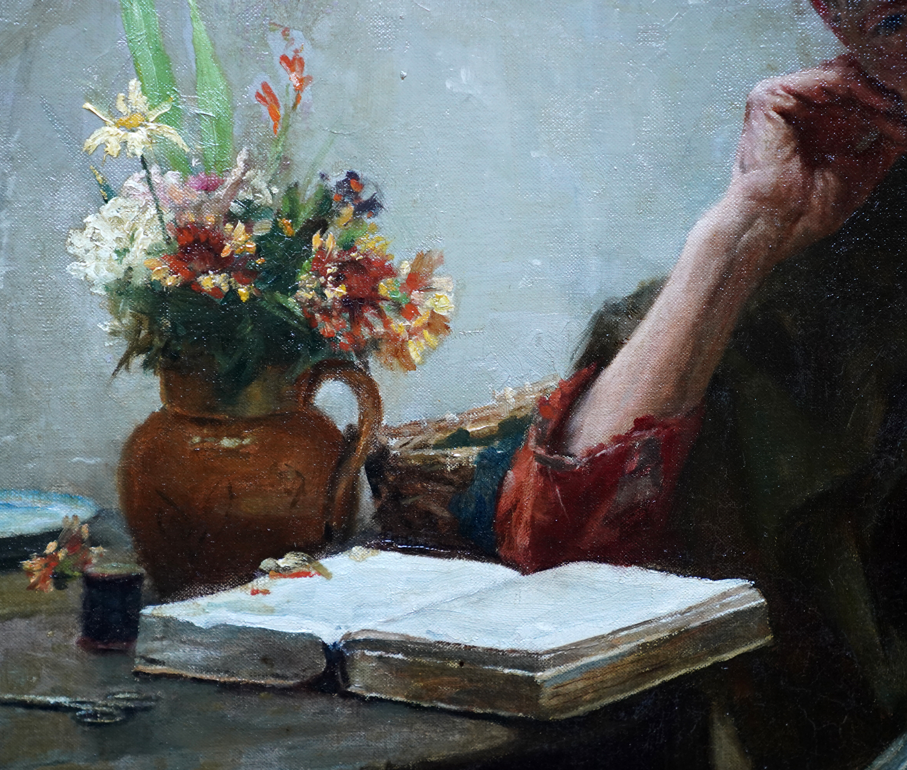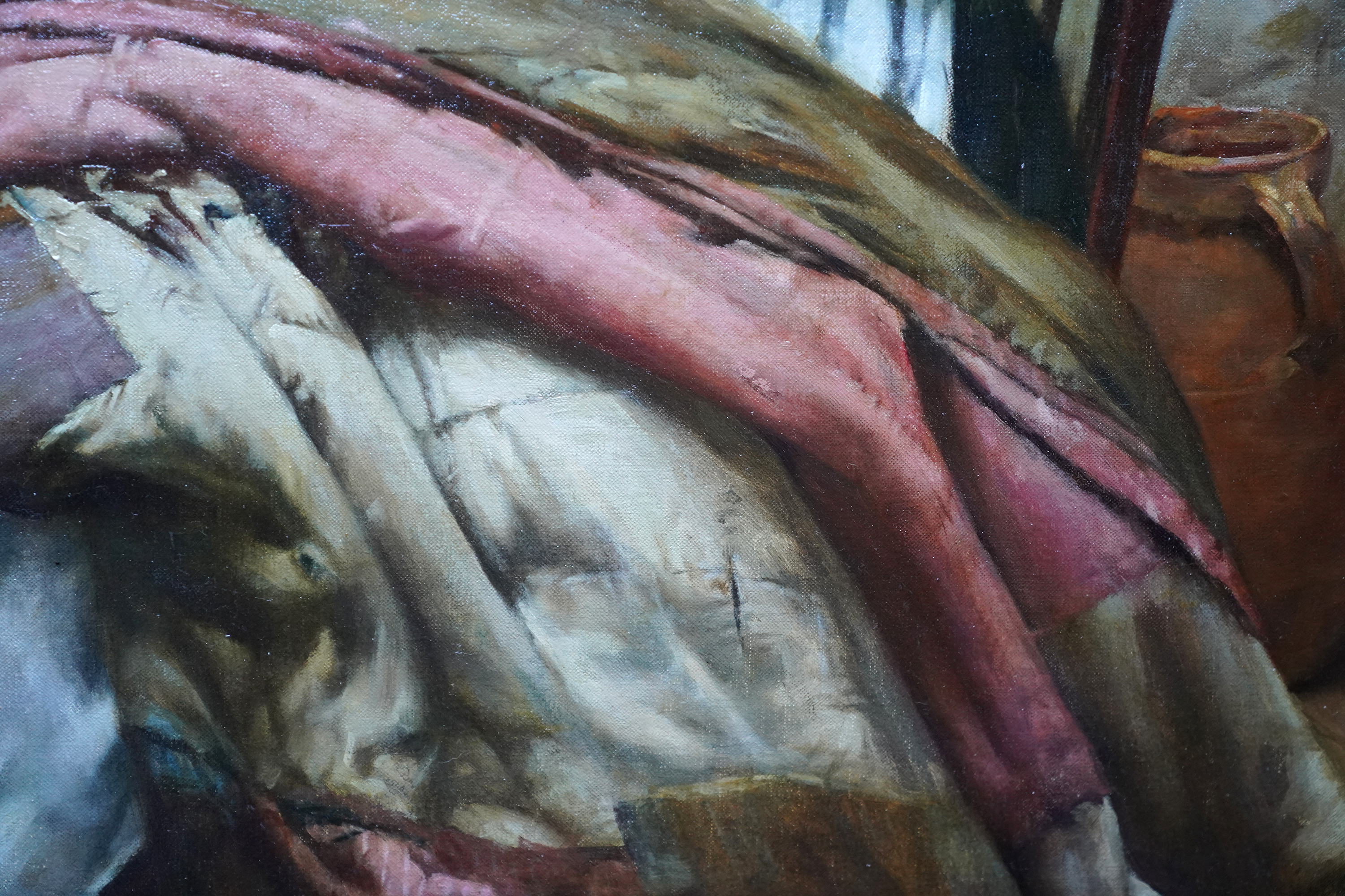 | Description | This stunning, large British Edwardian Newlyn School interior portrait oil painting is by much noted and exhibited artist Walter Langley. Originally from Birmingham, Langley and his family moved to St Ives in 1881. He was one of the first artists to settle and painted the local fishermen and their families. Painted in 1906 and entitled The Evening of Life, the painting is a full length seated portrait of an elderly lady in a cottage interior. She is sat by a table on which she has a bible, jug of flowers and her sewing equipment. Across her lap she has a large patchwork quilt to mend but is lost in thought. In fact the same sitter and quilt can be seen in Memories, also painted in 1906 and in the Ferens Art Gallery, Hull. Memories includes more of the cottage interior but the sitter's head is bowed towards her hands. The Evening of Life is more vibrant and the sitters face is much more visible as are the lovely colours of the quilt. The painting has fantastic detail, great brushwork and the Newlyn school palette of colours. The provenance is excellent, having been kept in the same family ownership so fresh to market. The painting appeared in the artist's catalogue Raisonne and was also in 1997 biography by Langely's grandson, Roger Langley, entitled Walter Langley: Pioneer of the Newlyn Art Colony. This a superb example of Langley's work, a good size and composition and a pleasure to gaze upon. Signed lower left and dated (19)06. |