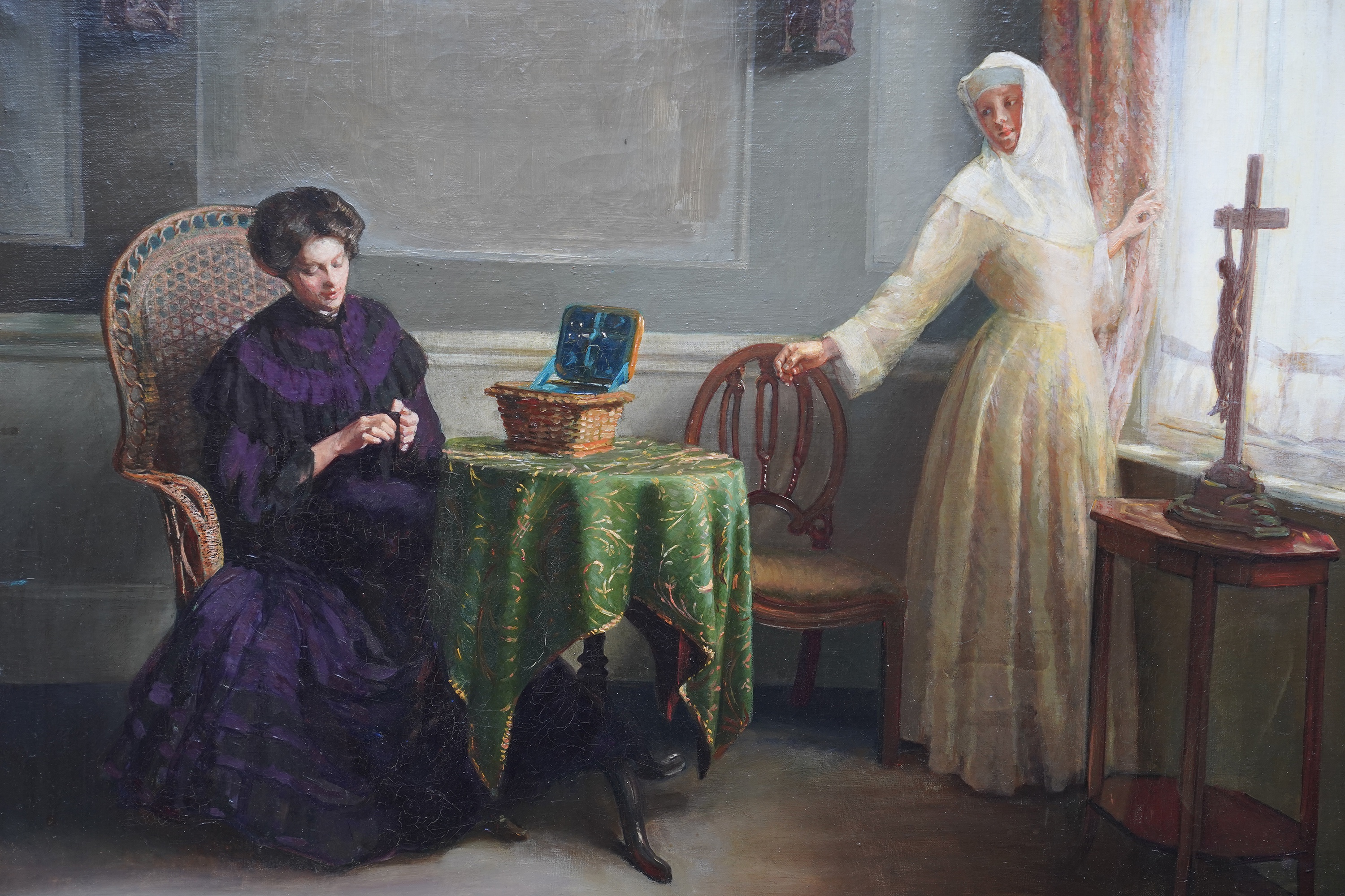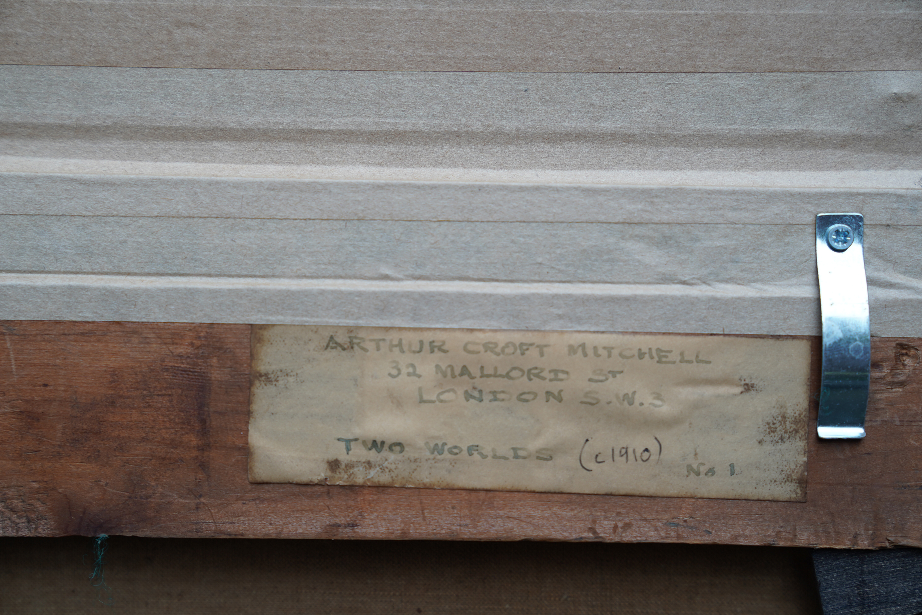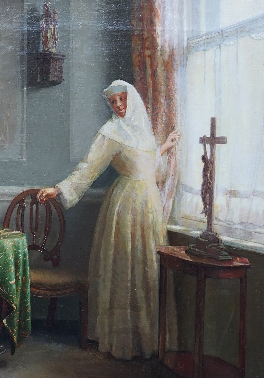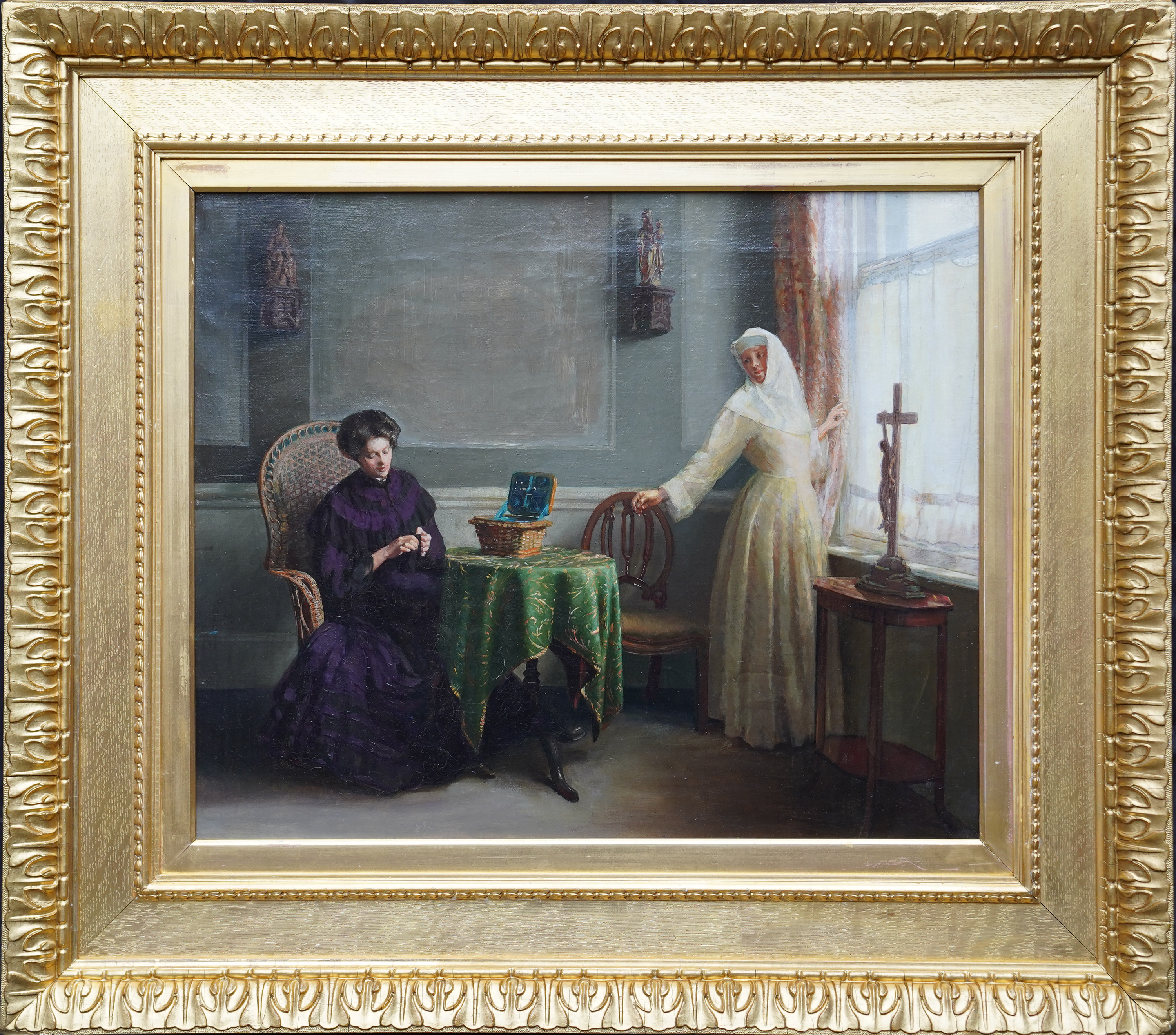 | Description | This intriguing British Edwardian figurative interior oil painting is by noted artist Arthur Croft Mitchell. It is entitled Two Worlds verso and dated as c1910. The composition of this conversation piece is two women in a room with three religious statues, suggesting it is a religious setting. The older woman, dressed in black and purple, is sat at a table sewing. The younger woman is stood at a sunny window, but turning back into the room, her arm outstretched as if encouraging her mother to come to the window and the light. She is wearing the white headdress of a novice nun over a pale yellow floral dress. There is indeed an interesting story going on in this painting. The colours are vibrant, the details superb and the use of light sublime. This is an excellent example of Mitchell's work and of Edwardian British art. Inscribed label to back of stretcher. |