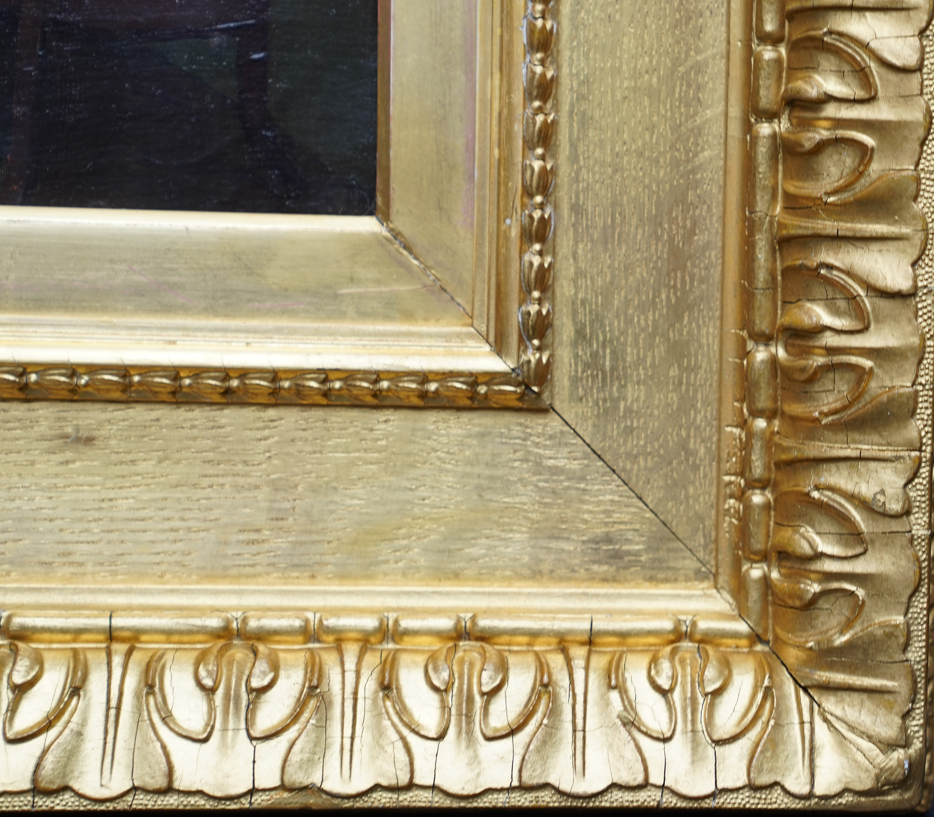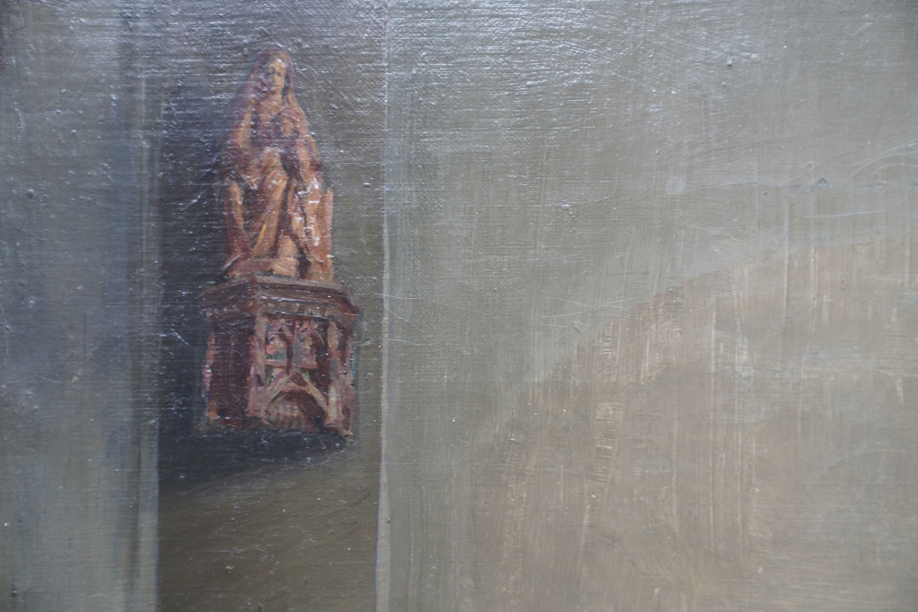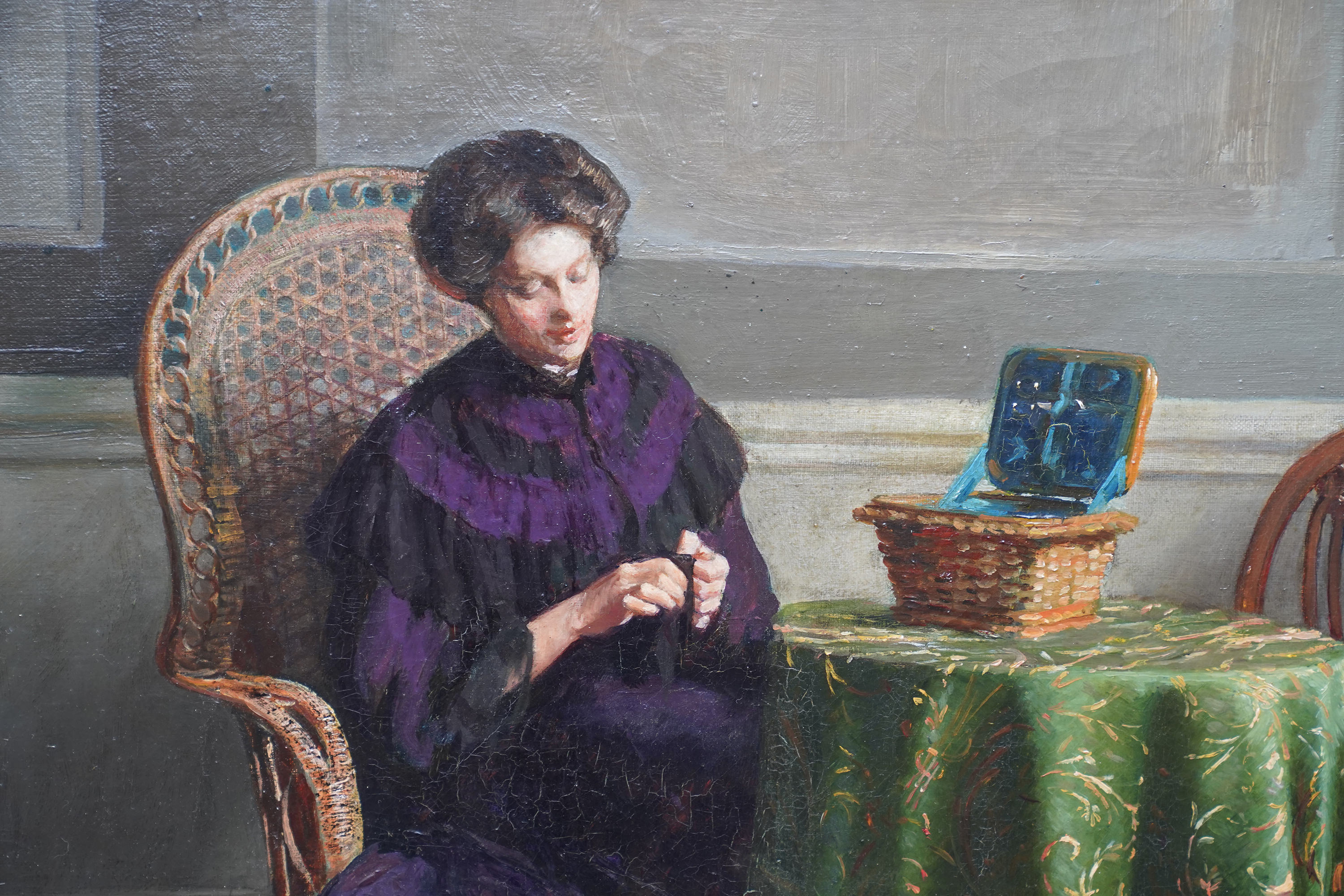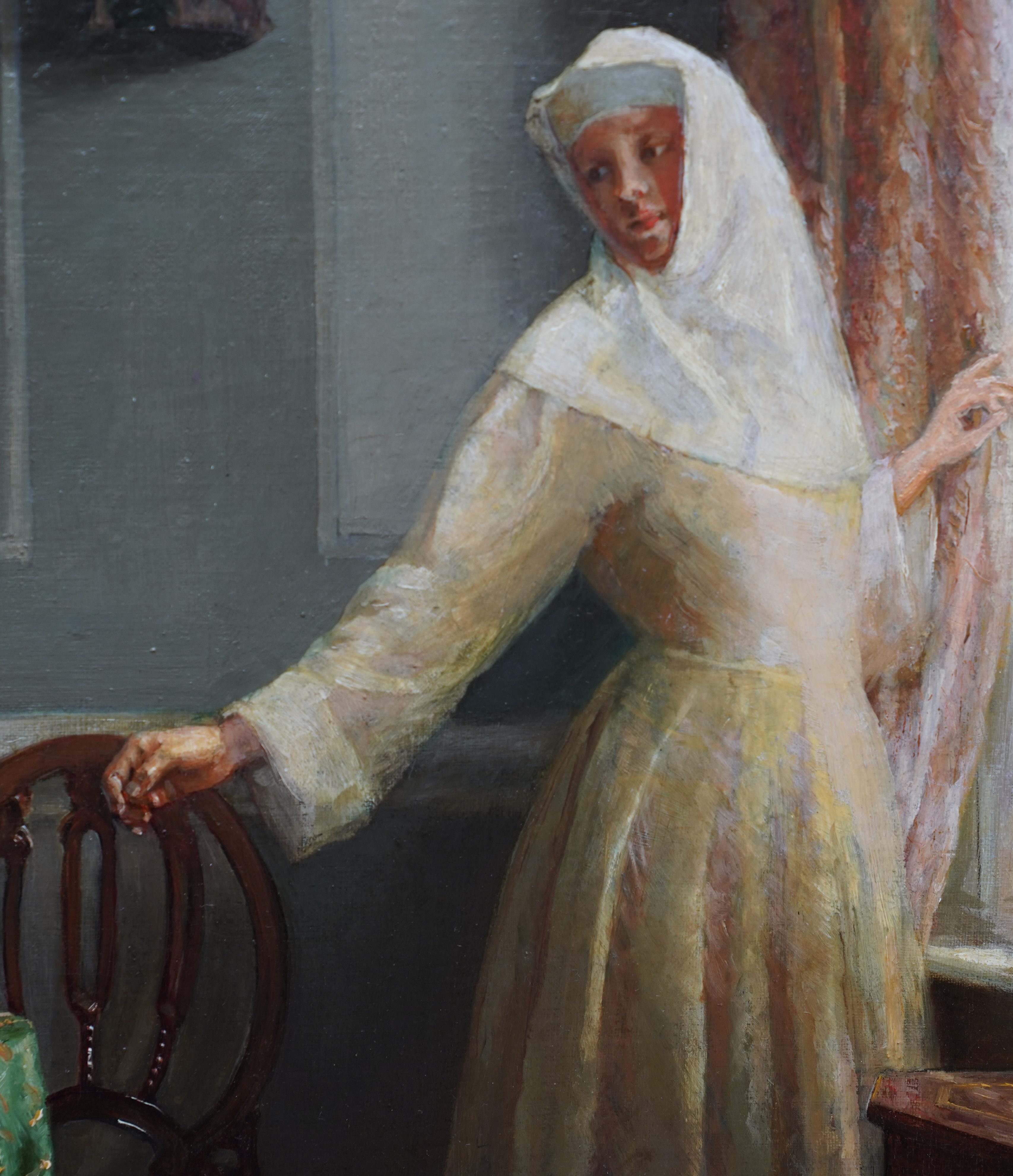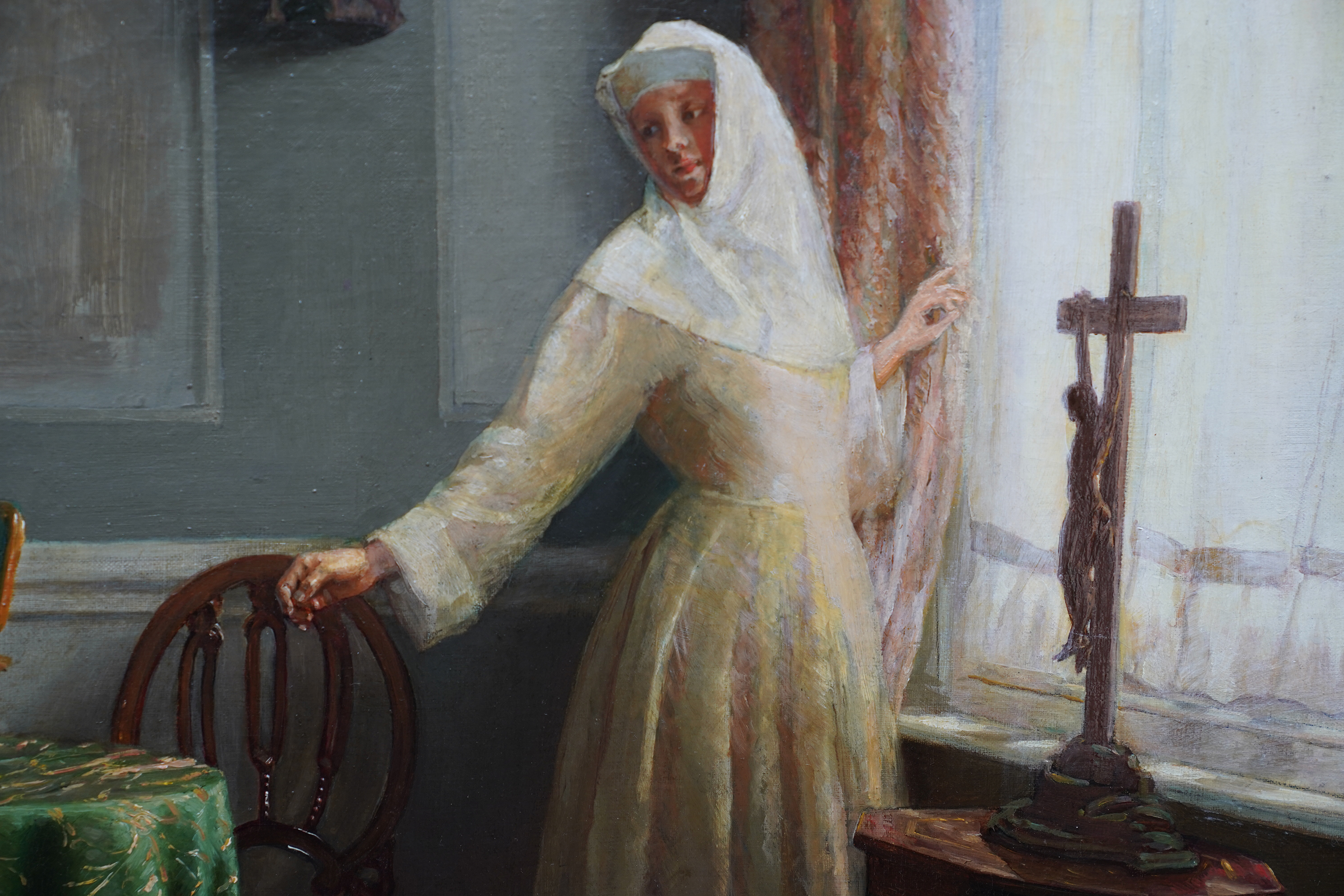 | Description | This intriguing British Edwardian figurative interior oil painting is by noted artist Arthur Croft Mitchell. It is entitled Two Worlds verso and dated as c1910. The composition of this conversation piece is two women in a room with three religious statues, suggesting it is a religious setting. The older woman, dressed in black and purple, is sat at a table sewing. The younger woman is stood at a sunny window, but turning back into the room, her arm outstretched as if encouraging her mother to come to the window and the light. She is wearing the white headdress of a novice nun over a pale yellow floral dress. There is indeed an interesting story going on in this painting. The colours are vibrant, the details superb and the use of light sublime. This is an excellent example of Mitchell's work and of Edwardian British art. Inscribed label to back of stretcher. |