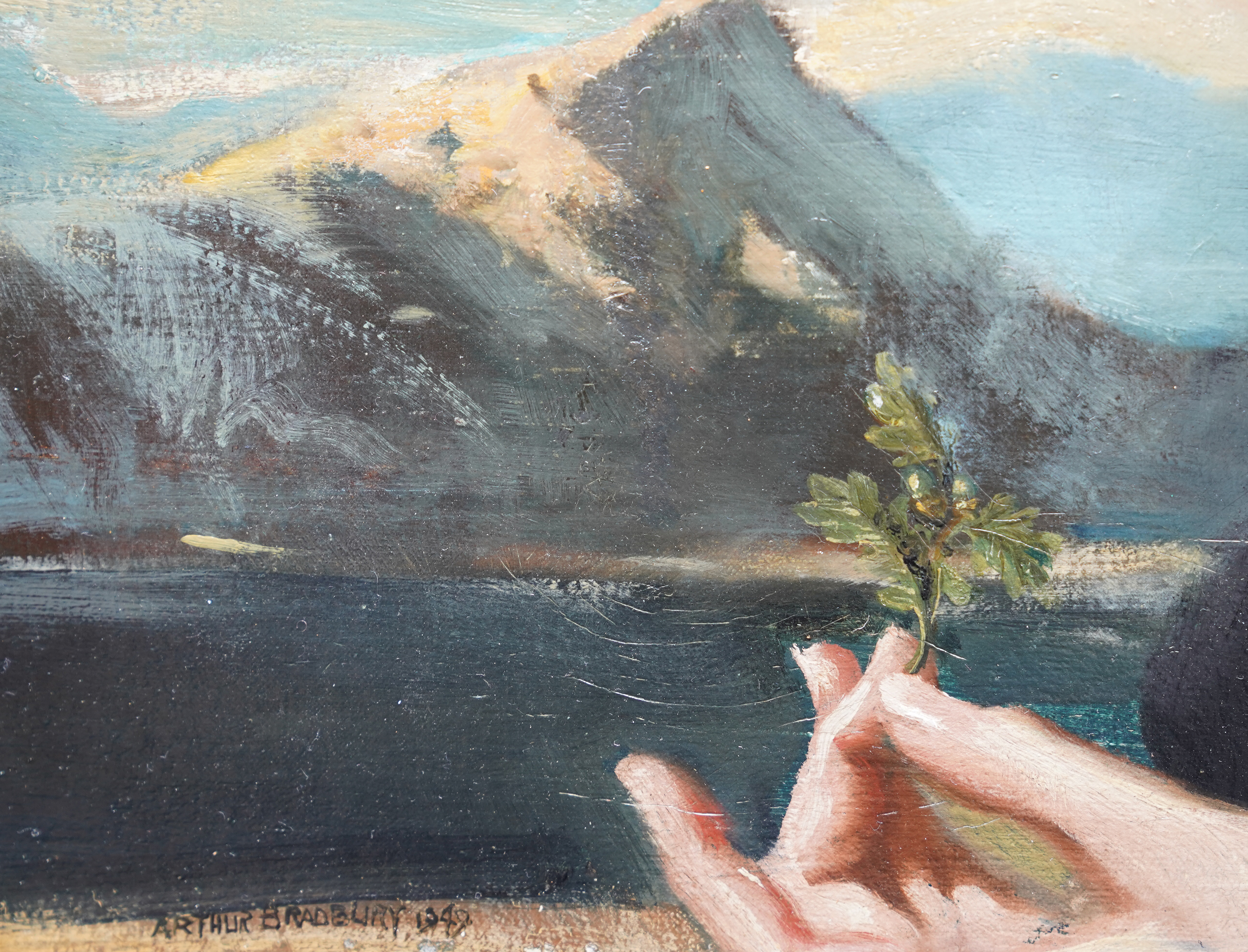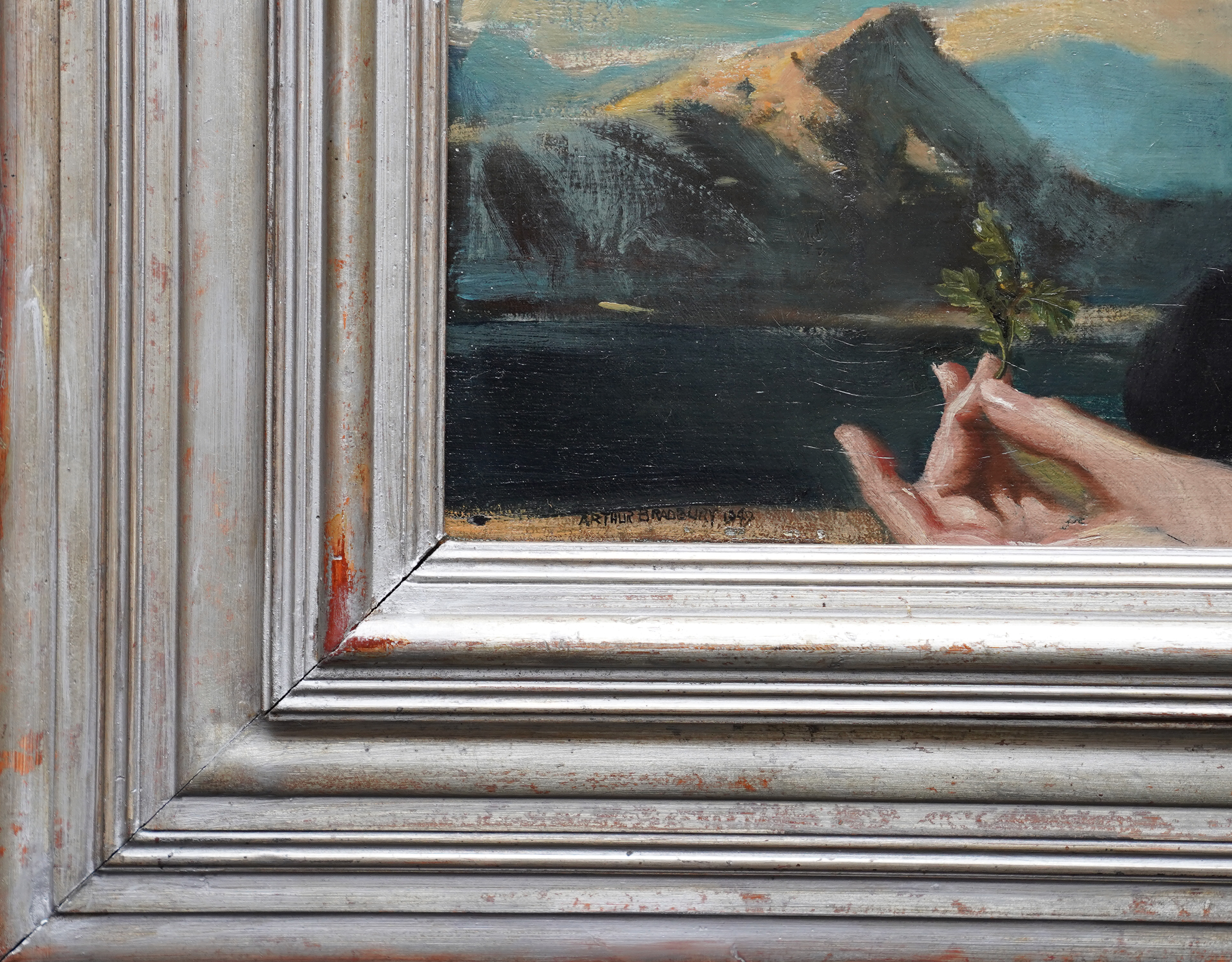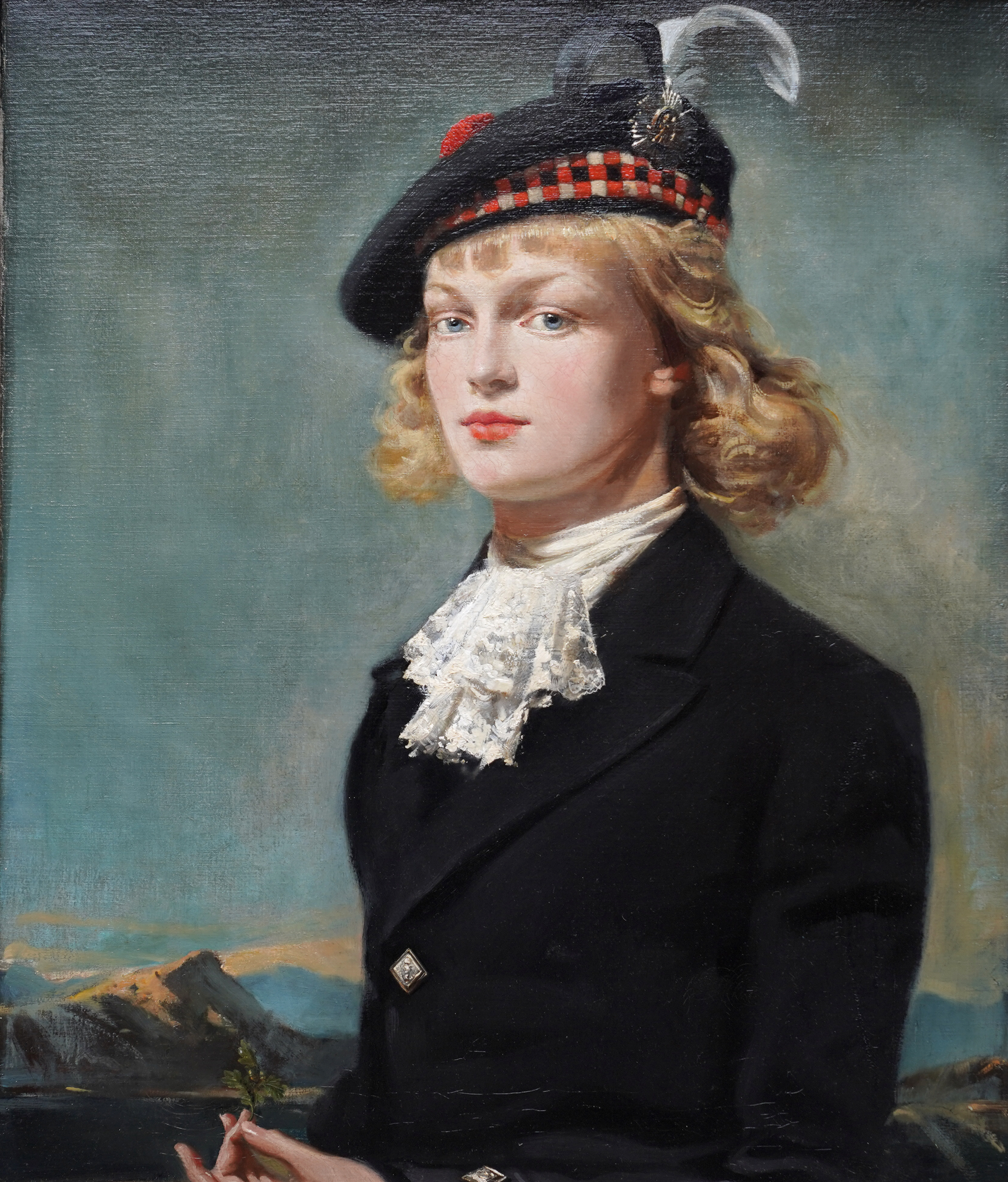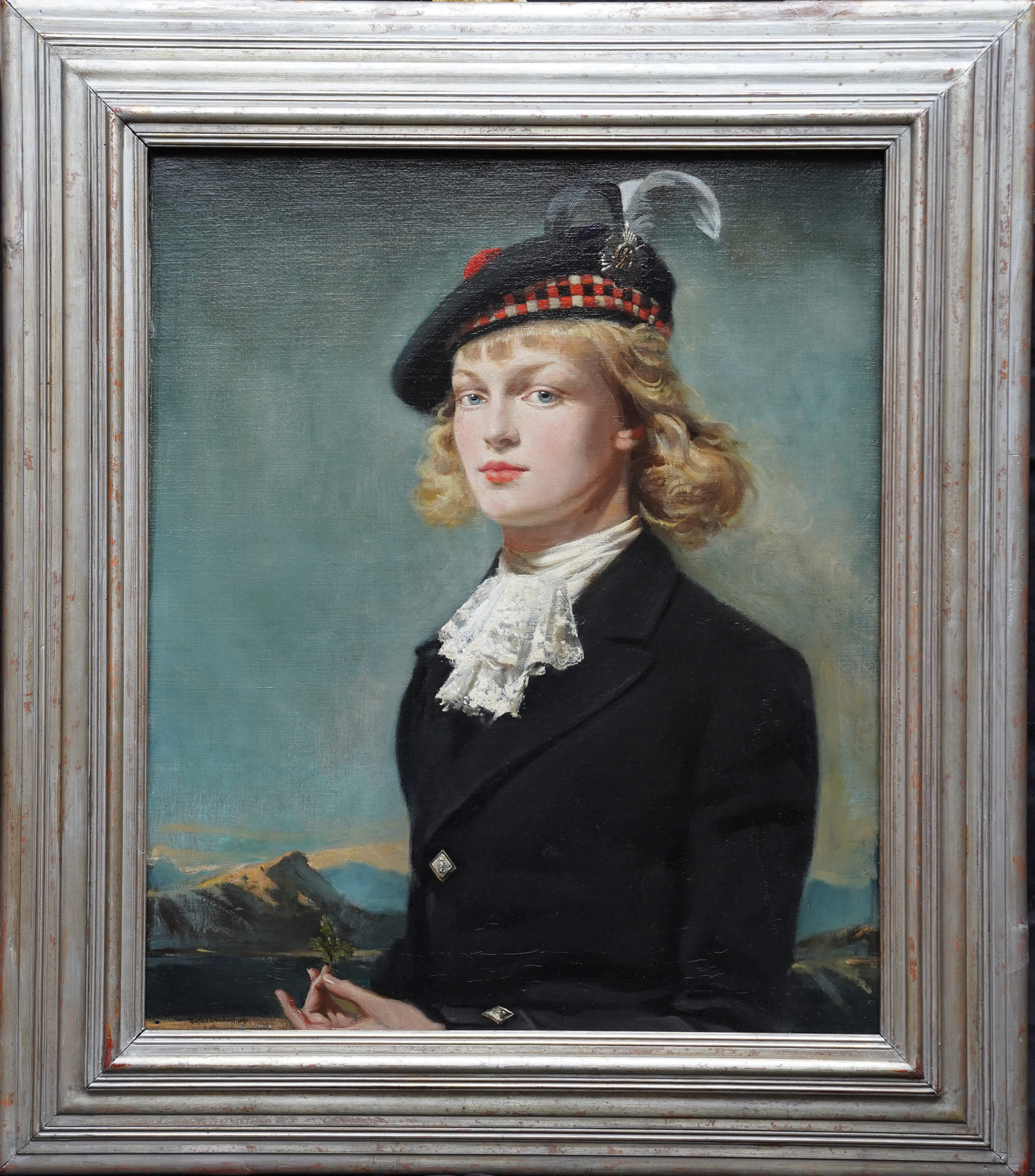 | Description | This impressive British 1940's portrait oil painting is by noted artist Arthur Royce Bradbury. Painted in 1949 it is a half-length portrait of a young Scottish girl in a mountainous landscape. The low vantage point really emphasises her portrait with the mountains in the low distance. She is wearing a black coat with a lace scarf at her neck and a Glengarry hat. The Glengarry Hat is much more than a piece of clothing; it stands as a profound symbol of Scottish heritage. Proudly worn across generations, this iconic hat has become an emblem of tradition. The Ceremonial Glengarry Hat carries rich stories of the past, connecting wearers to their ancestors and the essence of Scotland itself. Her hat is decorated with black and white feathers and an emblem or badge. Her blonde hair is blowing in the breeze and she is gazing at the artist/viewer in a slightly profile position. In her left hand she is holding an oak leaf and acorn, signifying growth and strength. The detail in her face and blonde hair against the sky is just superb. This is a very impressive painting and an excellent example of Bradbury at his best and comparable to Gerald Leslie Brockhurst in his use of landscape as a backdrop which stems from Renaissance religious portraiture. Signed and dated '1949' lower left. |