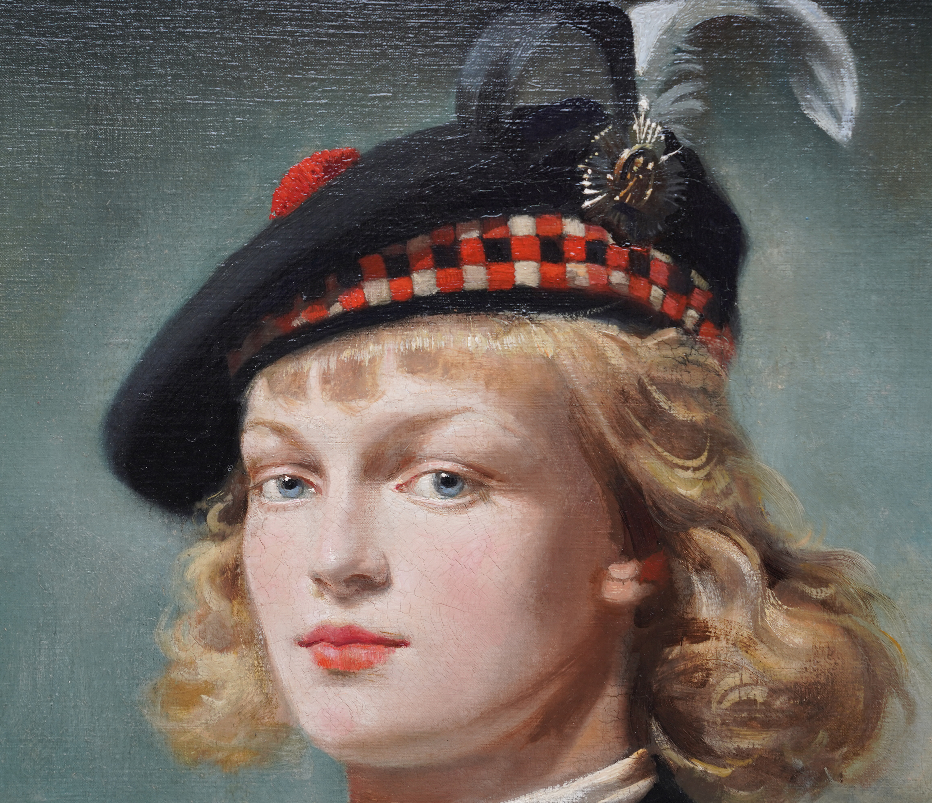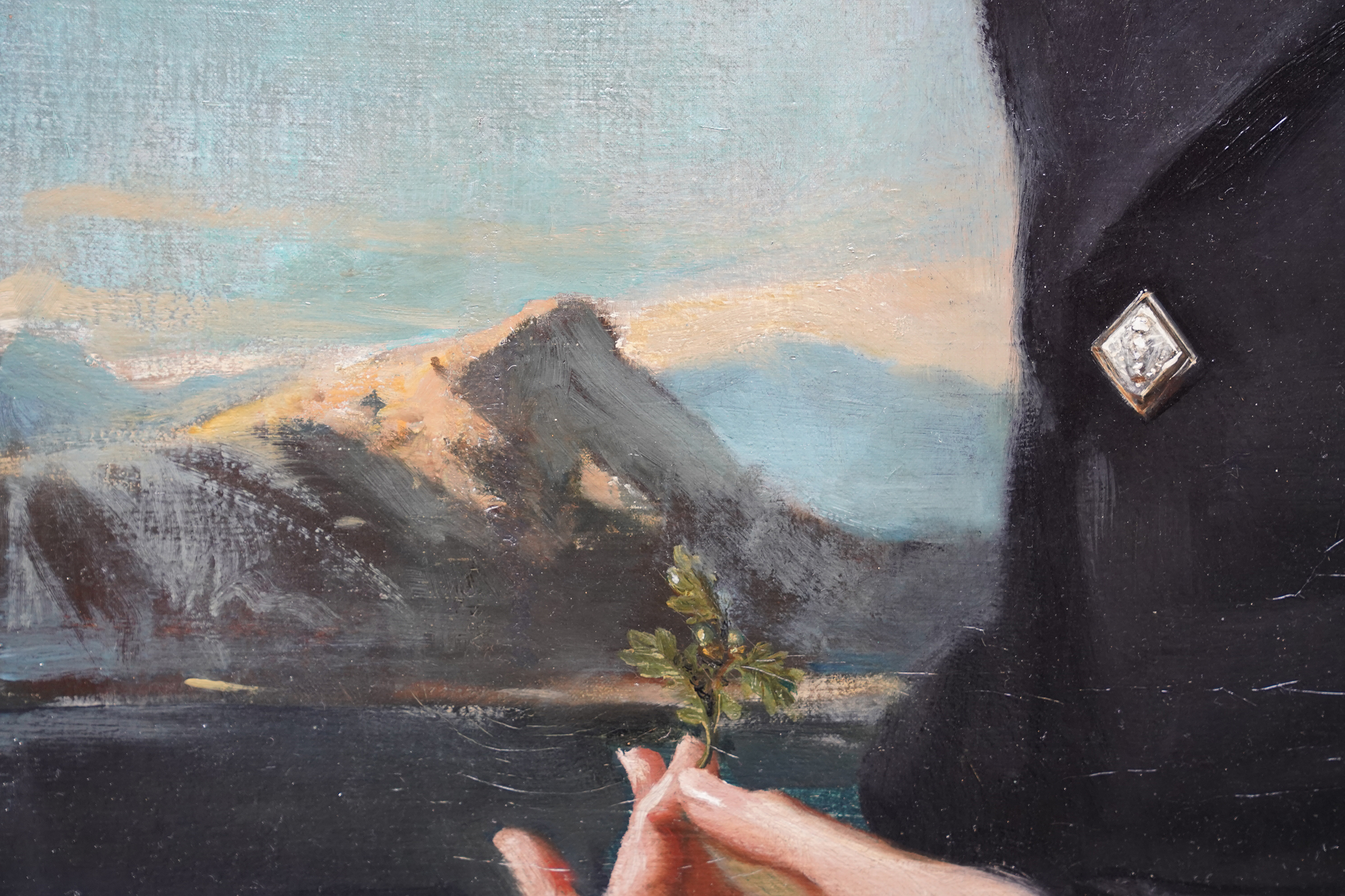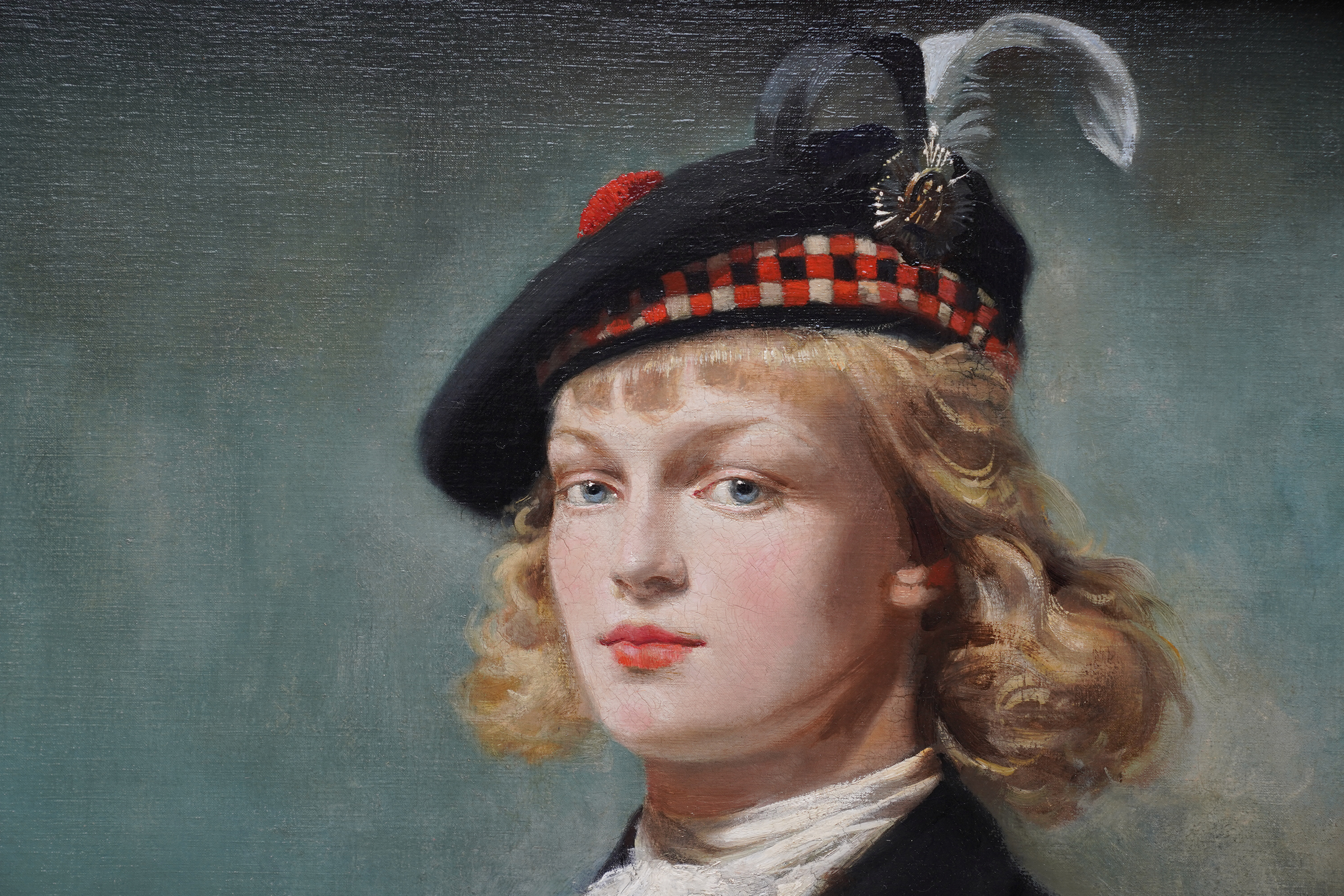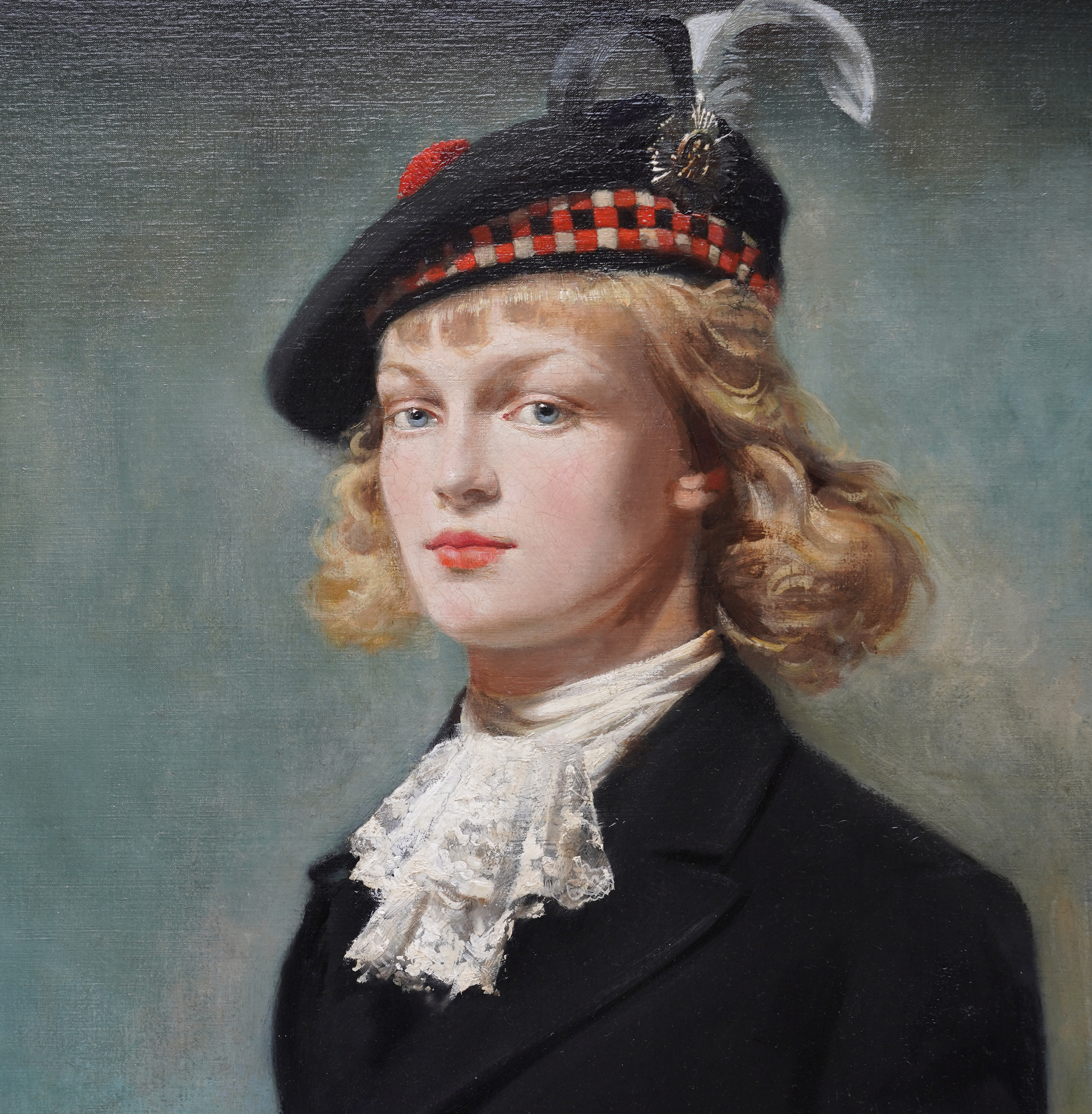 | Description | This impressive British 1940's portrait oil painting is by noted artist Arthur Royce Bradbury. Painted in 1949 it is a half-length portrait of a young Scottish girl in a mountainous landscape. The low vantage point really emphasises her portrait with the mountains in the low distance. She is wearing a black coat with a lace scarf at her neck and a Glengarry hat. The Glengarry Hat is much more than a piece of clothing; it stands as a profound symbol of Scottish heritage. Proudly worn across generations, this iconic hat has become an emblem of tradition. The Ceremonial Glengarry Hat carries rich stories of the past, connecting wearers to their ancestors and the essence of Scotland itself. Her hat is decorated with black and white feathers and an emblem or badge. Her blonde hair is blowing in the breeze and she is gazing at the artist/viewer in a slightly profile position. In her left hand she is holding an oak leaf and acorn, signifying growth and strength. The detail in her face and blonde hair against the sky is just superb. This is a very impressive painting and an excellent example of Bradbury at his best and comparable to Gerald Leslie Brockhurst in his use of landscape as a backdrop which stems from Renaissance religious portraiture. Signed and dated '1949' lower left. |