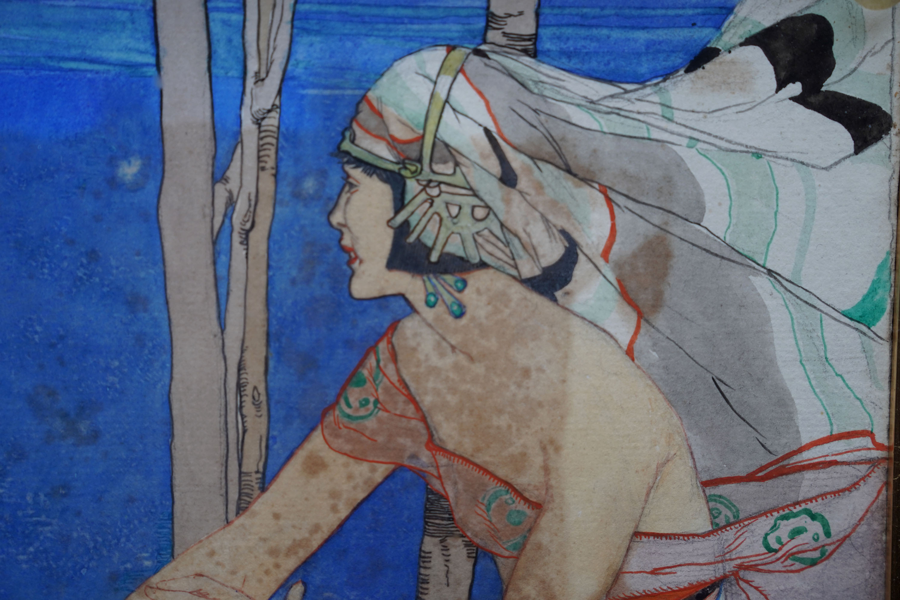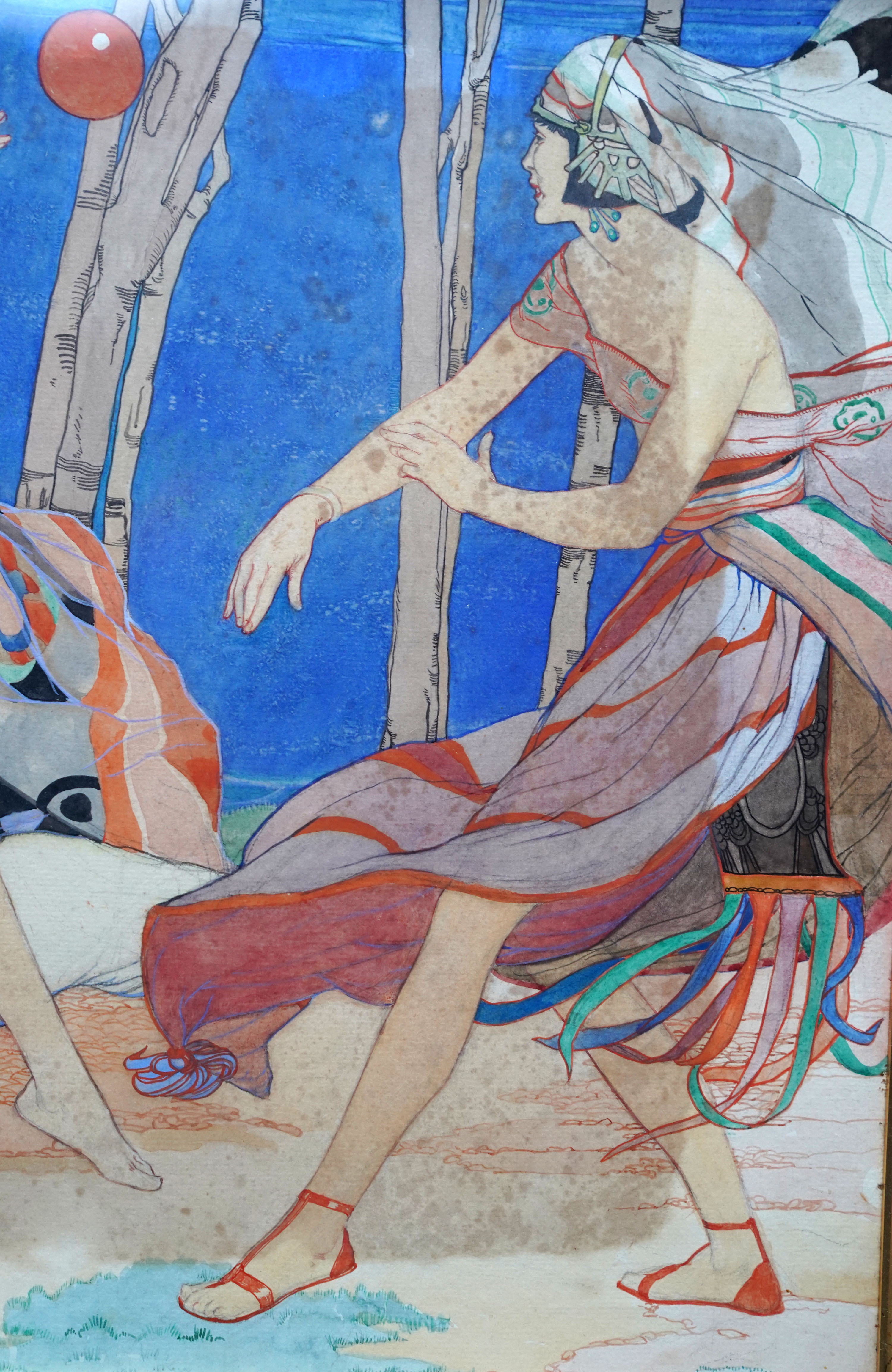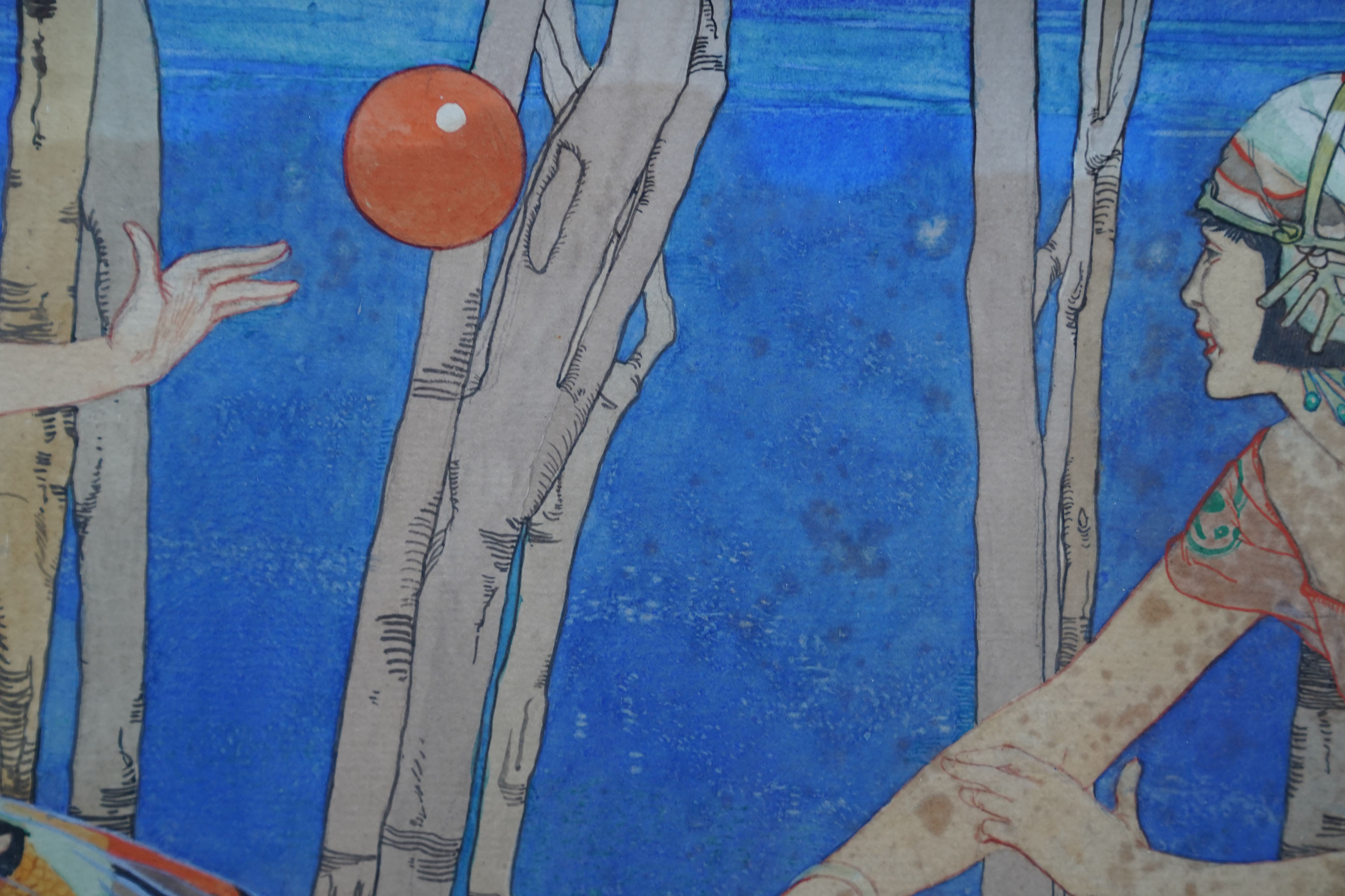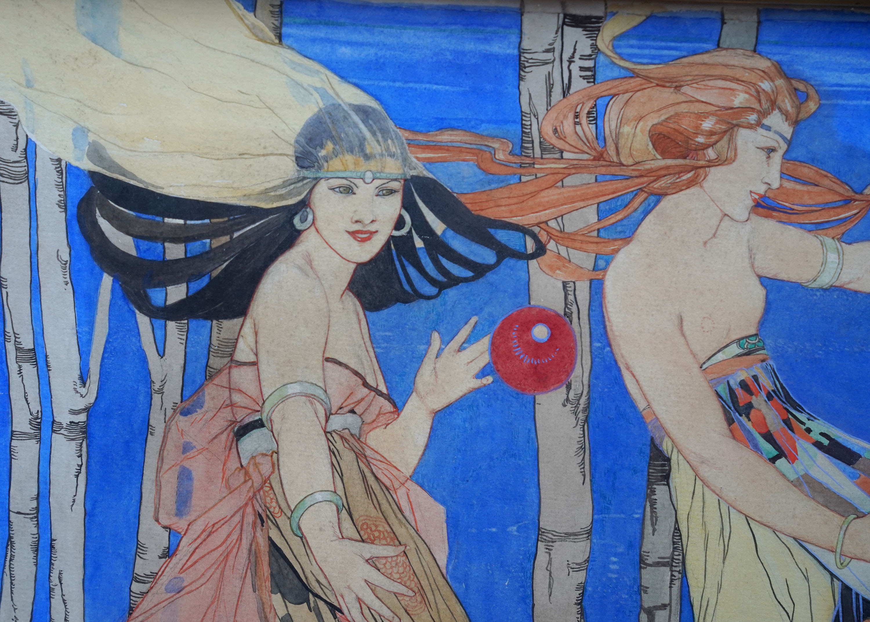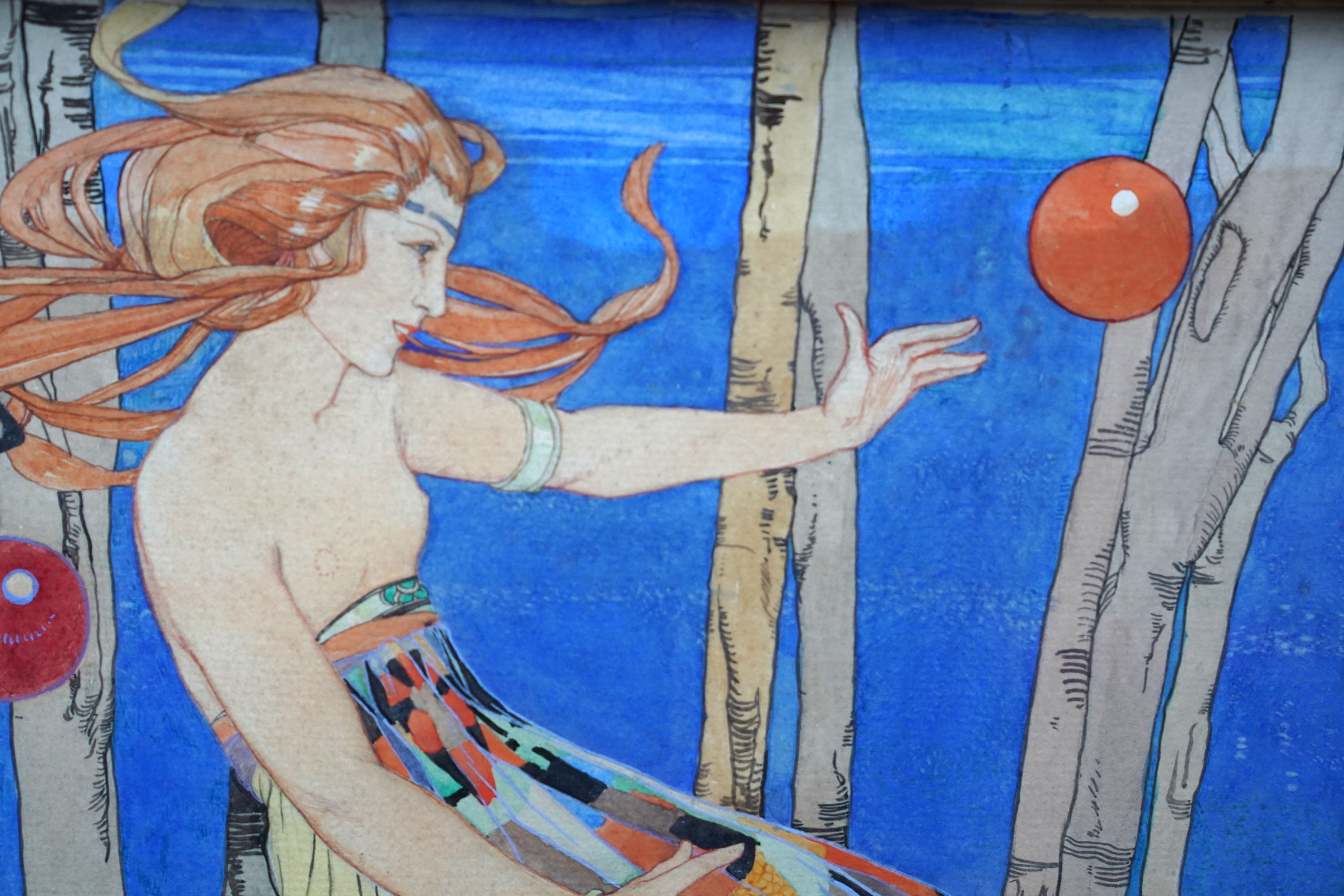 | Description | This beautiful British Art Deco 1930's water colour and ink painting on paper is by well respected artist Averil Mary Burleigh. Painted circa 1935 the composition is of three female figures with flowing robes and head dresses with slender tree trunks beyond them and vivid blue of the sky meeting the sea. (Caerula pertains to the colour of the sky and sea). They are playing between them with two balls or globes. A beautiful painting full of fun and movement and that amazing blue. Signed lower left, and inscribed on a label verso. |