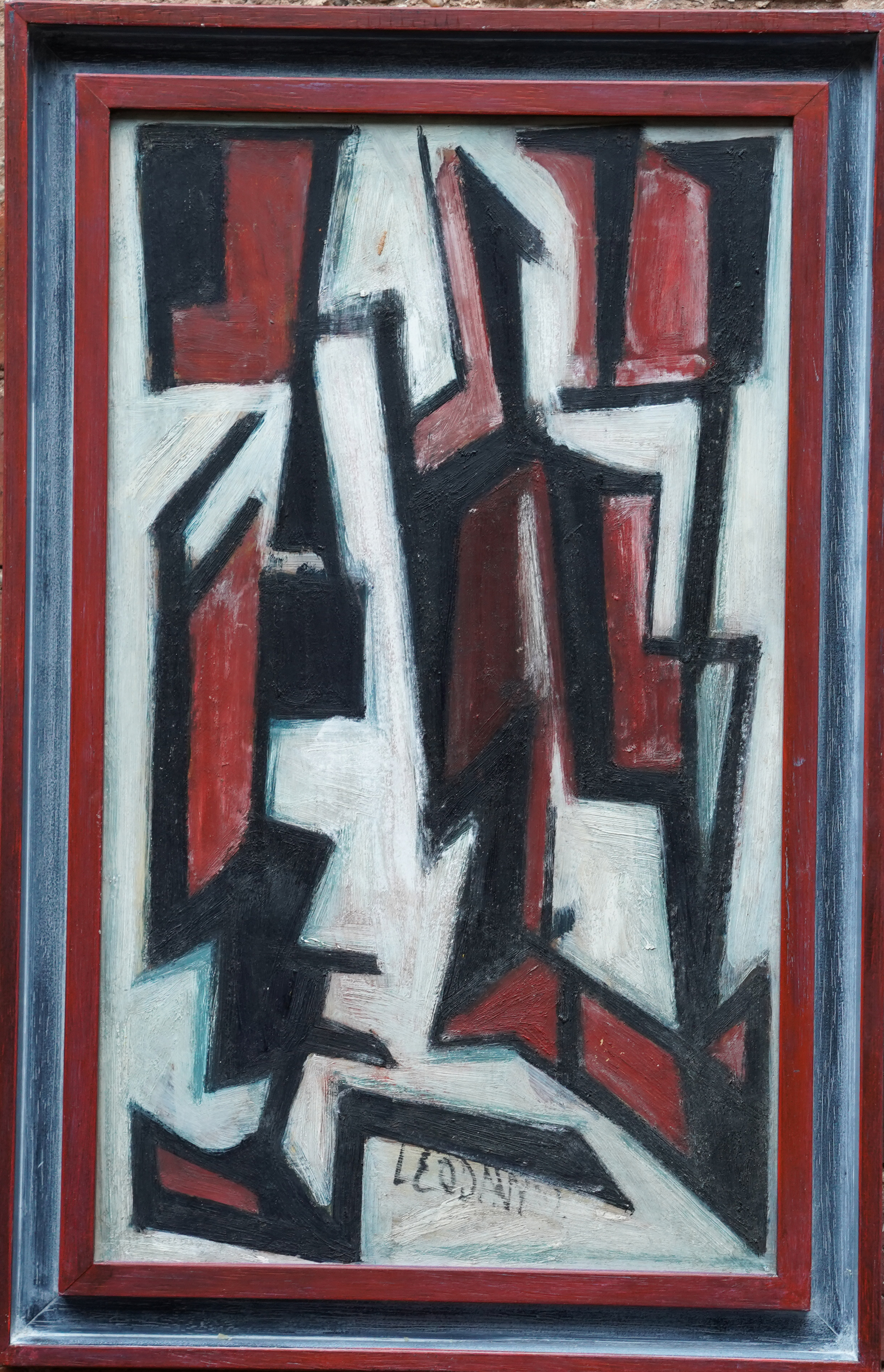 Description  This superb British 1950's abstract oil on board painting is by noted Slade School trained contemporary artist Leo Davy. Davy was born in Yorkshire but settled in Cornwall in 1968 and the influence of the Cornish landscape can be seen in his work. He rarely exhibited and largely shunned the art world, indeed preferring to not even make a living from his art, working as a tool maker, framer and gilder and even as a tomato picker. His deafness further took him into his own world and he communicated best through his art. This superb abstract oil on board painting is entitled Seated Figure III verso and dates to 1952. The oblong composition has black and red forms on a white background and is very pleasing to the eye. It is float mounted to great effect. This is a fantastic example of Davy's work and a great abstract fifties oil painting.