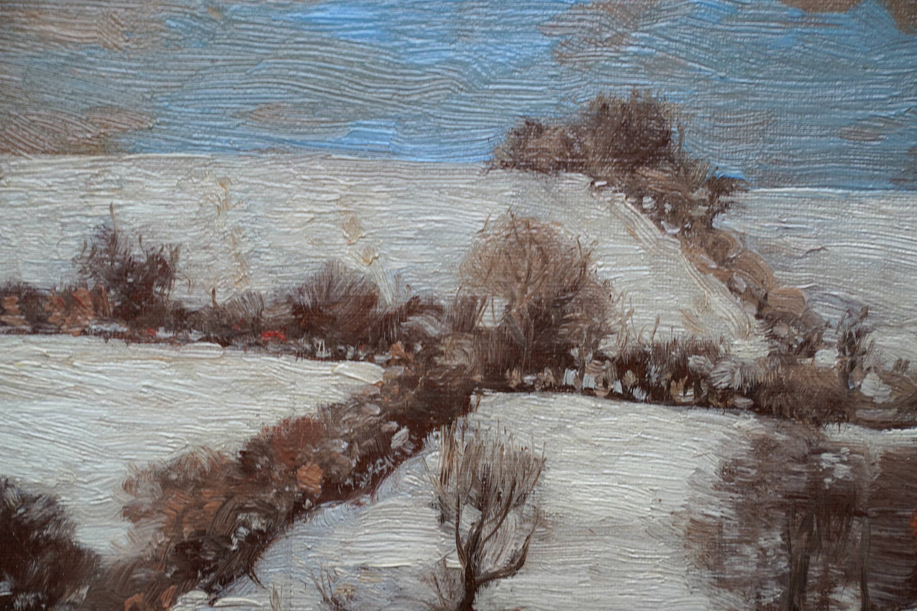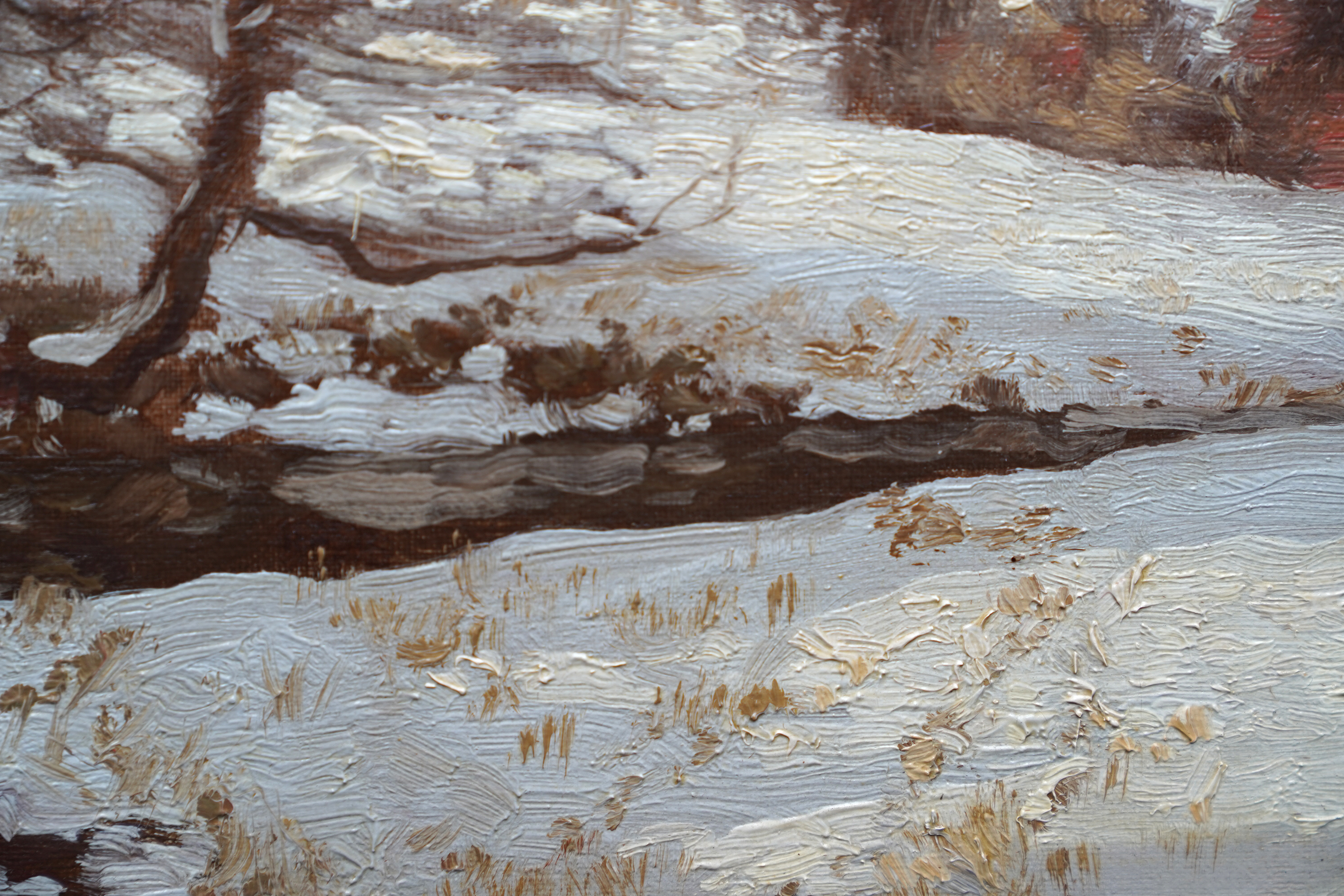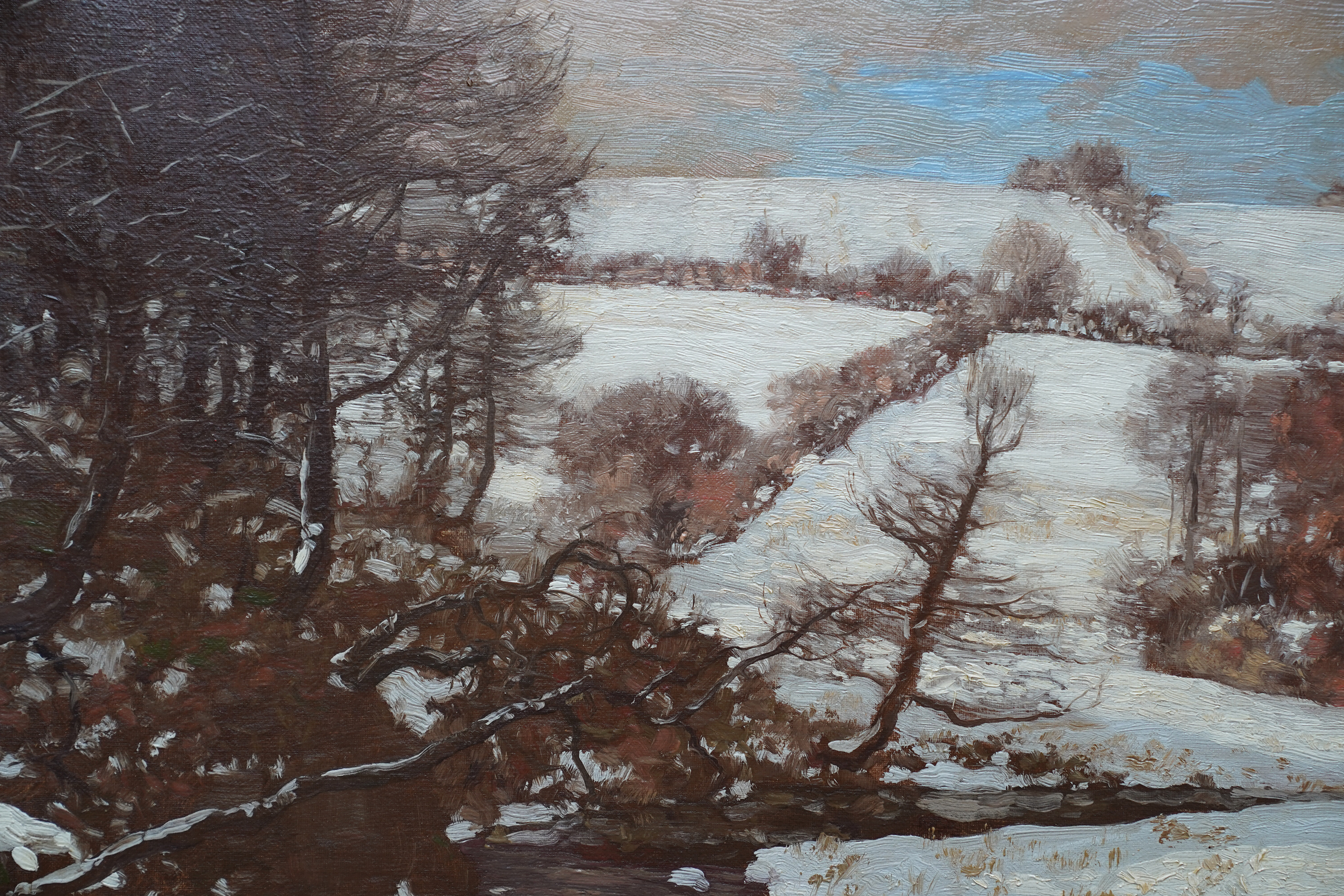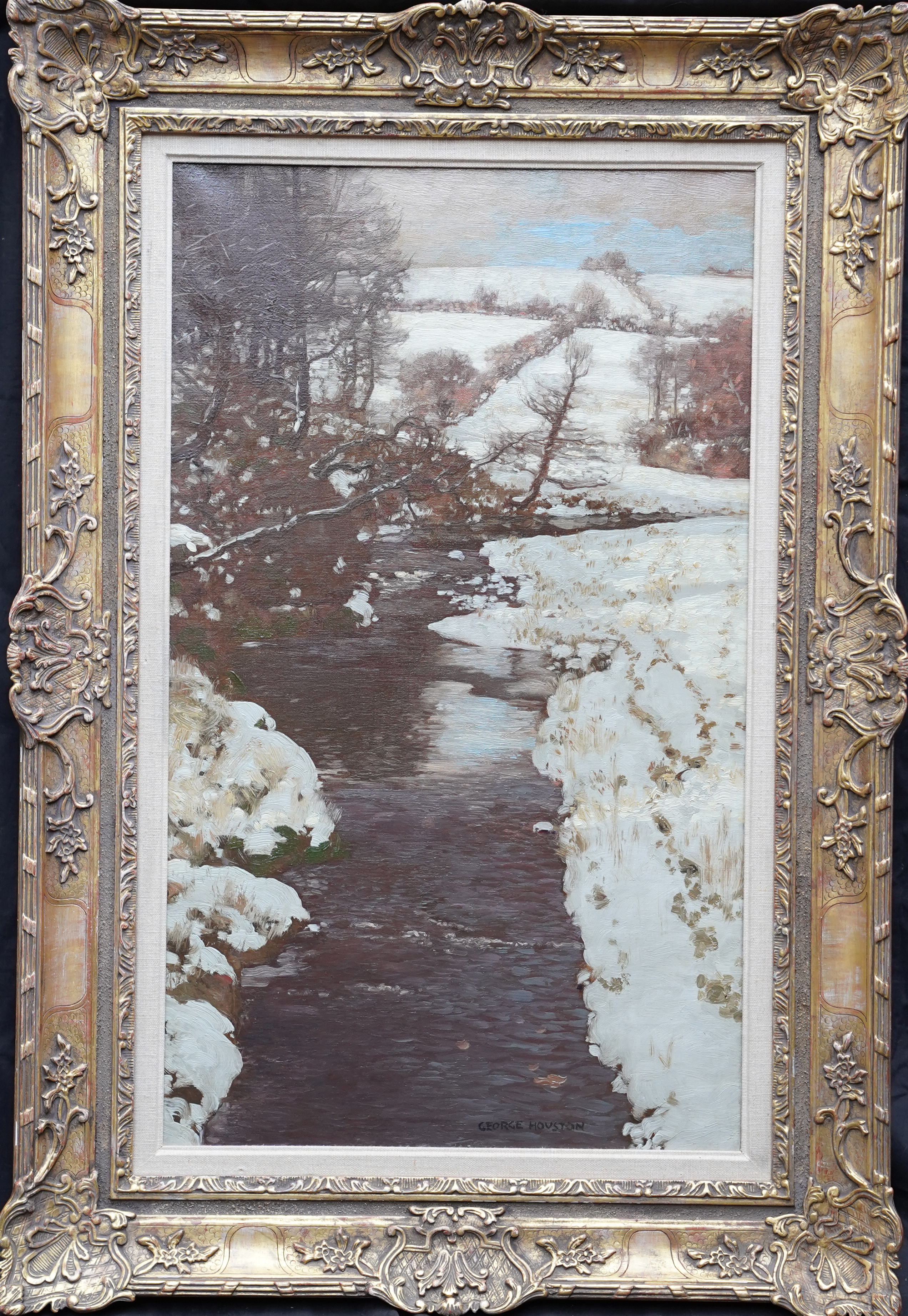 | Description | This gorgeous Edwardian Scottish oil painting is by noted Scottish artist George Houston. Painted circa 1910 and in portrait orientation, the composition is a winter's snowy landscape with a stream running vertically with a snowy field to the right and a wooded hill to the left. The viewer's eye is then drawn upwards to snowy hilly fields divided by hedges and trees with patches of blue sky on the horizon. There are footprints in the snow beside the stream, human and dog, but the landscape is quiet now. This is a beautiful winter painting with an amazing range of colours in the water and perfect depiction of the snow. The portrait orientation works well with the angle of the stream and is enhanced by a fabulous frame. An excellent example of Houston's work and of Scottish art. Signed lower right. |