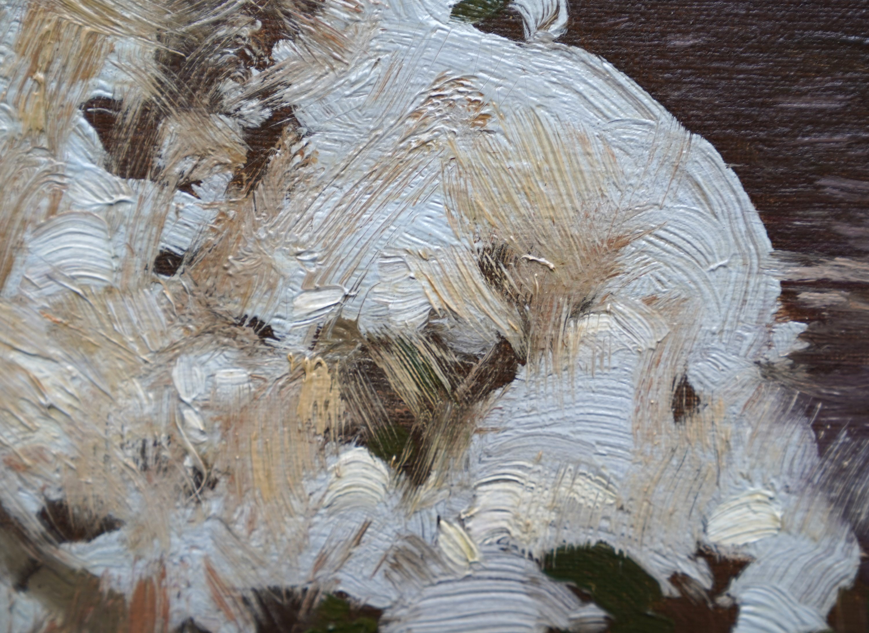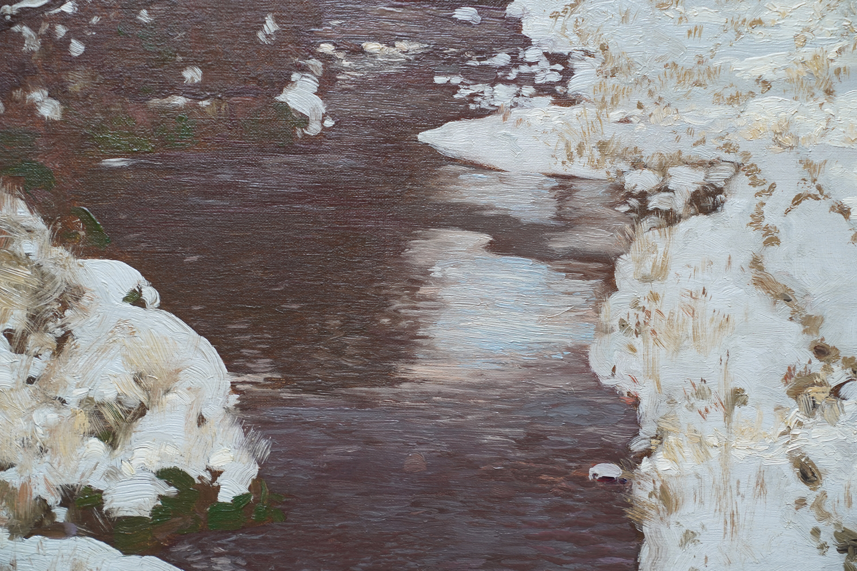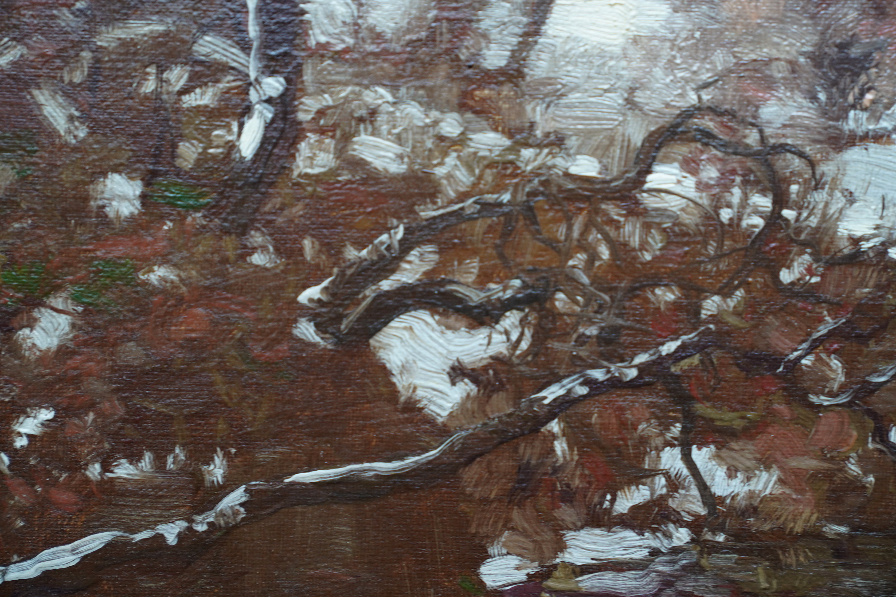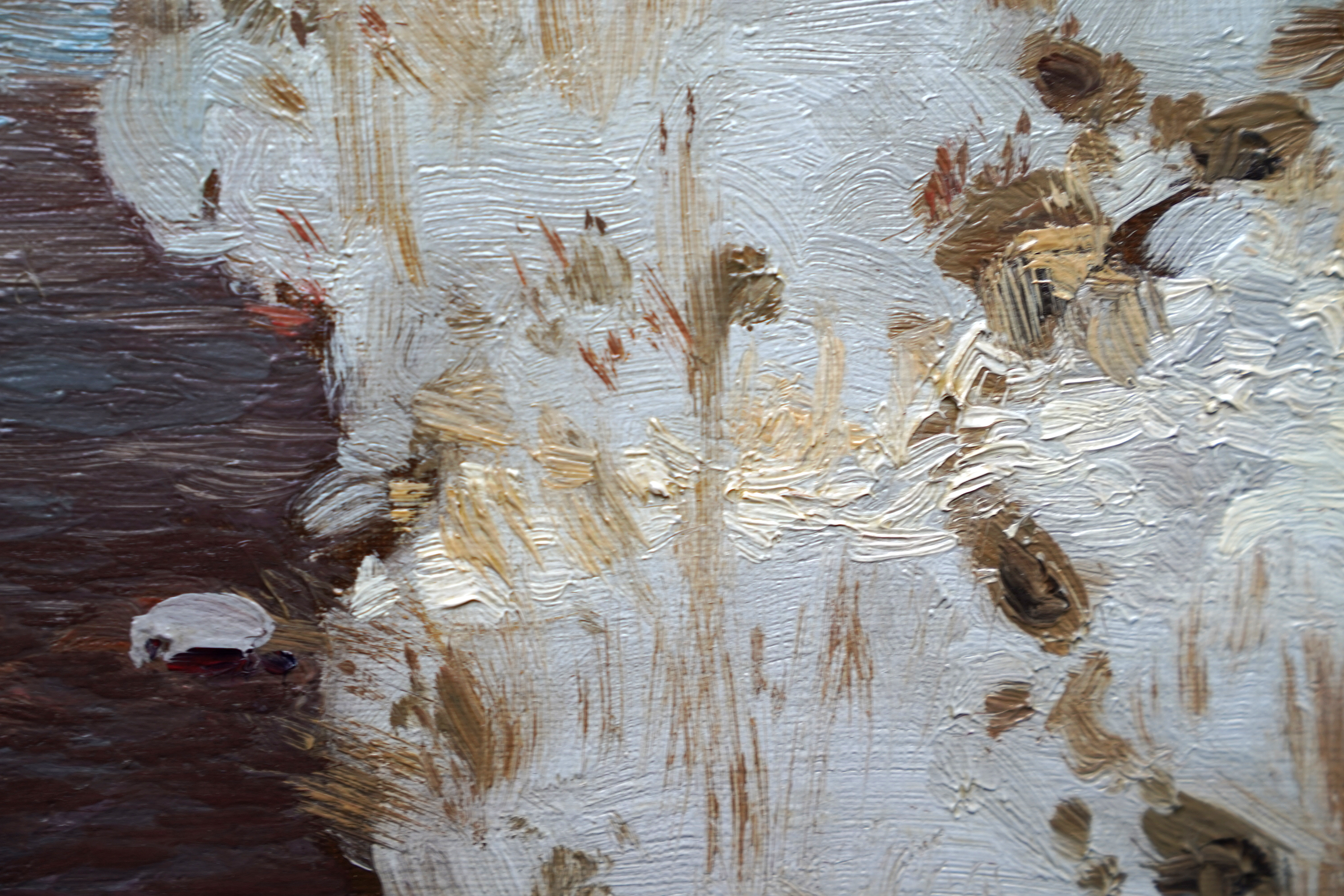 | Description | This gorgeous Edwardian Scottish oil painting is by noted Scottish artist George Houston. Painted circa 1910 and in portrait orientation, the composition is a winter's snowy landscape with a stream running vertically with a snowy field to the right and a wooded hill to the left. The viewer's eye is then drawn upwards to snowy hilly fields divided by hedges and trees with patches of blue sky on the horizon. There are footprints in the snow beside the stream, human and dog, but the landscape is quiet now. This is a beautiful winter painting with an amazing range of colours in the water and perfect depiction of the snow. The portrait orientation works well with the angle of the stream and is enhanced by a fabulous frame. An excellent example of Houston's work and of Scottish art. Signed lower right. |