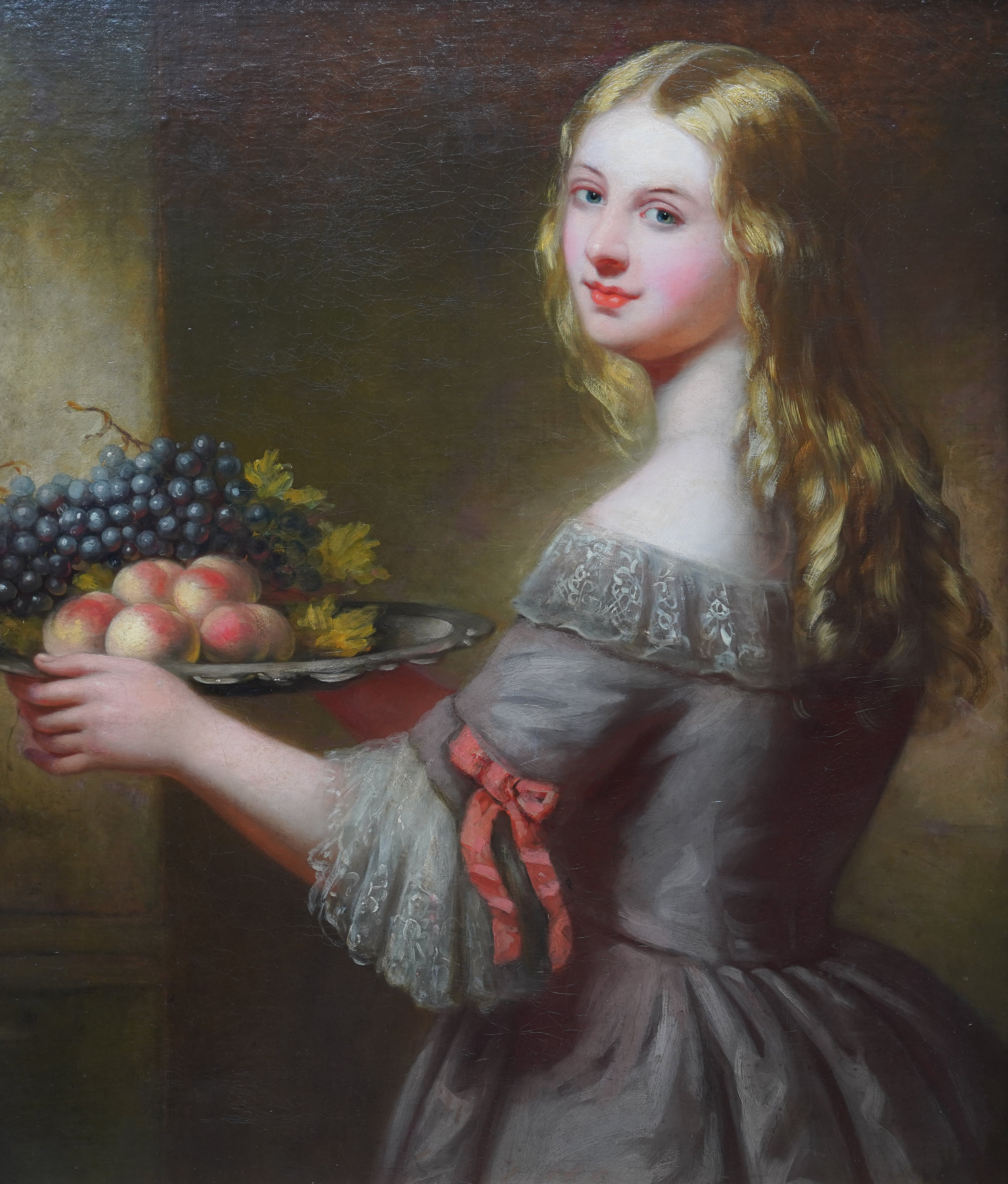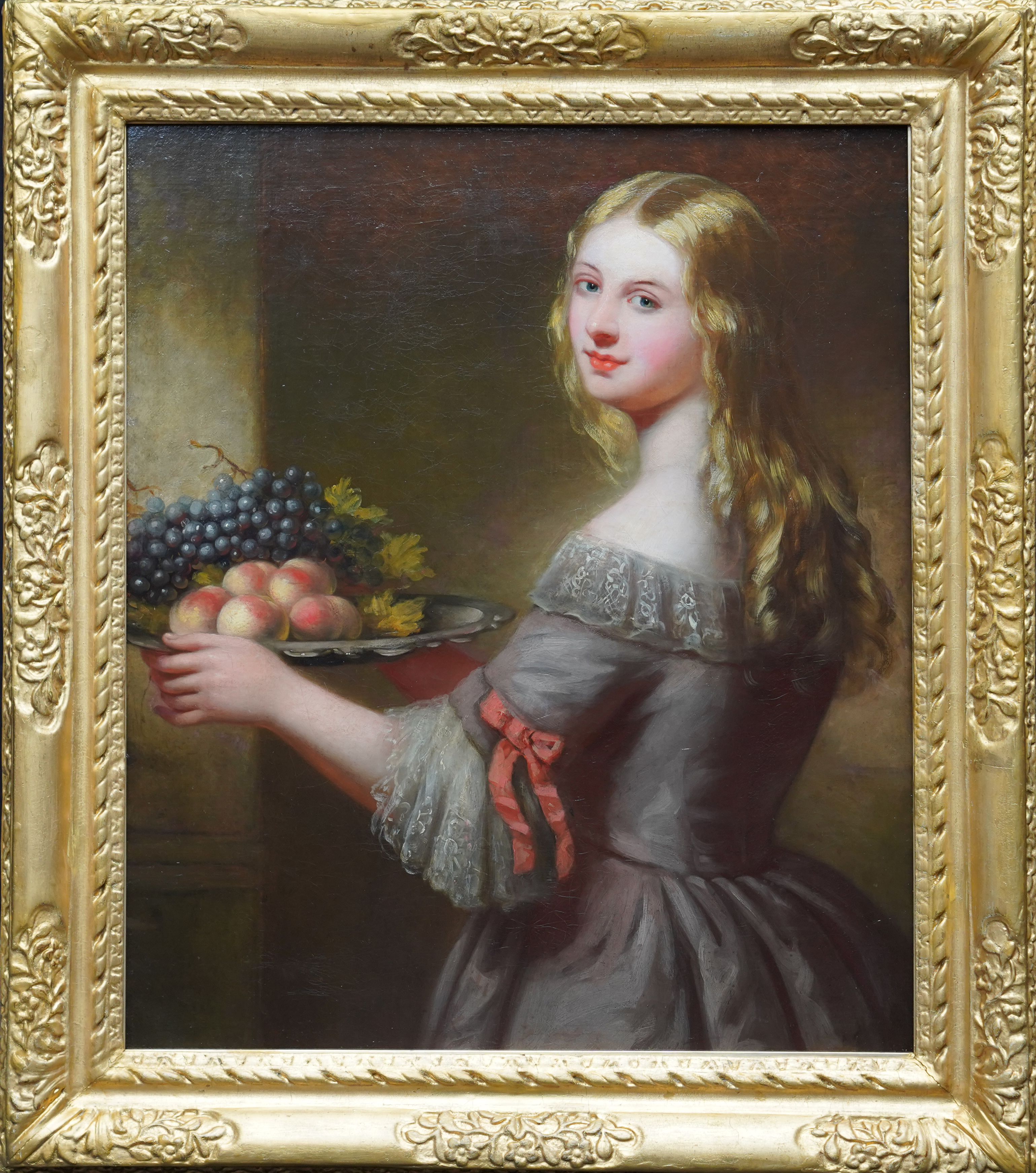 | Description | This lovely British 18th century portrait oil painting, with excellent provenance, is attributed to circle of George Henry Harlow. Painted circa 1760, it is a standing half length portrait of a young lady carrying a platter of fruit. Harlow frequently painted pretty young women in domestic situations rather than more formal Society portraits. The sitters would often be cooking, doing laundry, ironing, sewing etc. and often smiling at the artist/viewer as in this painting. The sitter is wearing a grey dress trimmed with lace and red bows on the sleeve. Her long blonde hair cascades down her back and she is turning to look back over her bare shoulder. The fruit platter of black grapes and peaches echo the colours of her dress and lips and the scene is beautifully illuminated. This is a charming British Old Master oil painting, housed in a pretty Lely panel ornate gilt frame. |