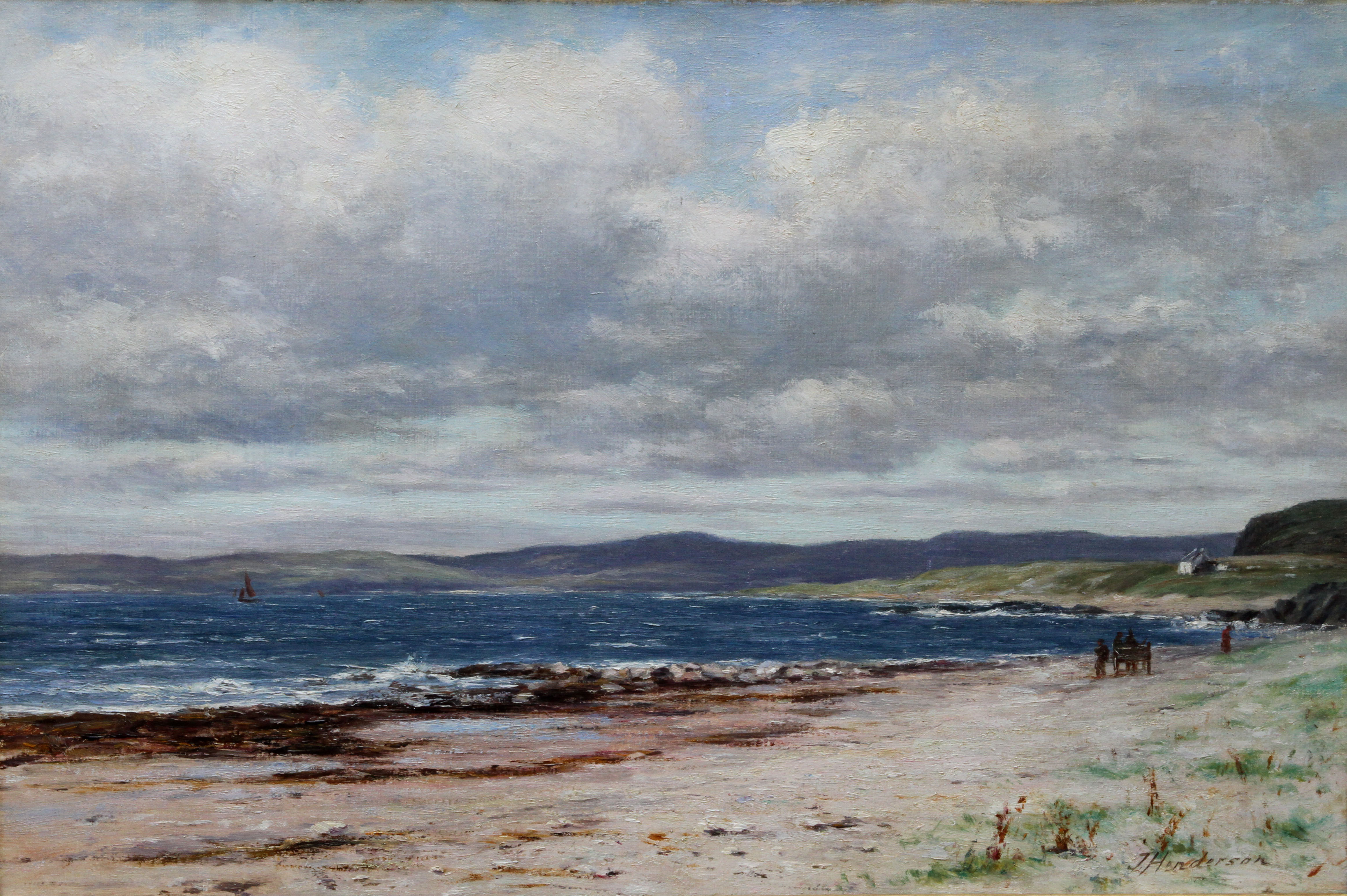 | Description | A superb 19th century Scottish Impressionist coastal oil painting by noted Scottish artist Joseph Henderson RSA. Painted circa 1880 the painting is entitled Kintyre from Arran and is a view across an Arran beach and headland toward Kintyre. There are figures and a cart on the beach and a dwelling on the headland. A really excellent example of Henderson's work with similarities to his friend William MacTaggart. Signed lower right. |