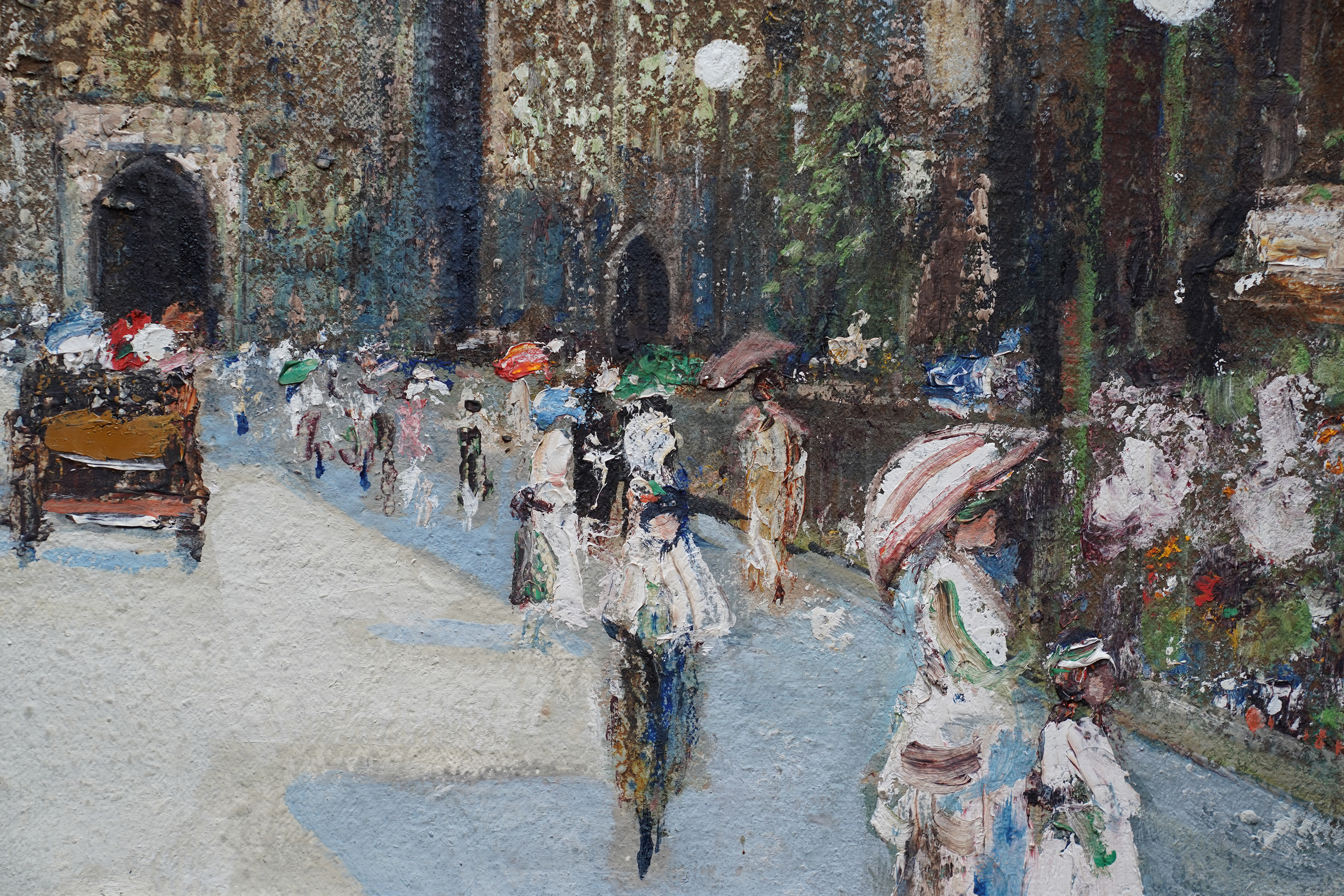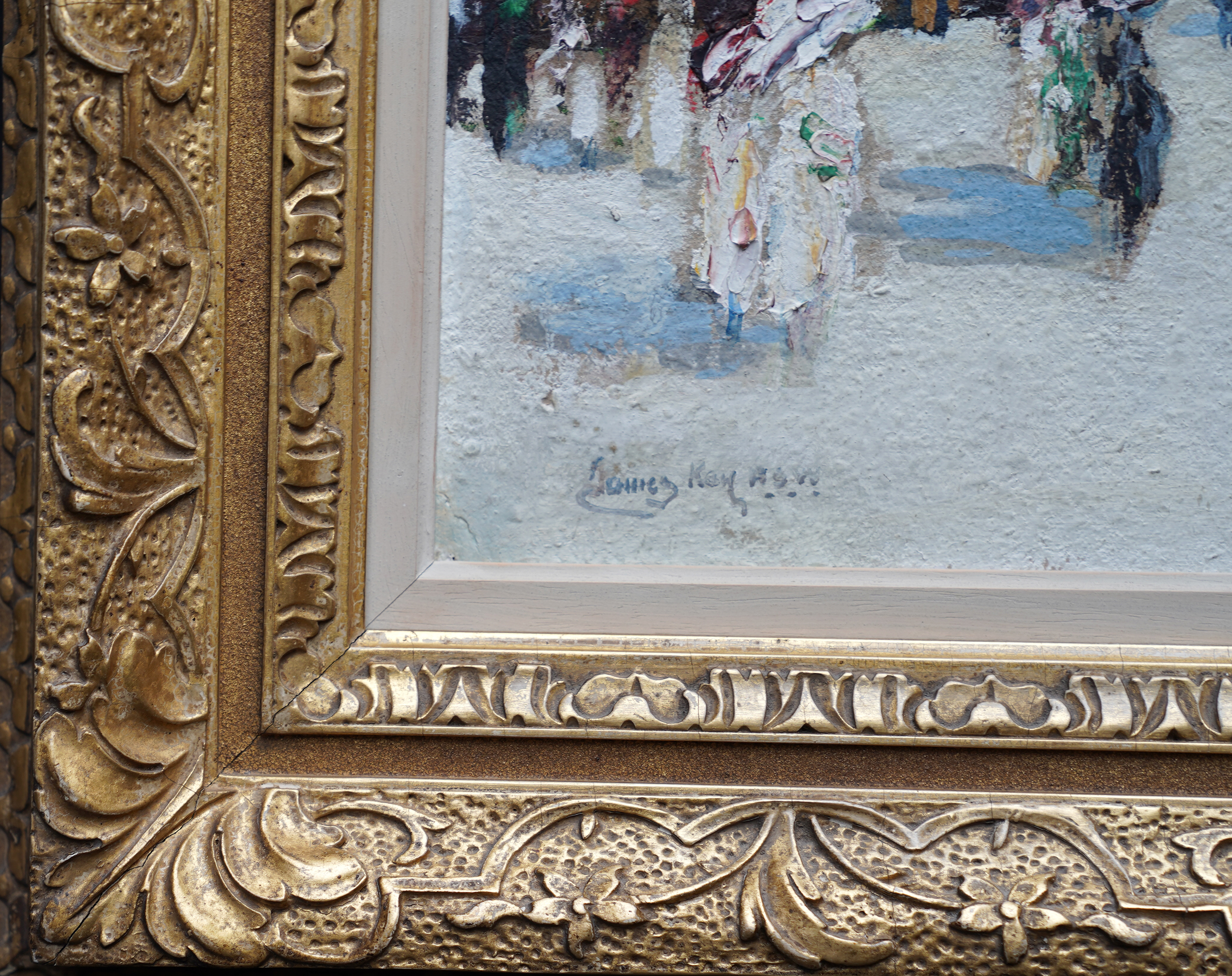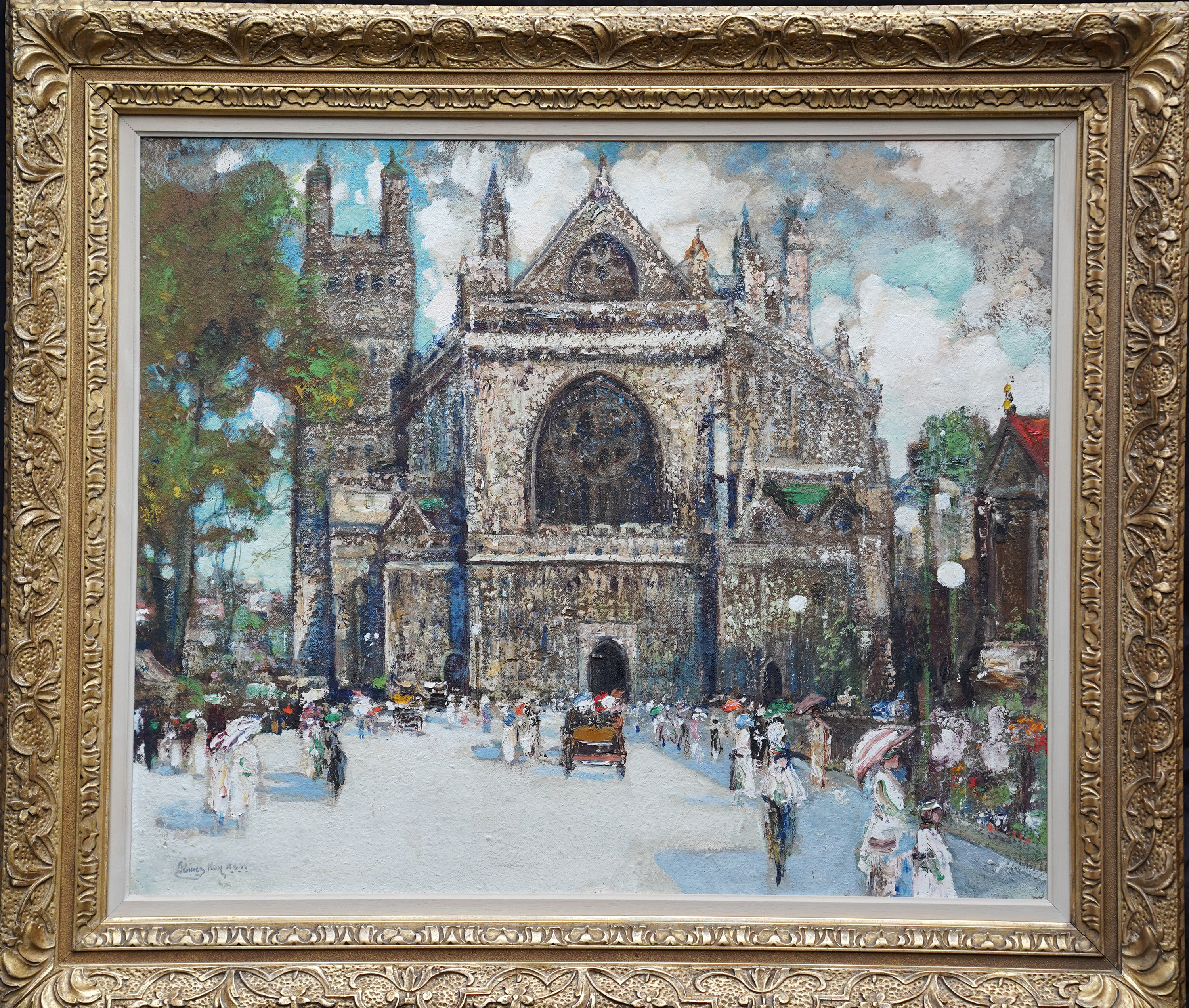 | Description | This beautiful Scottish Impressionist Edwardian architectural oil painting is by noted artist James Kay. Painted circa 1900 the painting is of Exeter Cathedral in Exeter in Devon in the south west of England. The composition shows the square leading up to the cathedral which is populated with figures dressed in their finery, many with parasols and even a horse and cart. One can just see a couple of buildings to the right of the cathedral and trees on the left. The cathedral itself fills three quarters of the canvas and is easily identified by its architecture. The Impressionist brushwork and heavy impasto are superb. The use of blue for shadows on the square echoes up to the blue sky showing through the clouds and is reminiscent of Monet and his exterior cathedral scenes. This is a stunning Scottish Impressionist Edwardian oil painting and an excellent example of Kay's work. Signed lower left. |