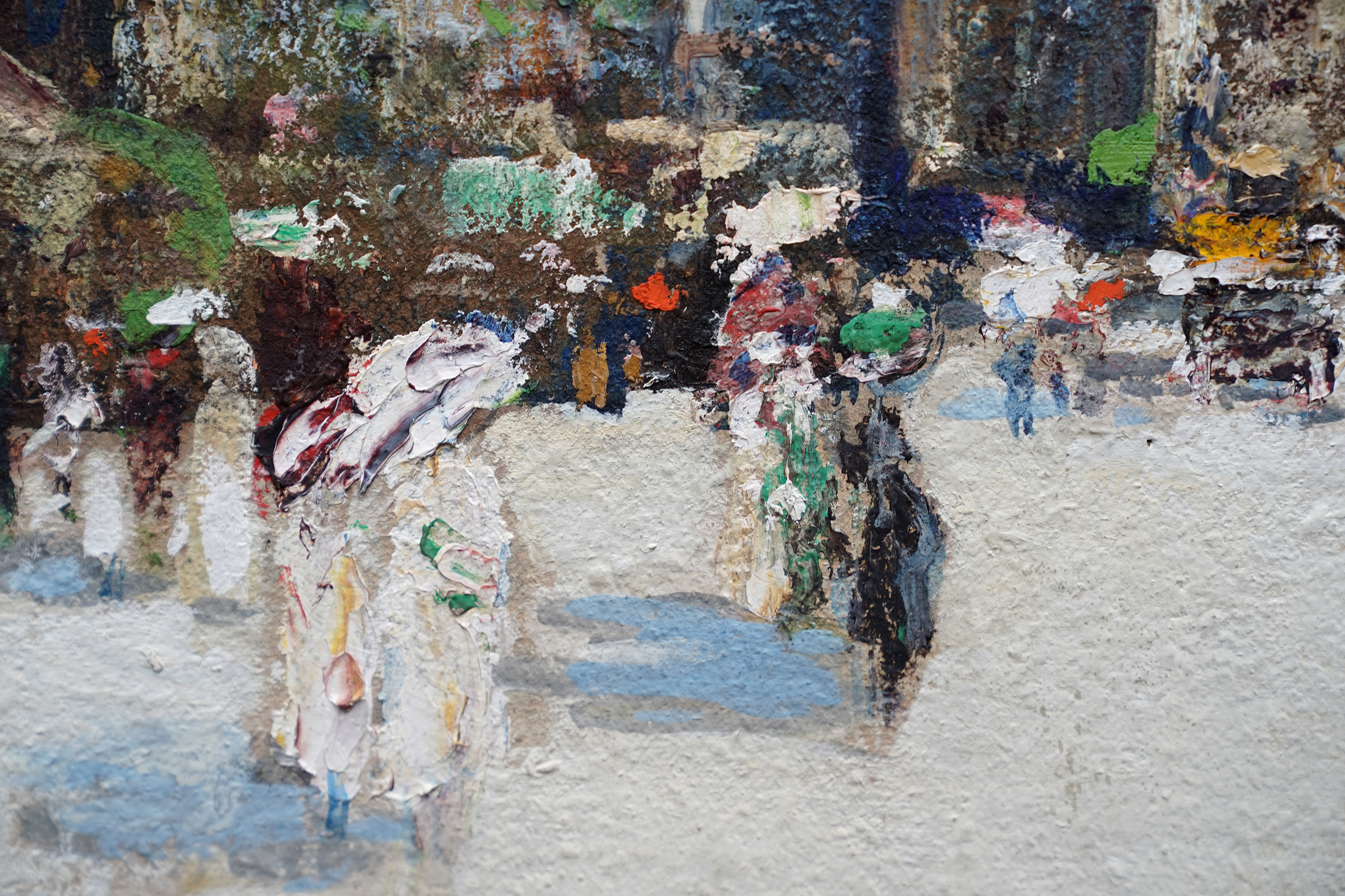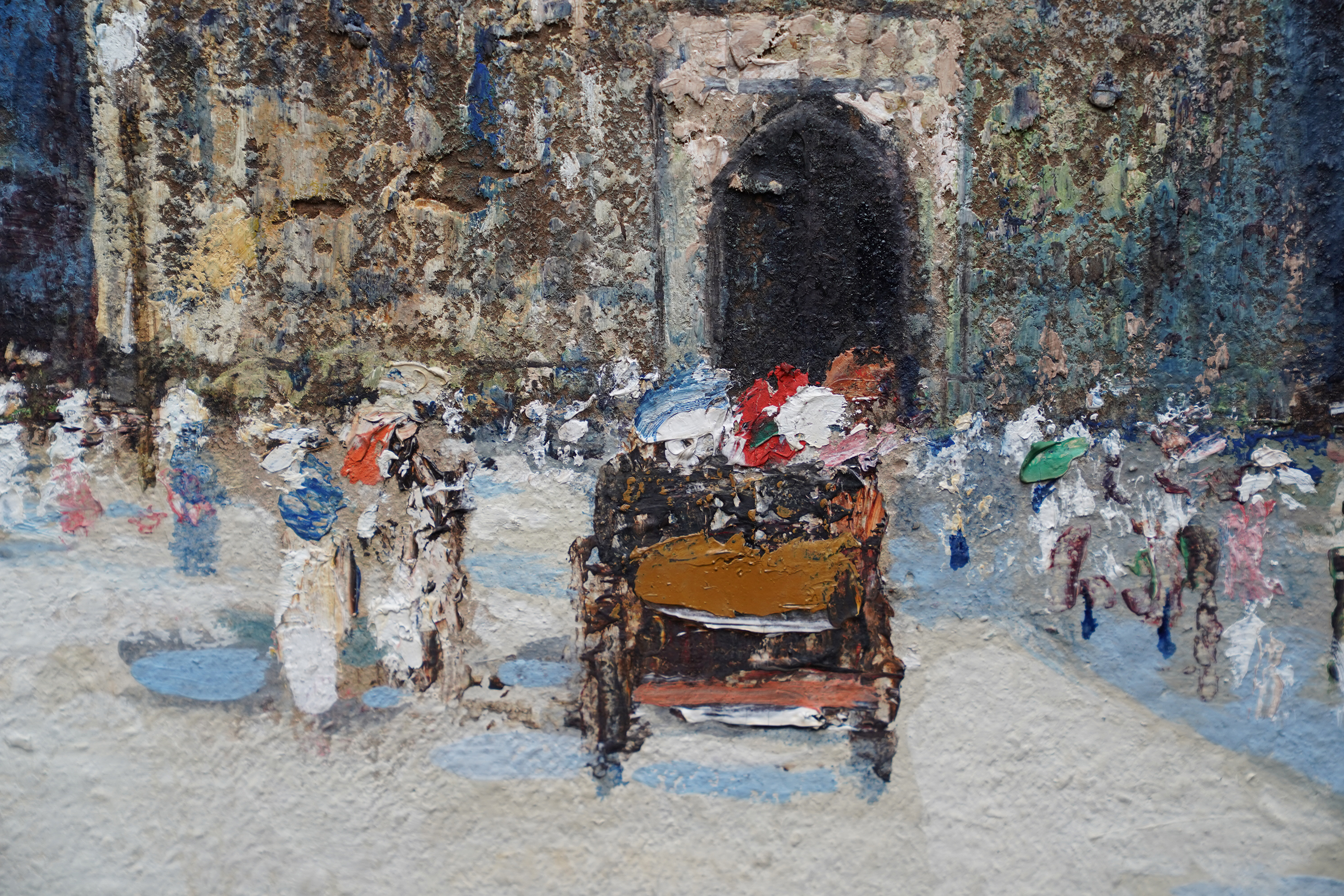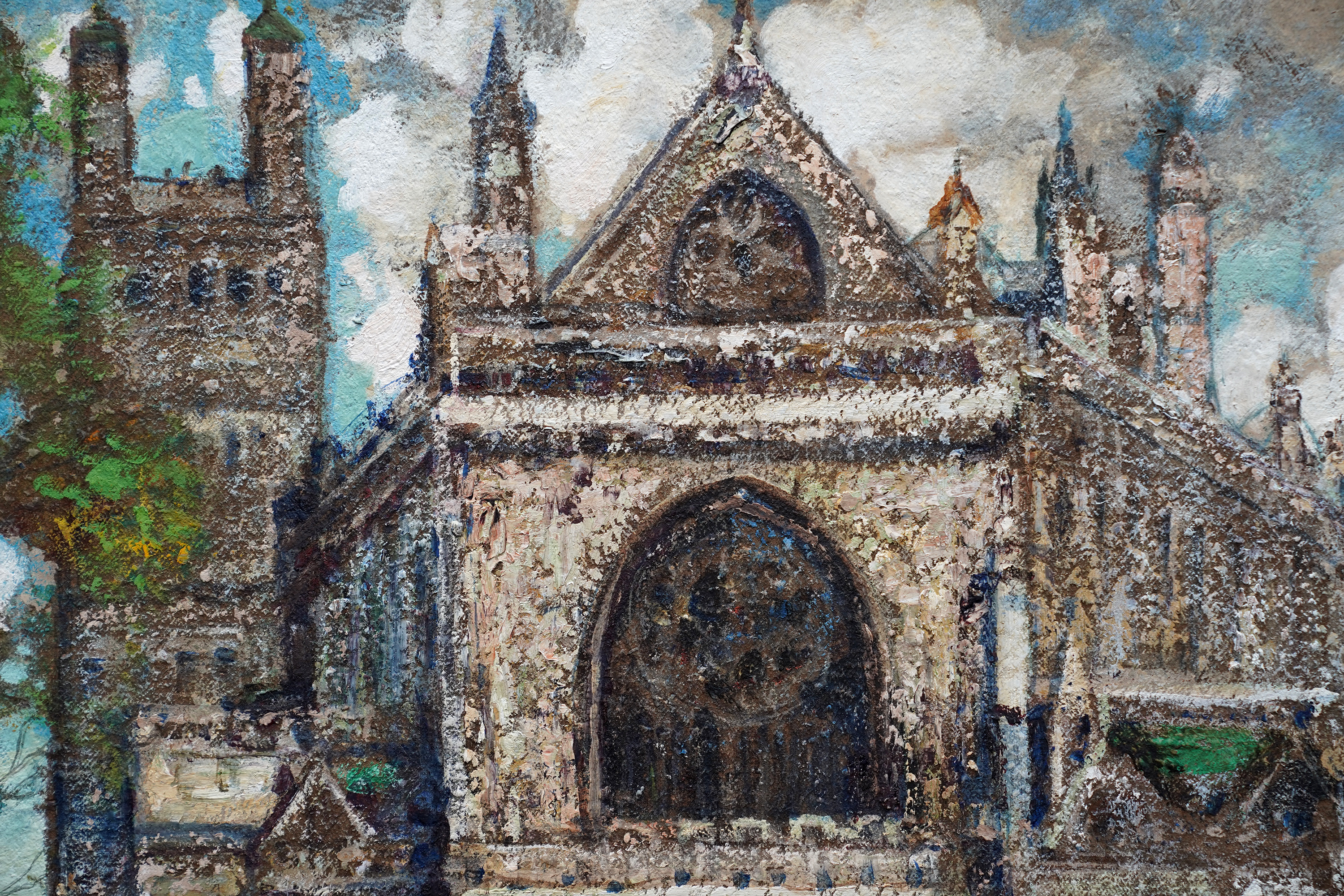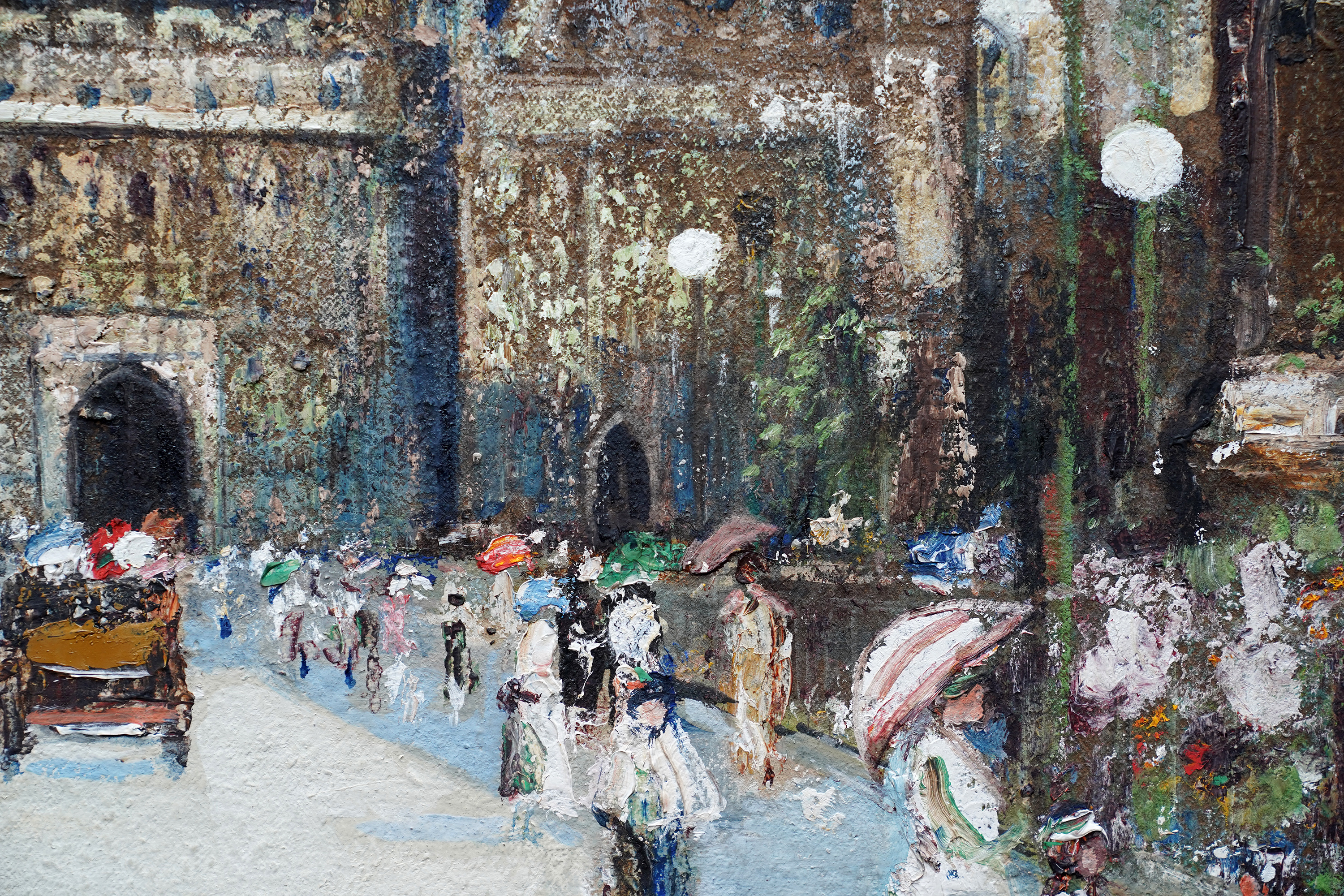 | Description | This beautiful Scottish Impressionist Edwardian architectural oil painting is by noted artist James Kay. Painted circa 1900 the painting is of Exeter Cathedral in Exeter in Devon in the south west of England. The composition shows the square leading up to the cathedral which is populated with figures dressed in their finery, many with parasols and even a horse and cart. One can just see a couple of buildings to the right of the cathedral and trees on the left. The cathedral itself fills three quarters of the canvas and is easily identified by its architecture. The Impressionist brushwork and heavy impasto are superb. The use of blue for shadows on the square echoes up to the blue sky showing through the clouds and is reminiscent of Monet and his exterior cathedral scenes. This is a stunning Scottish Impressionist Edwardian oil painting and an excellent example of Kay's work. Signed lower left. |