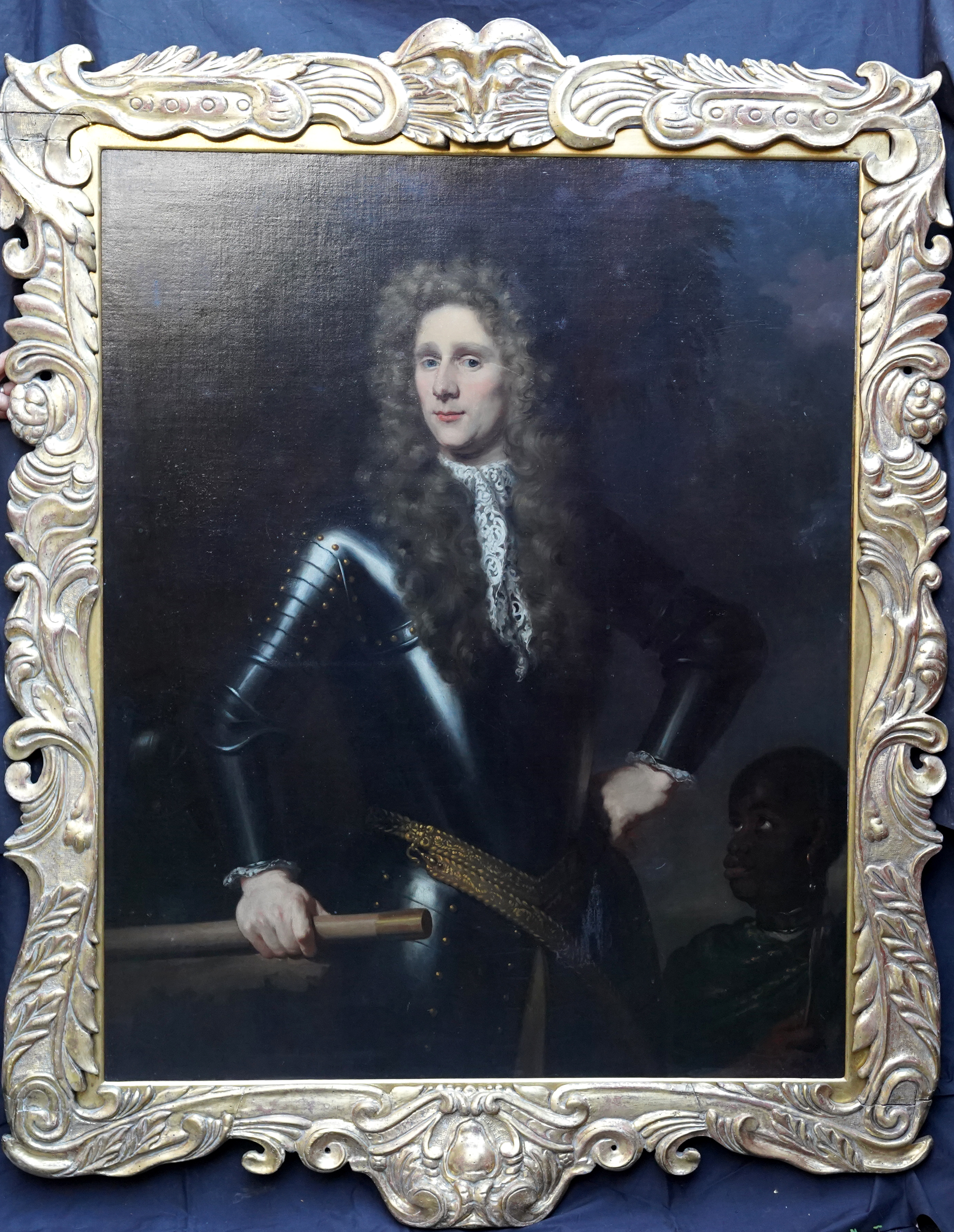 Description | This large and impressive 17th century Dutch Old Master portrait oil painting with good provenance is by Nicolaes Maes. Painted circa 1680 it is a three-quarter length standing portrait of Colonel Rupert Bridge in black armour in a landscape with a black servant. His brown curly wig cascades down his chest either side of a lacy cravat. One hand is on his left hip, the other holds a parchment or map. Although front on, his face is turned slightly to his right in a disdainful way and his pale face looks distinctly superior. To the Colonel's left and in the corner of the painting is a small young black servant, or page boy. He is gazing up at the Colonel and the whites of his eyes are very apparent. He is wearing a decorative cloth around his shoulders and appears to have a collar around his neck. The positioning and body language of the two figures emphasises the Colonel's social status and wealth. Until the 19th century, the most common role for black people in art was that of servant or slave. It was considered a status symbol for wealthy Europeans to own or employ an exotic, well-dressed black servant. It was increasingly fashionable, and a form of social currency from the seventeenth century onwards, for the Black servant in the British aristocratic home to be shown in portraits. This inclusion was a status sign of wealth, and having portraits created was a public way to record these lives. These portraits are not uncommon for this era and they encapsulate the seventeenth-century fashion for aristocrats to be presented next to Black individuals, as a way to demonstrate their social and economic status, and whiteness. Showing minimal facial features obscures the evidence of the Black individual in apparently white spaces, and simultaneously demonstrates the whiteness of the aristocracy. The Black presence in these various portraits demonstrated the establishments involvement in the transatlantic slave trade. The detail and brushwork are superb and this is an excellent example of a 17th century Dutch Old Master portrait and of Maes' skill as a portraitist. |