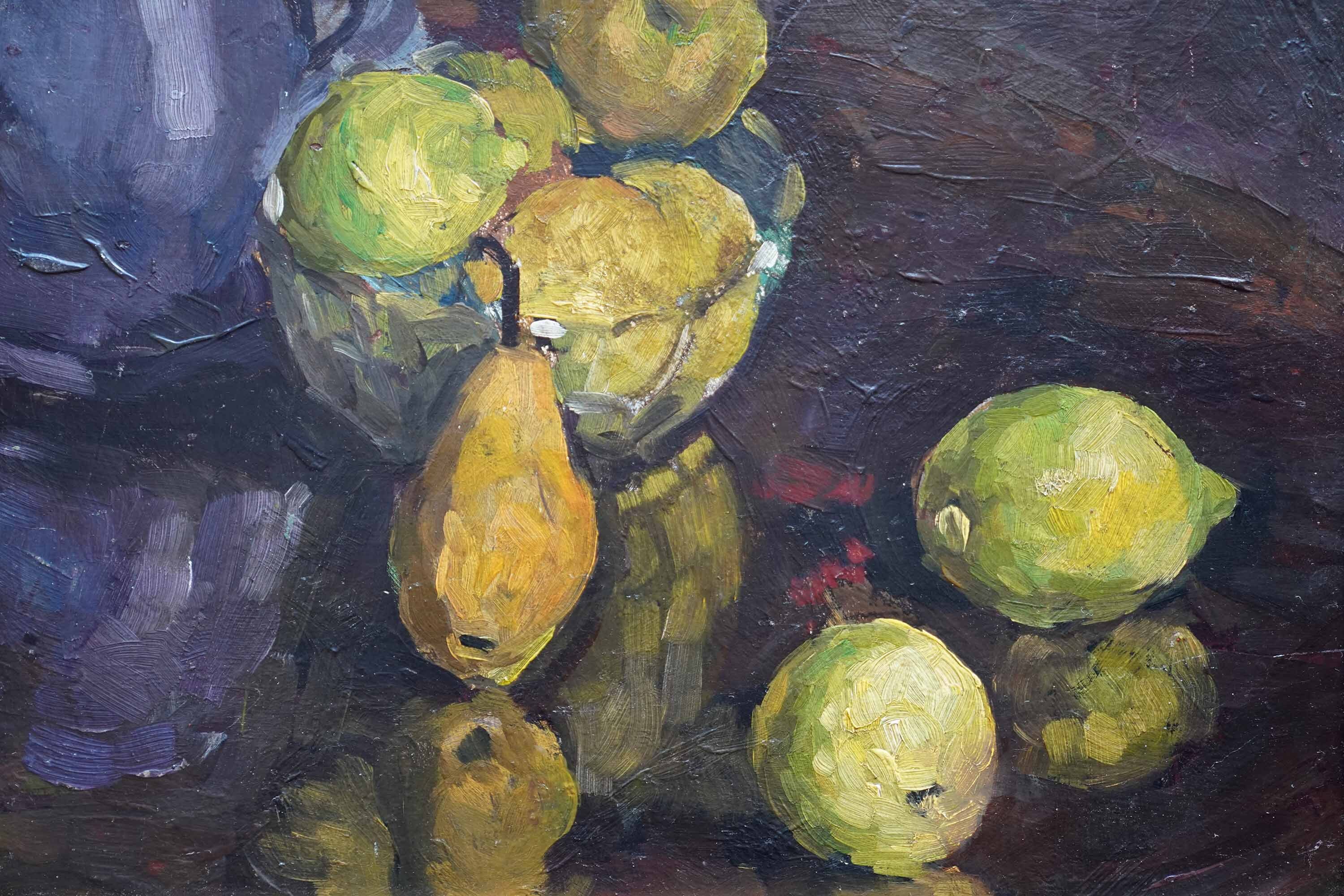 Description | This lovely British Post Impressionist still life oil painting is by artist Peter Field. Painted circa 1955 on canvas it is a still life of lemons and pears in a bowl and on a table with a purple jug to the left. The brushwork and impasto on the fruit and reflections on the table are superb. This is a fine example of Field's still life oil painting from this period. Unsigned. |