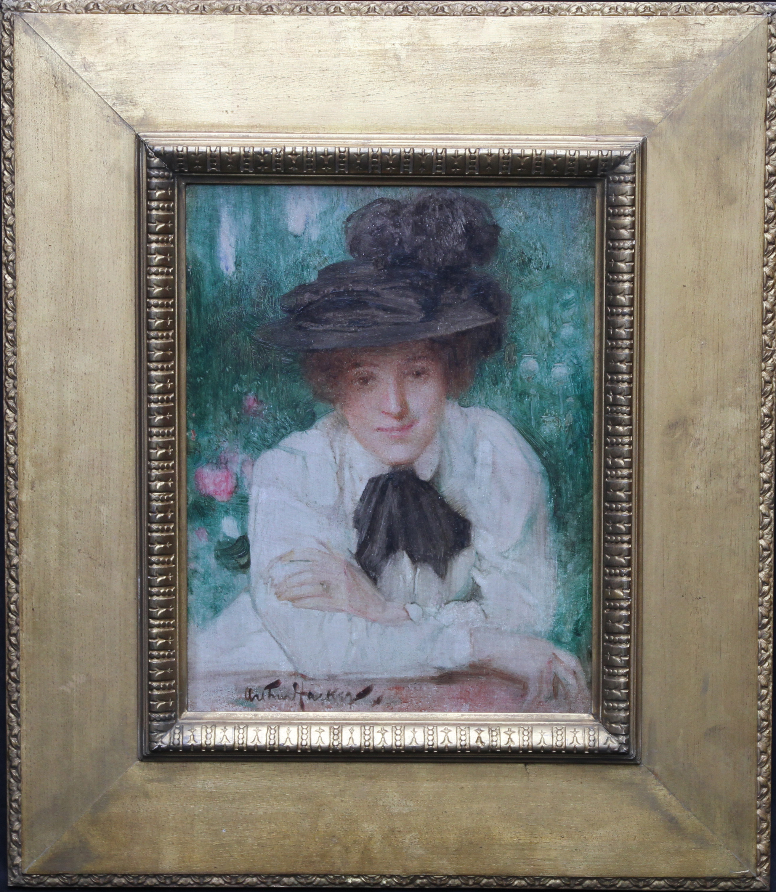 | Description | This beautiful vibrant British Impressionist Edwardian portrait oil painting on panel is by noted artist Arthur Hacker. Painted circa 1905 it is a half length portrait of a lady dressed in white with a black bow at her neck and hair up under an ornate black hat. She is outdoors in a garden with pink flowers behind her to her left and perhaps dried poppy heads or thistles to her right against a vivid green background. She is resting her arms on a wall and leaning forward towards the artist/viewer and smilling. It is a very charming, informal portrait and the Impressionist brushwork and impasto are superb. It is housed in a lovely gilded oak frame of the period. Signed lower left. |