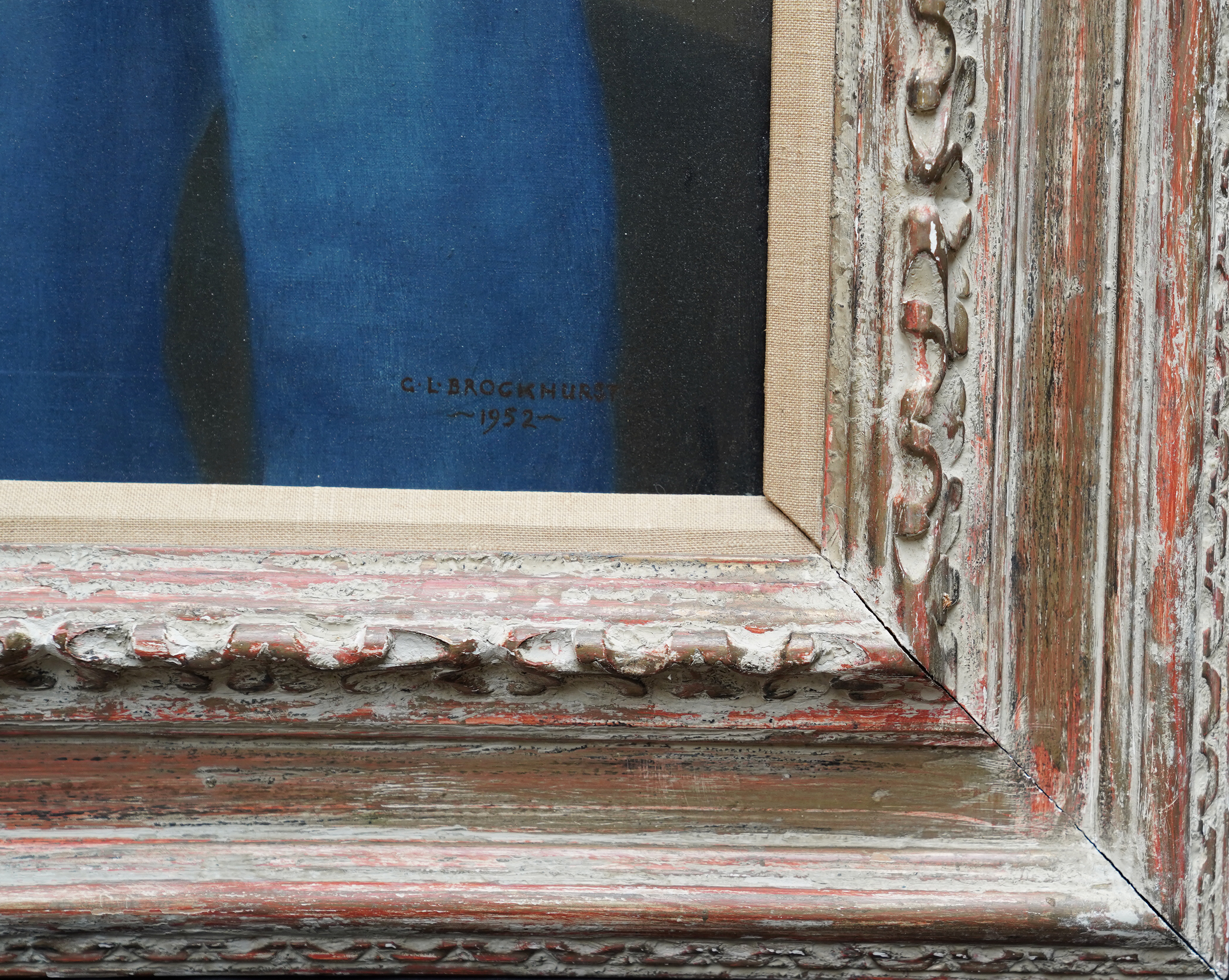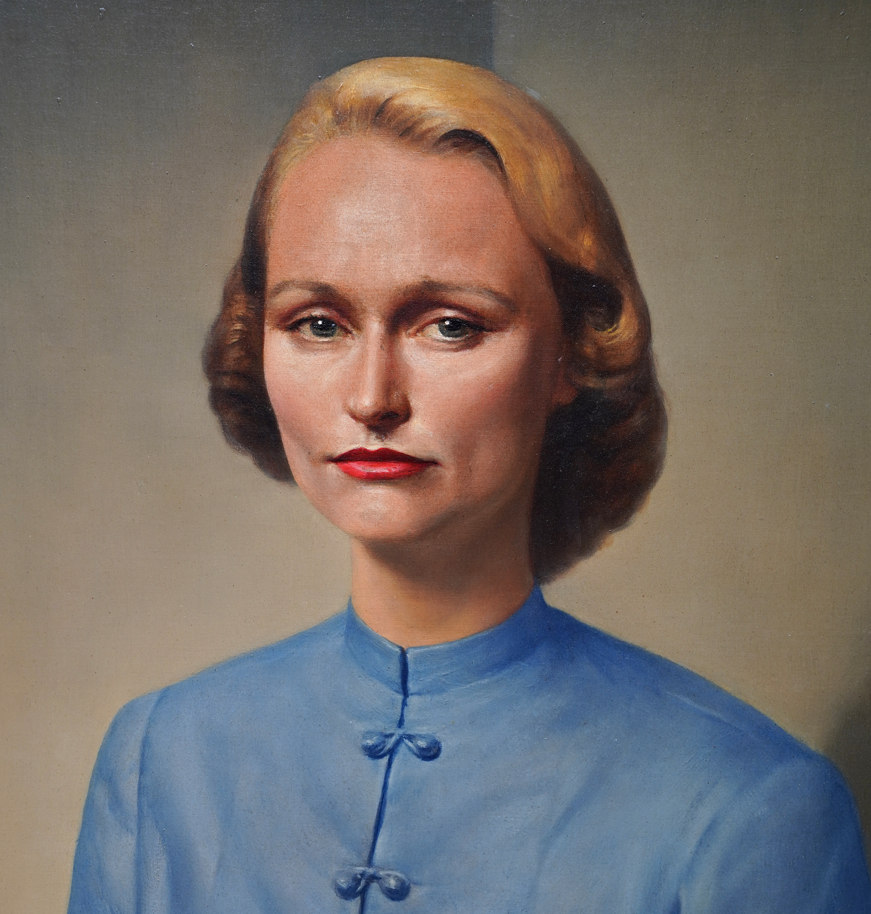| Description | This superb British realist portrait oil painting is by noted artist Gerald Leslie Brockhurst. It was painted in 1952 when Brockhurst was in his sixties and living in America since 1939. The sitter is Hope G. Simpson. The painting is a half length portrait of a striking blonde woman in a blue buttoned up garment. It is a strong portrait with bold colours and confident brushwork and an excellent example of his work. Signed and dated 1952 lower right. |