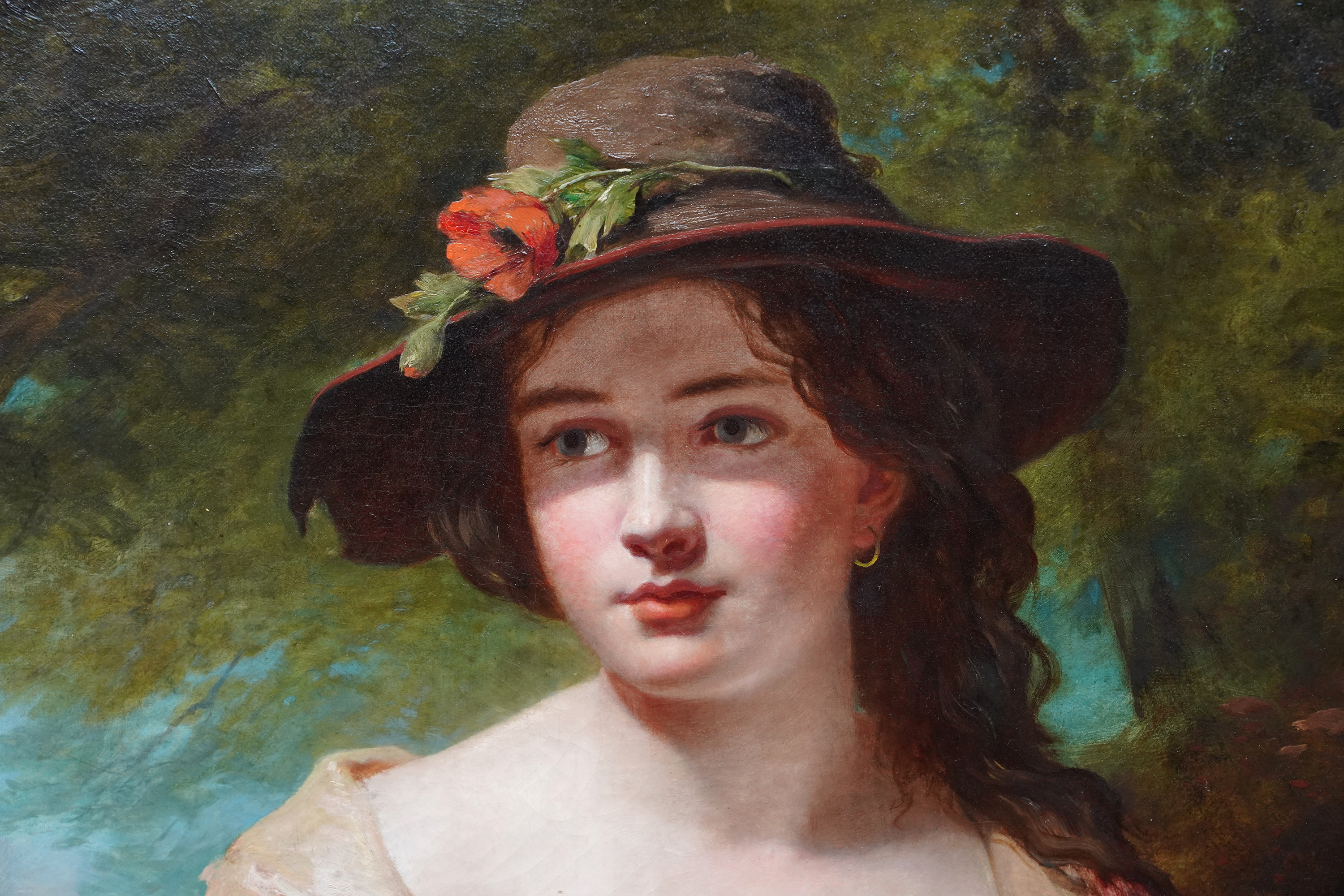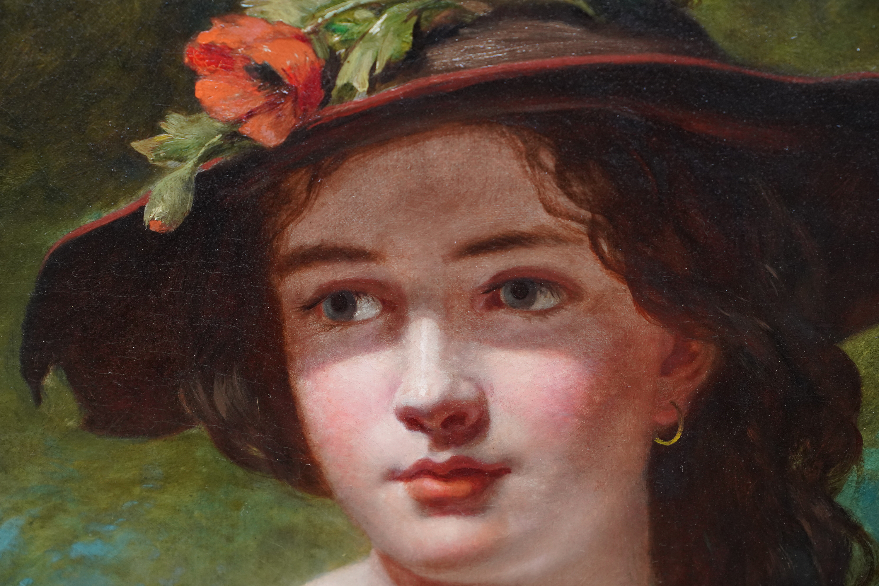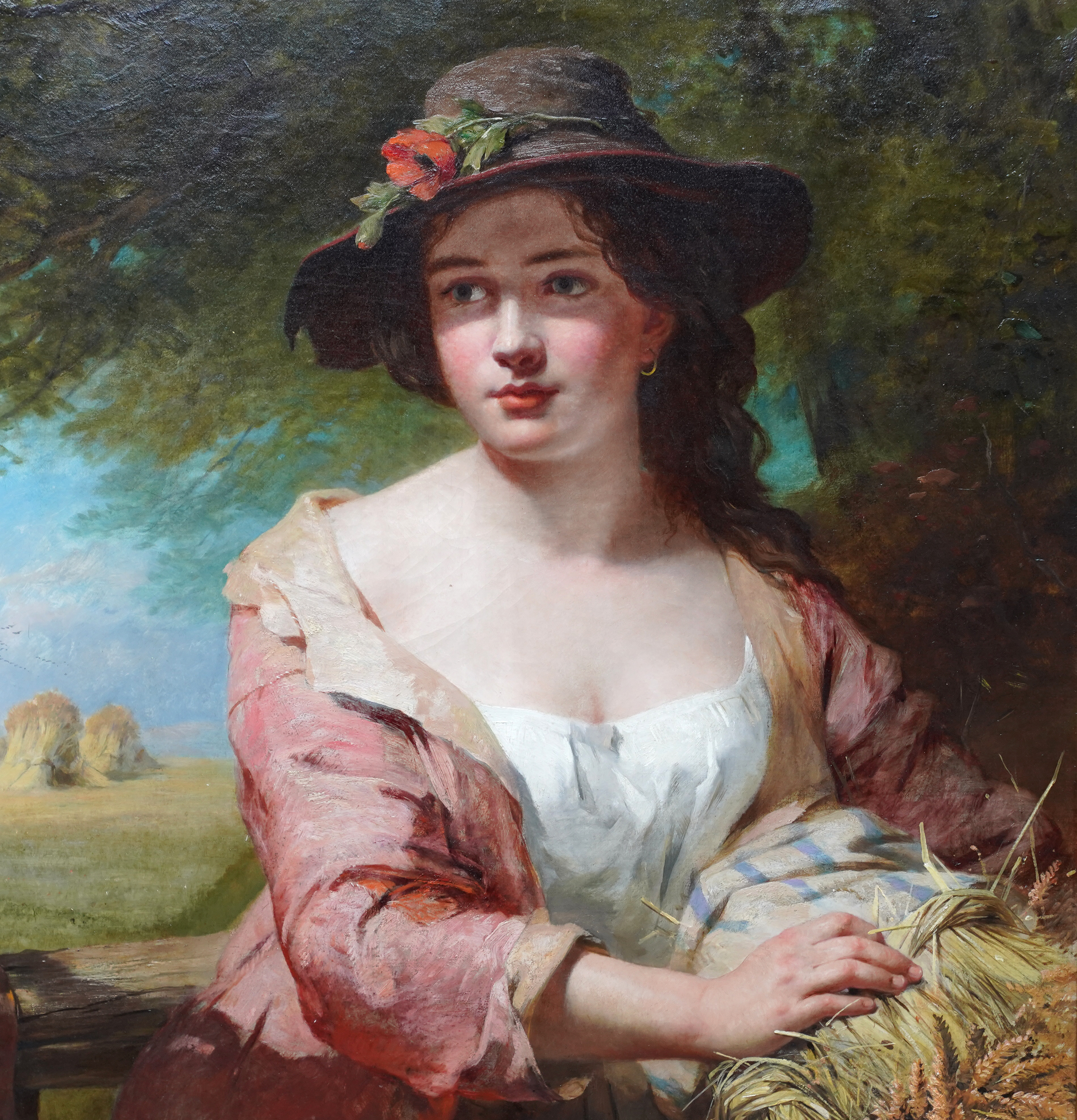 | Description | This absolutely lovely British Victorian oil painting is by noted Birmingham born artist James John Hill and has some excellent provenance below. The painting actually stayed in Birmingham for many years, hanging in Heathfield Hall, the former residence of inventor and engineer James Watt, but owned at that time by Thomas Pemberton. It then moved to Berwick House in Shropshire. Entitled The Gleaner and painted in1863, it is a charming half length portrait of a young woman with a sheaf of wheat under her arm. She is stood beneath trees and the wheat field is beyond. She is dressed in a lovely pink garment and wearing a brown felt hat, to shade her face from the sun, her dark hair cascading down her shoulder, The hat is decorated with a poppy. The soft tones and sympathetic rendering of the young woman make this a stunning 19th century oil painting with excellent provenance. The painting is housed in its original gilt frame with a beautiful oak leaf motif. Signed and dated 1863 lower left. |