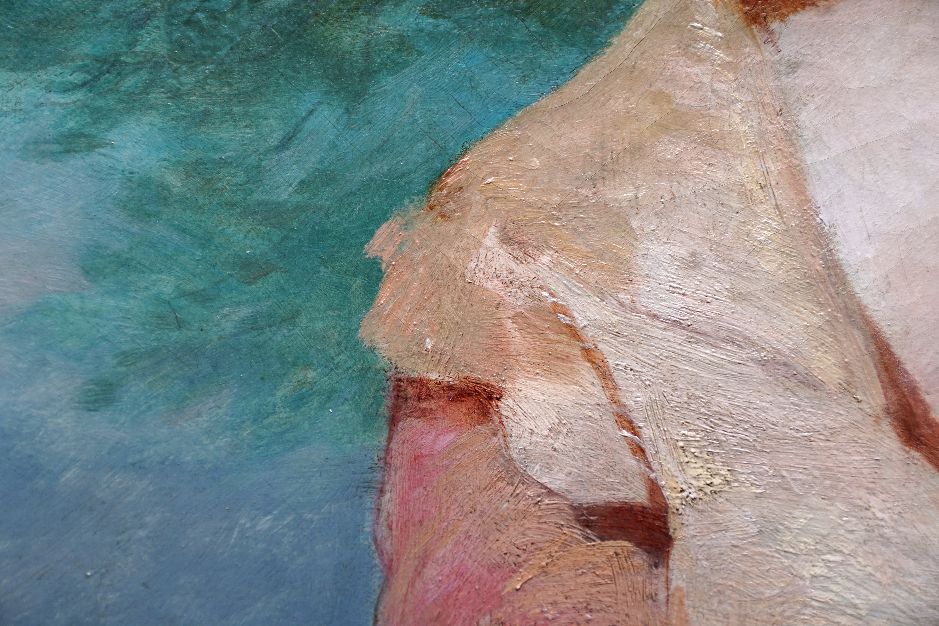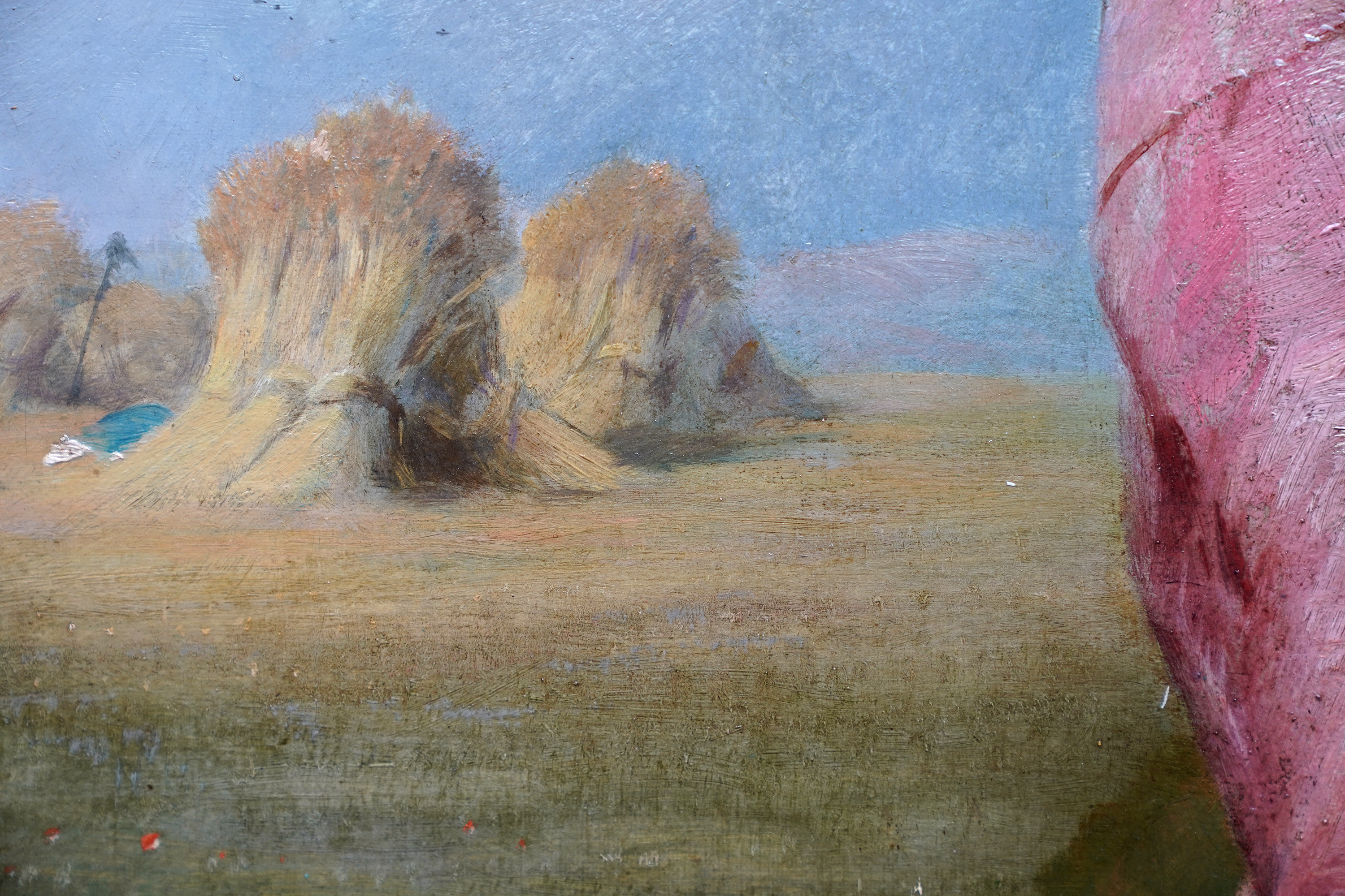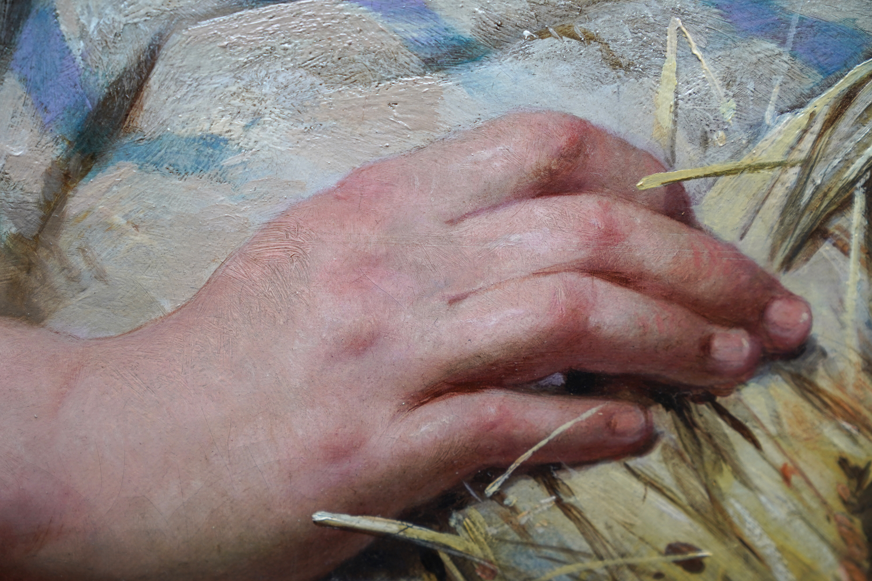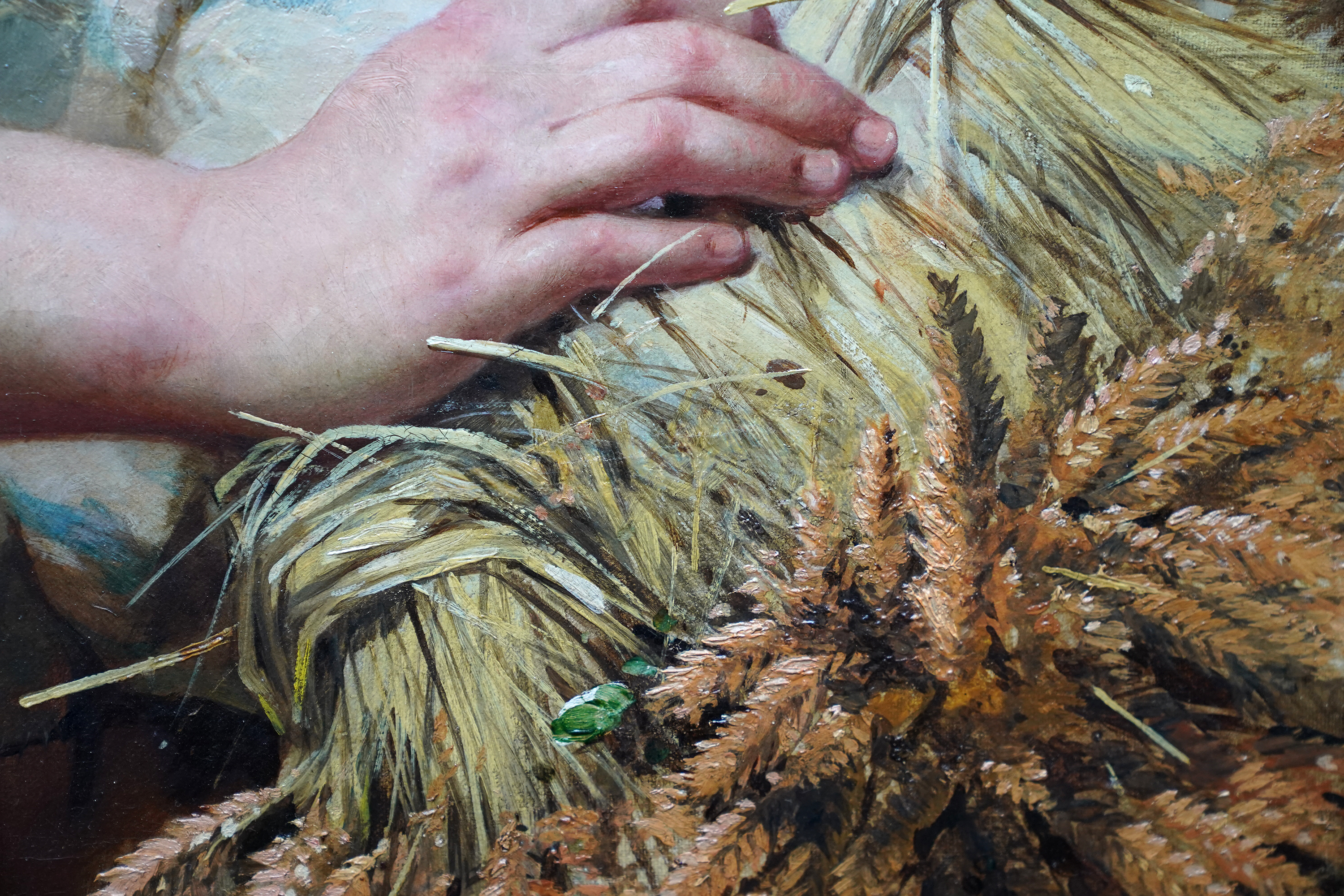 | Description | This absolutely lovely British Victorian oil painting is by noted Birmingham born artist James John Hill and has some excellent provenance below. The painting actually stayed in Birmingham for many years, hanging in Heathfield Hall, the former residence of inventor and engineer James Watt, but owned at that time by Thomas Pemberton. It then moved to Berwick House in Shropshire. Entitled The Gleaner and painted in1863, it is a charming half length portrait of a young woman with a sheaf of wheat under her arm. She is stood beneath trees and the wheat field is beyond. She is dressed in a lovely pink garment and wearing a brown felt hat, to shade her face from the sun, her dark hair cascading down her shoulder, The hat is decorated with a poppy. The soft tones and sympathetic rendering of the young woman make this a stunning 19th century oil painting with excellent provenance. The painting is housed in its original gilt frame with a beautiful oak leaf motif. Signed and dated 1863 lower left. |