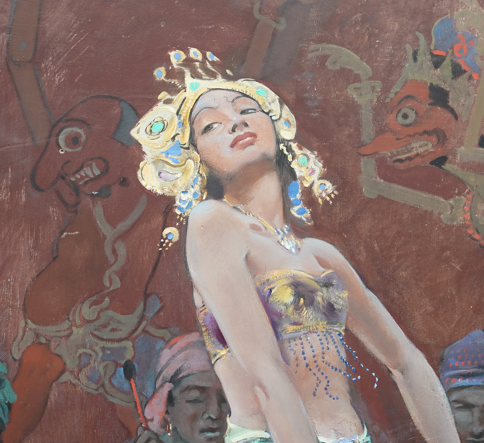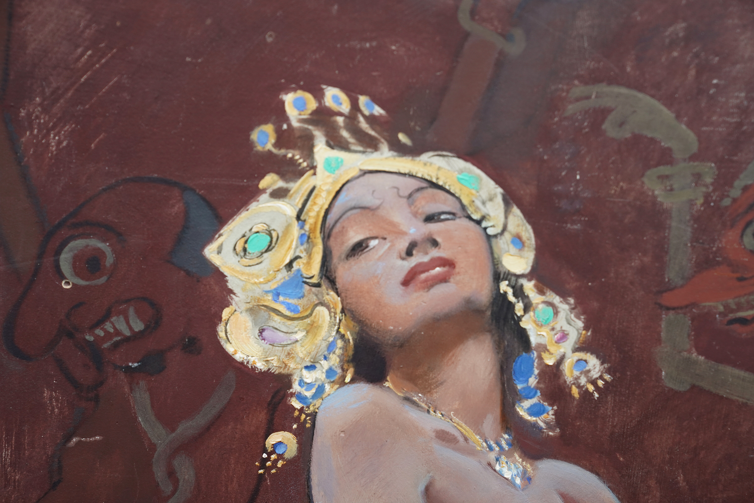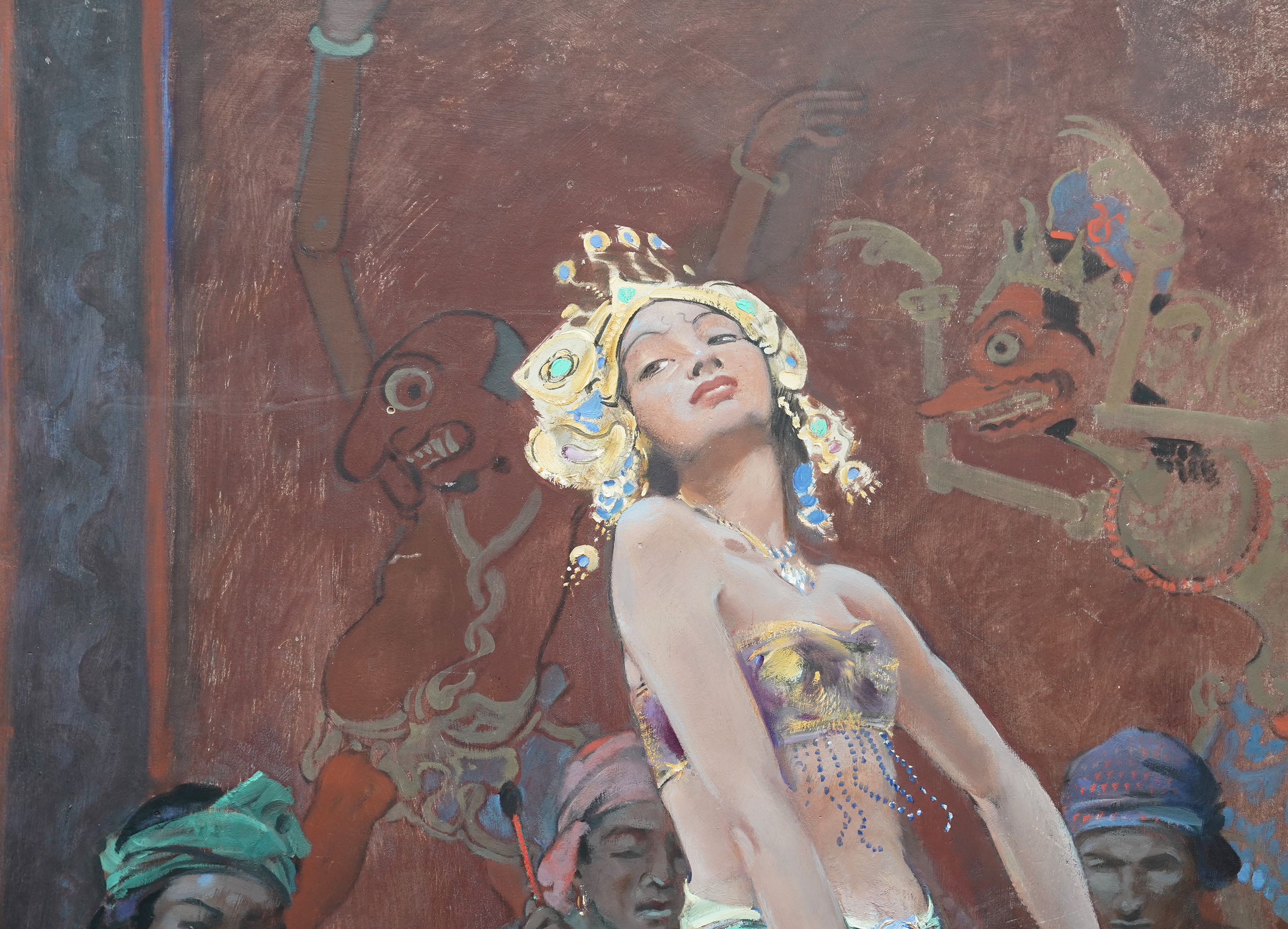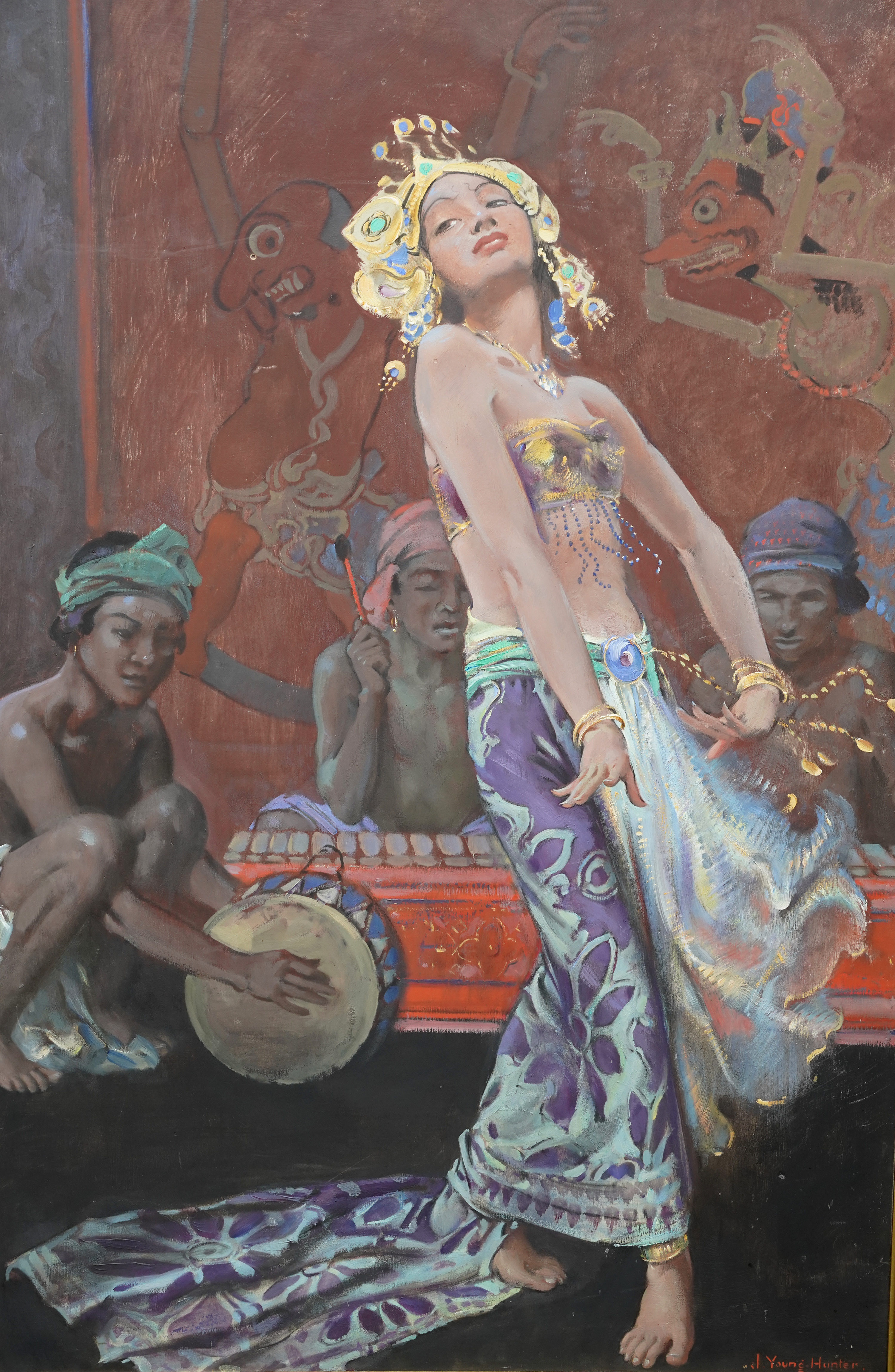 | Description | This stunning British 1920's tempera oil on board painting is by noted artist John Young Hunter. It was painted circa 1927 and the composition is a full length portrait of a beautiful female Balinese dancer dancing, with three musicians crouched behind her, set against a mural covered wall. The view point is looking up at her from the front. She is wearing an ornate gold headdress and flowering blue patterned skirt with beaded top and performing intricate hand movements. The colours are really vibrant and Hunter has perfectly captured her movement and energy. This is fantastic painting with great detail and brushwork and an excellent example of Hunter's work. Signed lower right. |