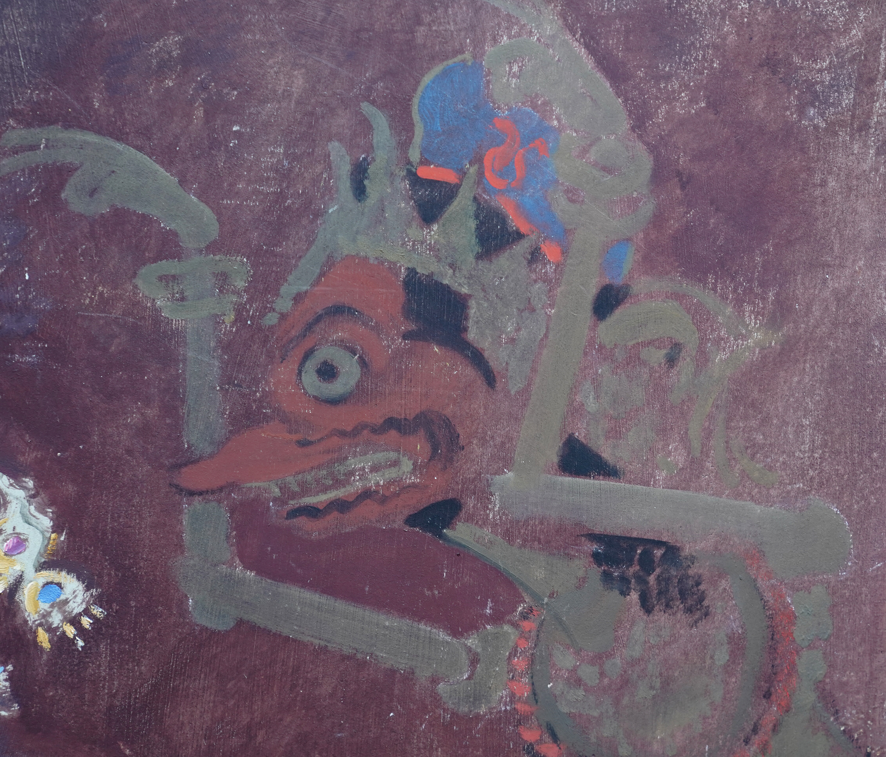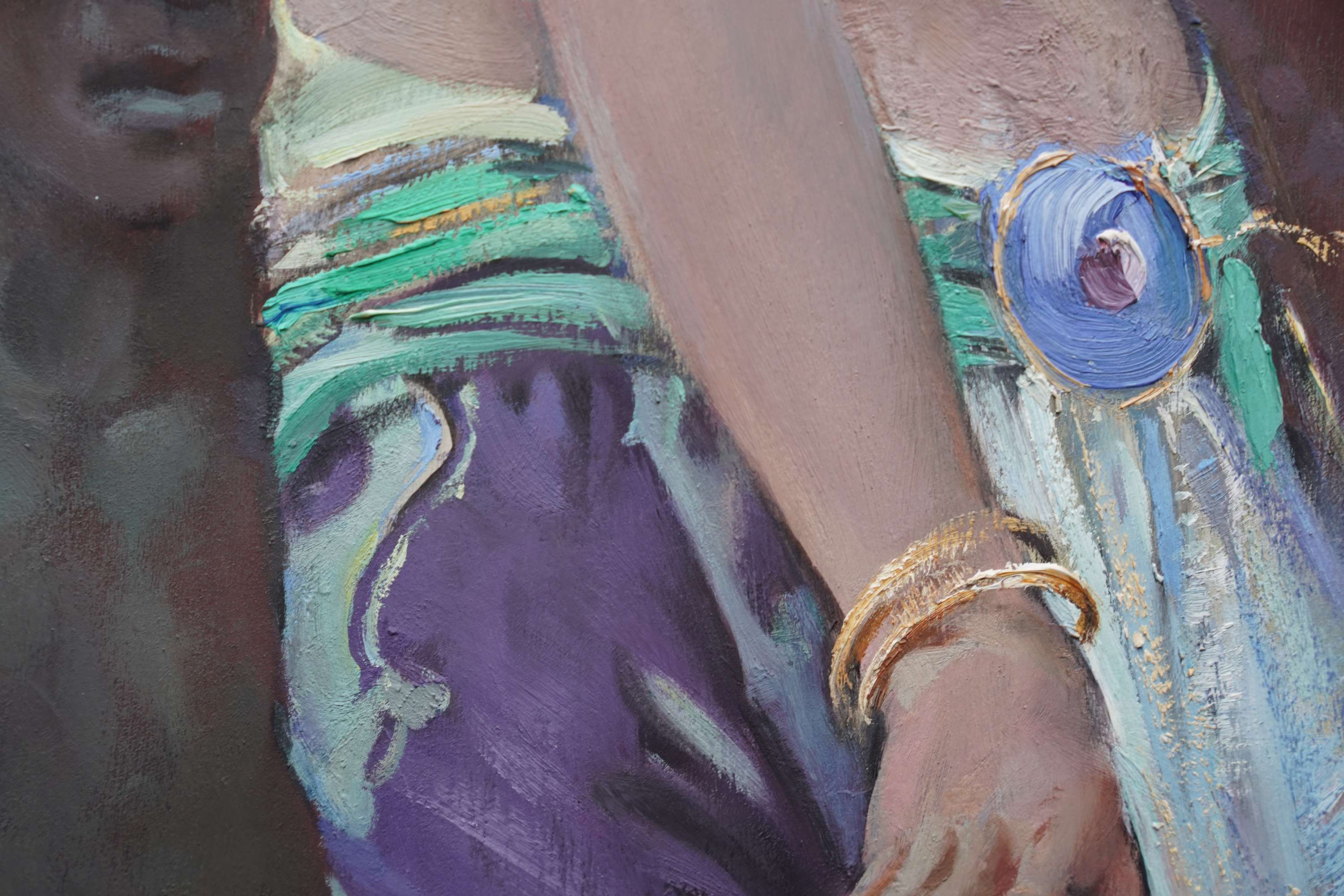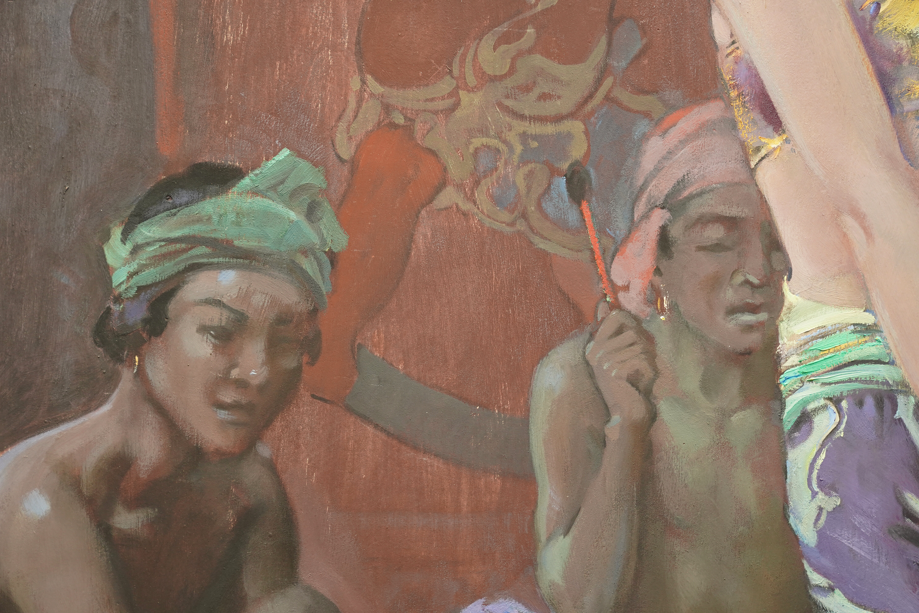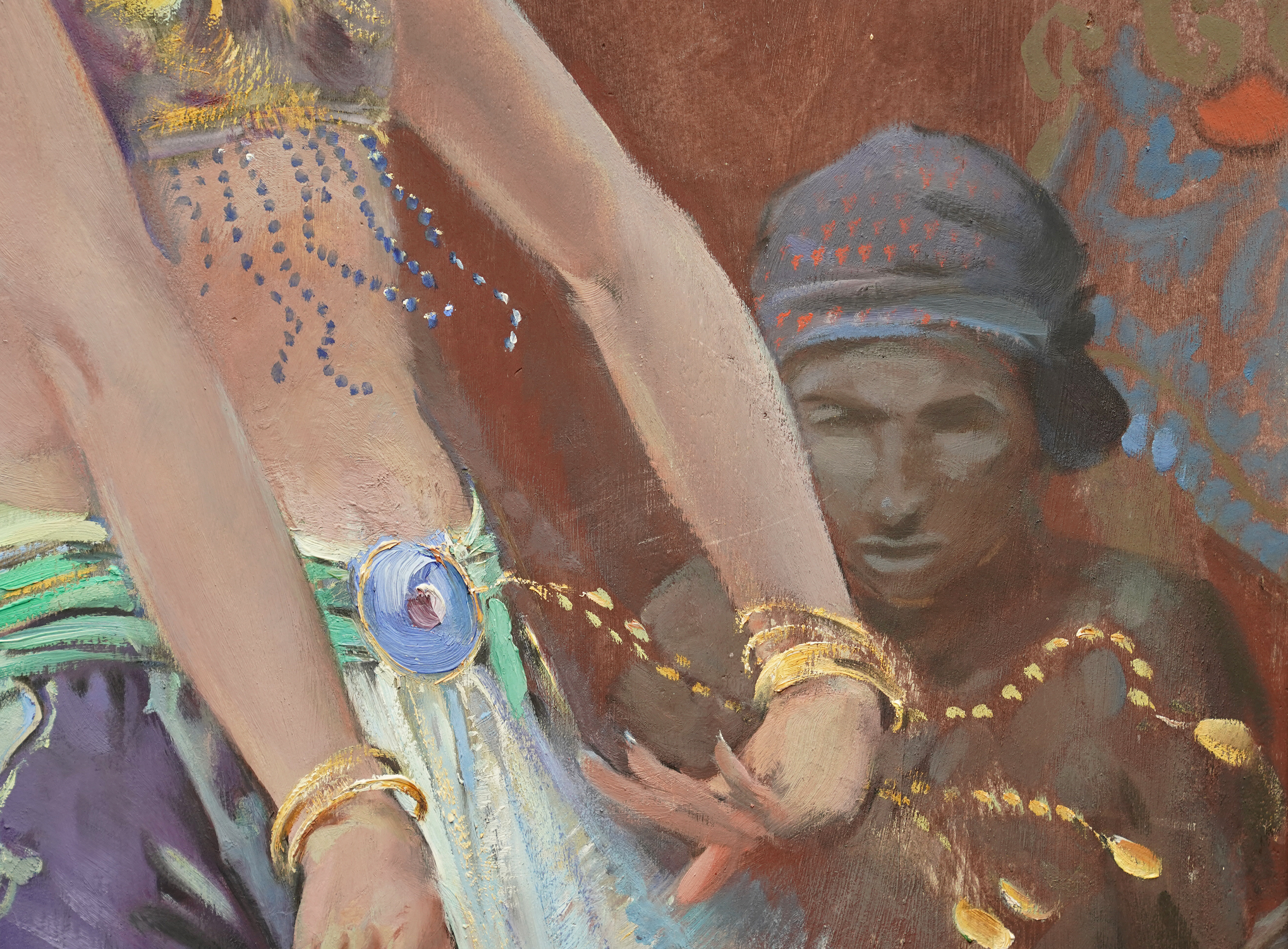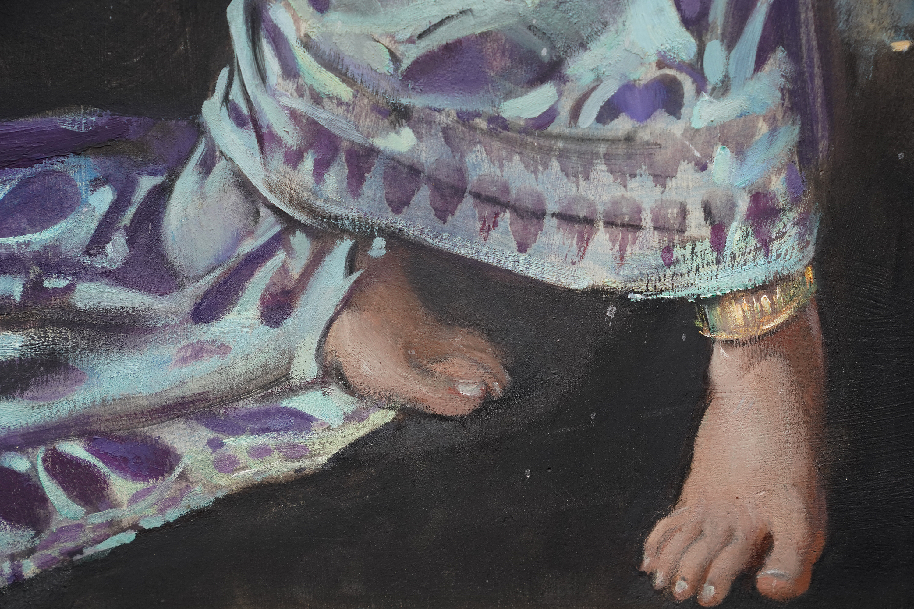 | Description | This stunning British 1920's tempera oil on board painting is by noted artist John Young Hunter. It was painted circa 1927 and the composition is a full length portrait of a beautiful female Balinese dancer dancing, with three musicians crouched behind her, set against a mural covered wall. The view point is looking up at her from the front. She is wearing an ornate gold headdress and flowering blue patterned skirt with beaded top and performing intricate hand movements. The colours are really vibrant and Hunter has perfectly captured her movement and energy. This is fantastic painting with great detail and brushwork and an excellent example of Hunter's work. Signed lower right. |