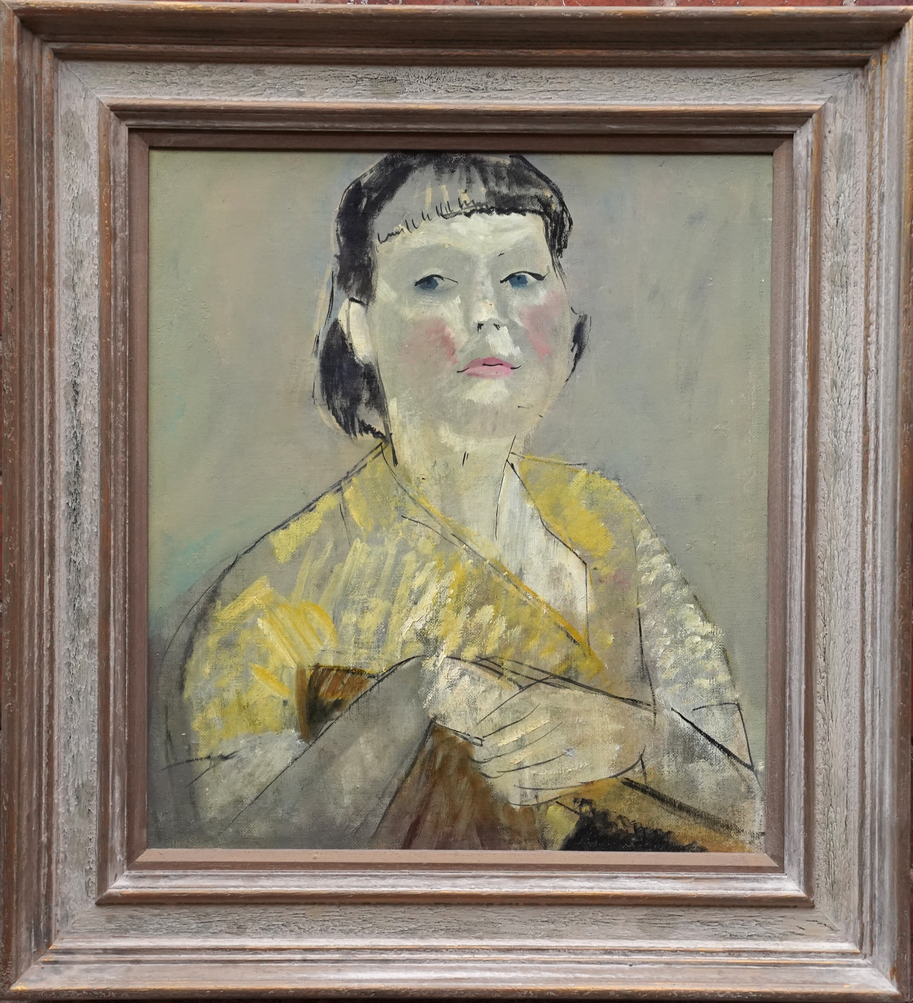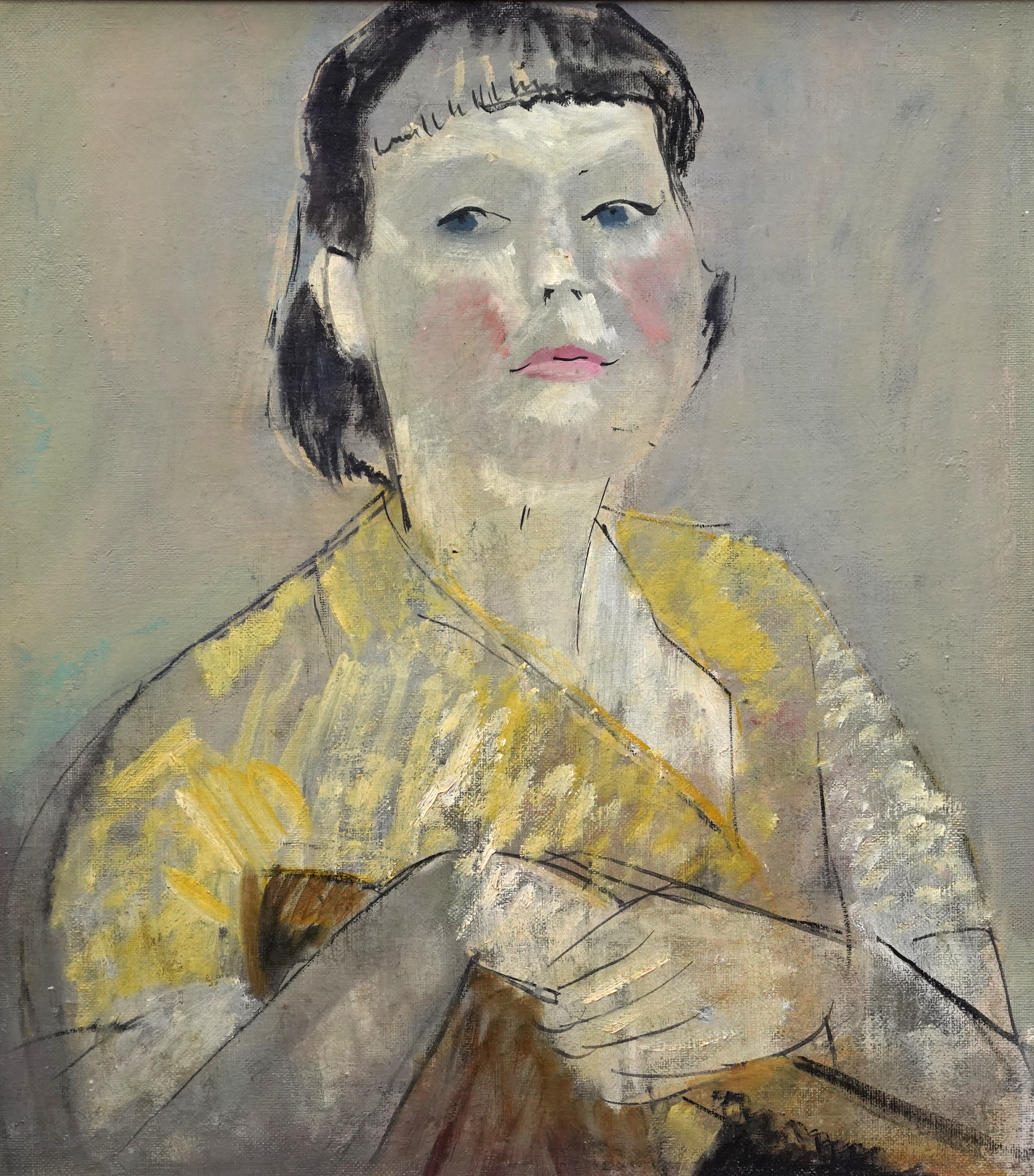 A superb oil painting on panel by Pauline Glass. This stunning oil is a bold, adventurous and confident portrait of a woman by a very talented British listed female artist. Comparisons with Joan Eardley and Anne Redpath are not far away and this is an expressive delight. Painted circa 1955 and in fine gallery condition, it has been an exhibited work and retains the exhibition transit labels verso. Reminds me of the Impressionist paintings of Raoul Dufy. |