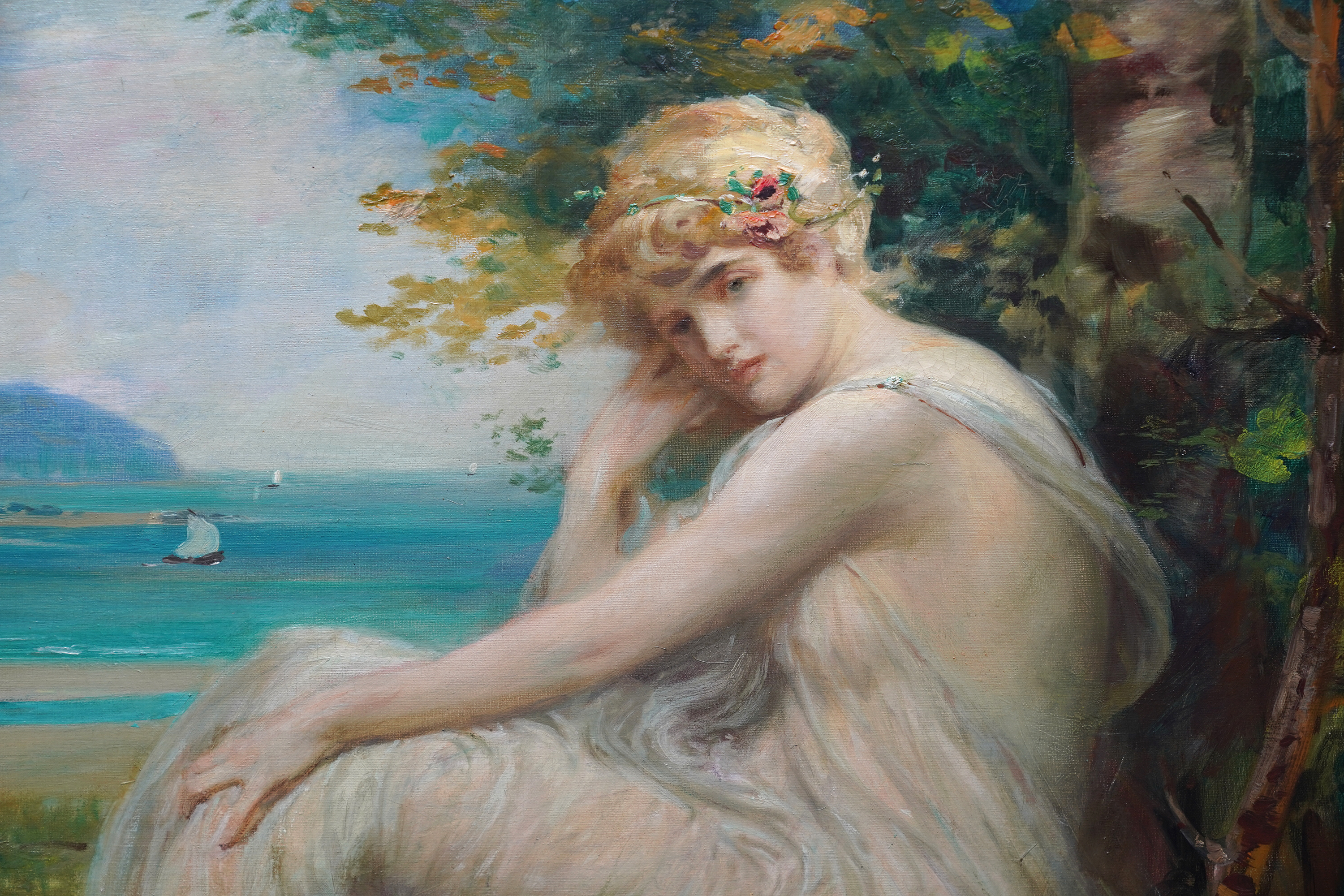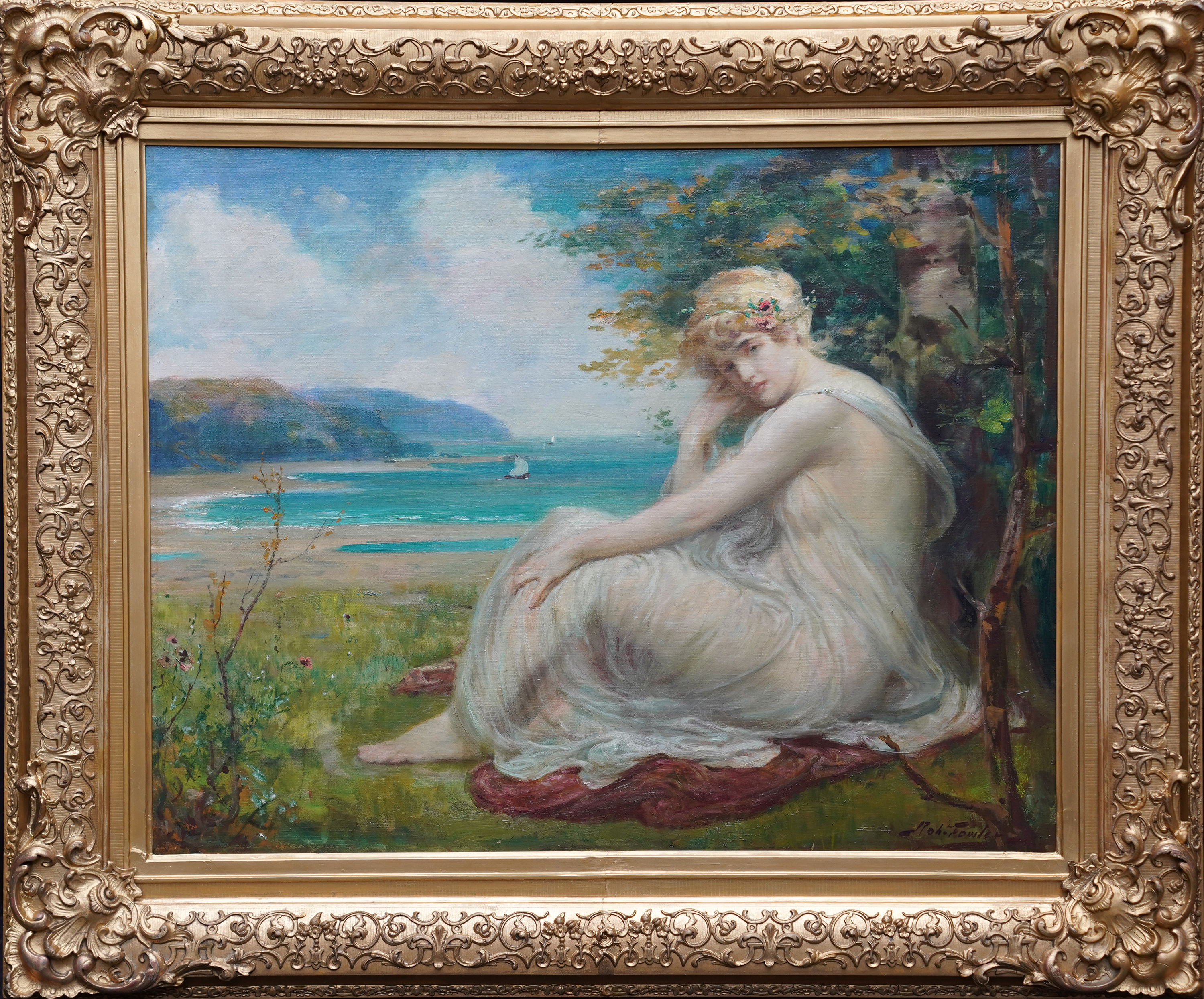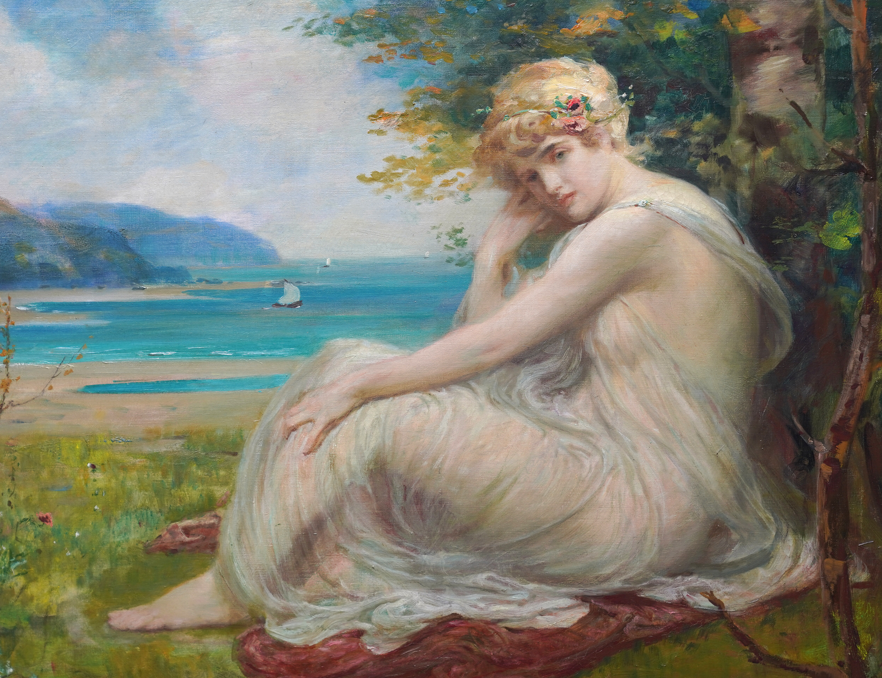 Description This stunning Scottish Victorian portrait oil painting is by noted artist Robert Fowler. Painted circa 1893 the composition is of a blonde haired maiden in the foreground, dressed in a flimsy robe, sitting on grass and leaning against a tree. Beyond her is a vibrant coastal landscape on a summer's day. One can see the influence of Frederick Leighton in his work and also mythology. There is tremendous brushwork and the vivid blues and greens against the soft white of her robe and the clouds is superb. This is an excellent example  of Fowler's work and of Scottish Victorian art. He painted many landscape and scenes arround North Wales and Liverpool and the landscape and sitter depict a Welsh Classical Maiden.
