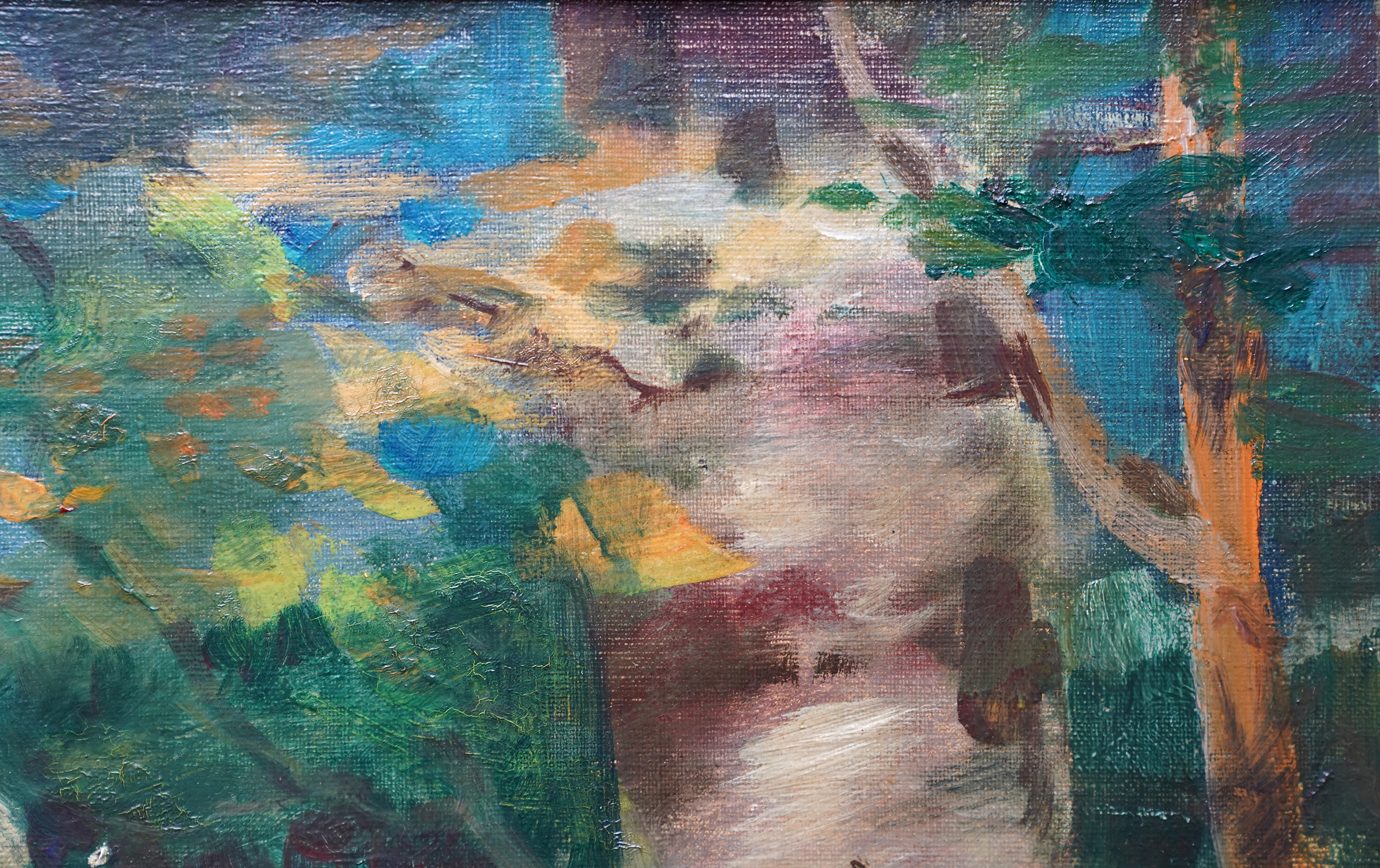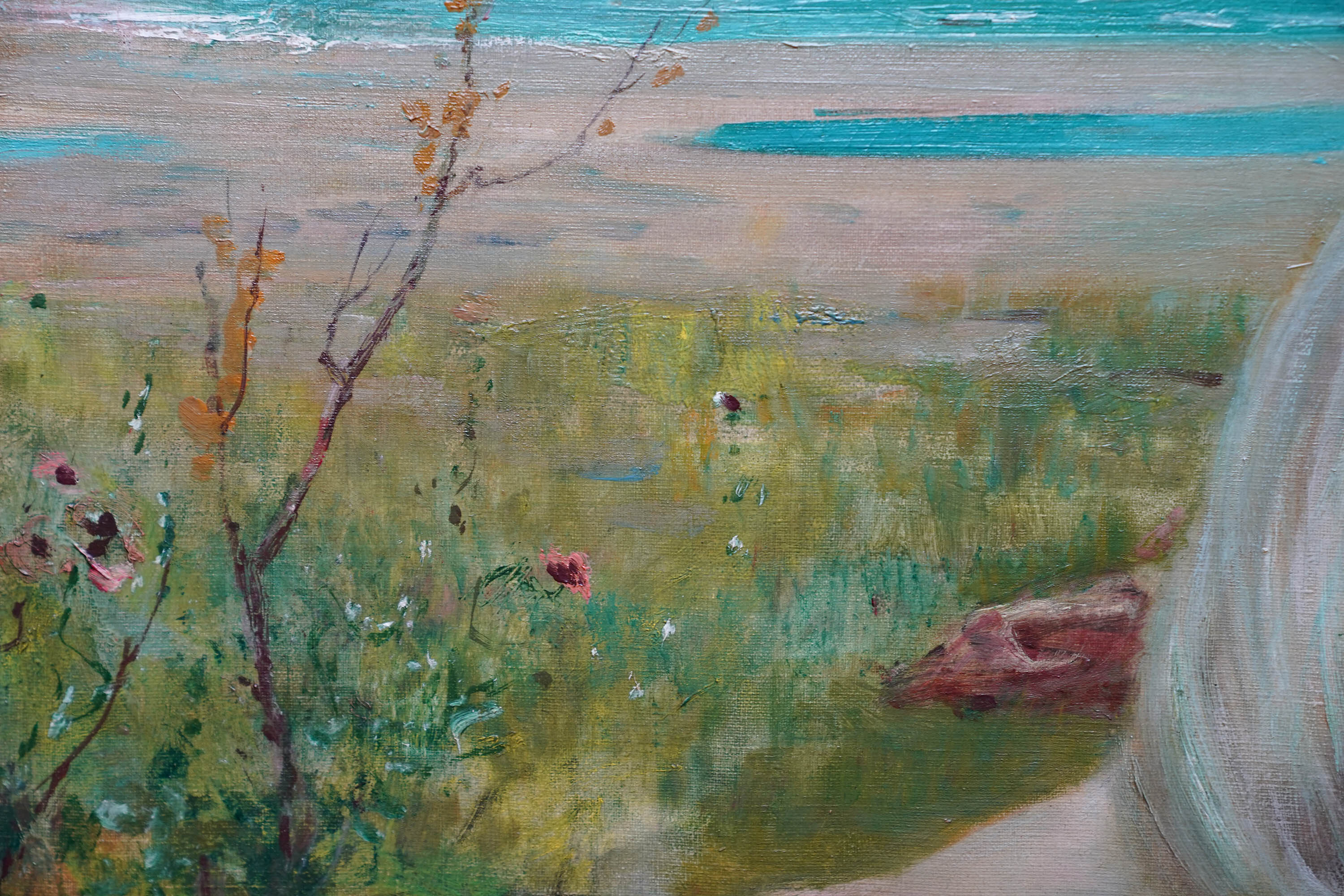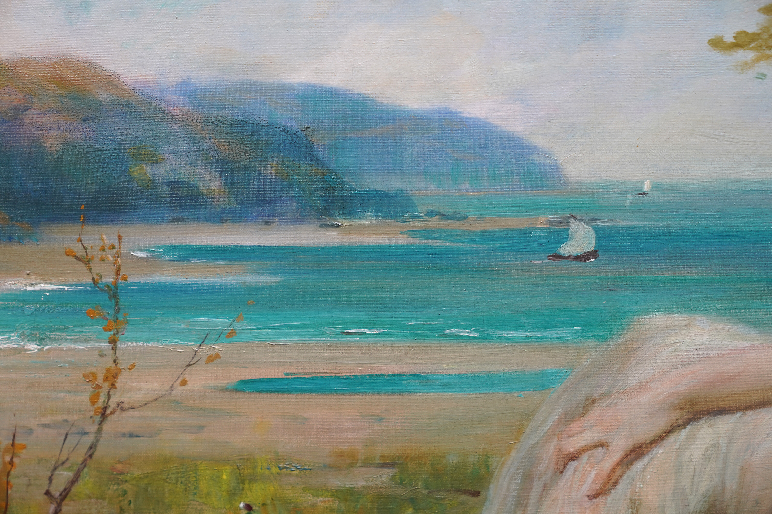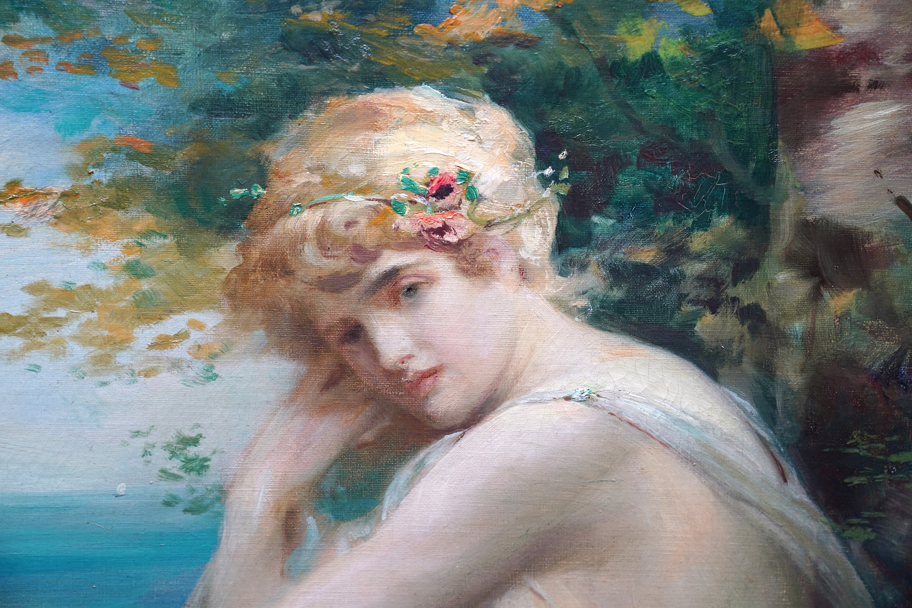 Description This stunning Scottish Victorian portrait oil painting is by noted artist Robert Fowler. Painted circa 1893 the composition is of a blonde haired maiden in the foreground, dressed in a flimsy robe, sitting on grass and leaning against a tree. Beyond her is a vibrant coastal landscape on a summer's day. One can see the influence of Frederick Leighton in his work and also mythology. There is tremendous brushwork and the vivid blues and greens against the soft white of her robe and the clouds is superb. This is an excellent example  of Fowler's work and of Scottish Victorian art. He painted many landscape and scenes arround North Wales and Liverpool and the landscape and sitter depict a Welsh Classical Maiden.