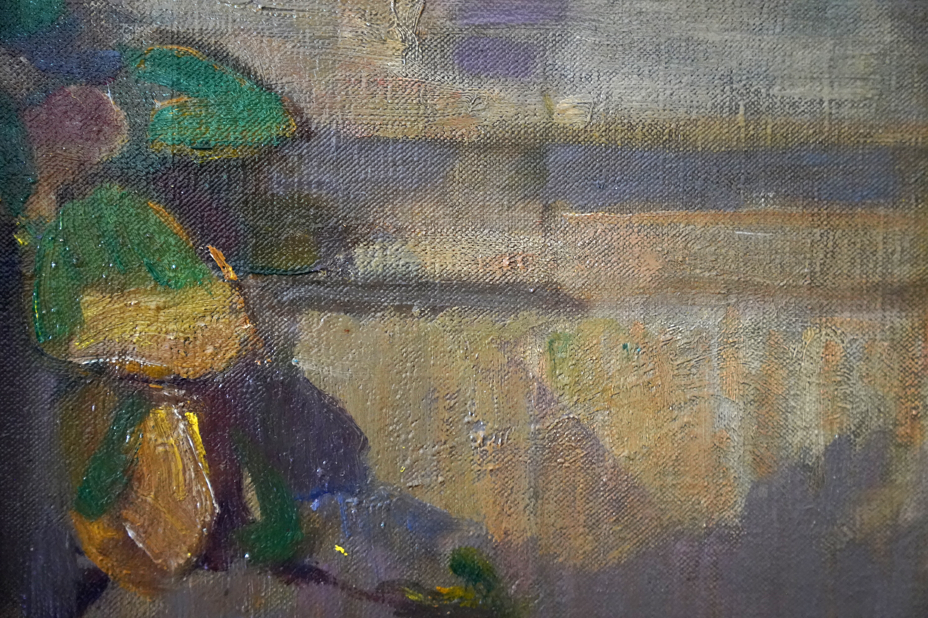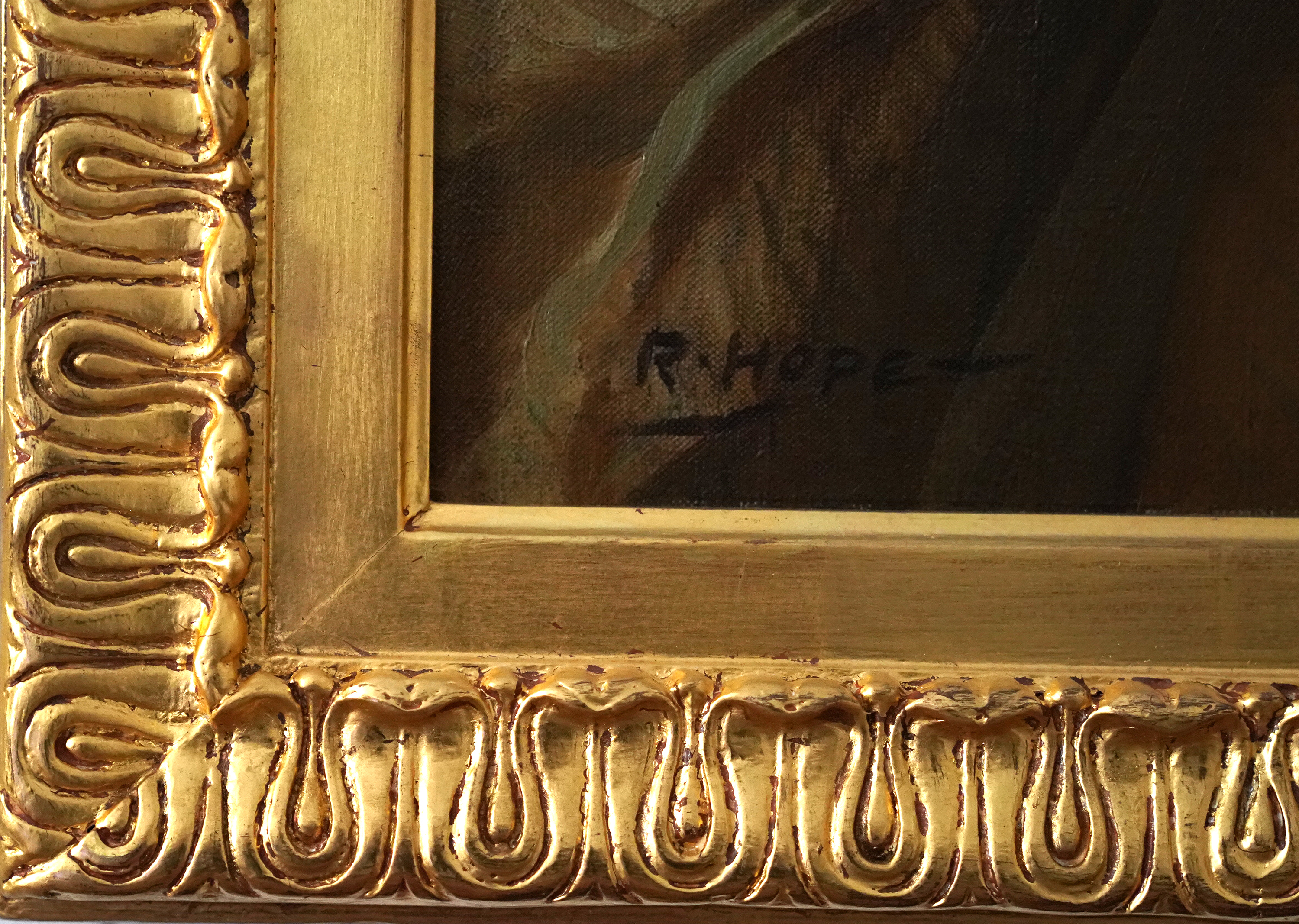 | Description | This sumptuous Scottish oil painting is by noted artist Robert Hope. It was most recently part of the Paisley Art Institute Collection, formerly held by the Paisley Museum and Art Galleries. It was exhibited at the Royal Scottish Academy in 1919 and painted close to this date. The painting is a seated portrait of a woman in profile in a garden. She is holding up a golden apple to a beautiful peacock on the wall behind her. She is wearing a stunning golden dress with blue sash and her auburn hair is up in a bun. The peacock's tail is draped behind her and he is looking back at the golden apple. Yet it is the golden apple that is the focus of attention for the peacock, woman and viewer, an apple selected from red and gold apples in the nearby basket and perhaps offered up to the peacock. The Scottish painter delivers a beautiful exercise in iridescent colours echoing from the woman’s dress, golden with blue sash, to the peacock tail and body colour. The bold brushwork on the whole painting is superb and the vibrant colours are magnificent. This is a stunning painting with excellent provenance from the Royal Scottish Academy 1919 and the Paisley Art Collection and a superb example of Robert Hope's work. Signed lower left. |