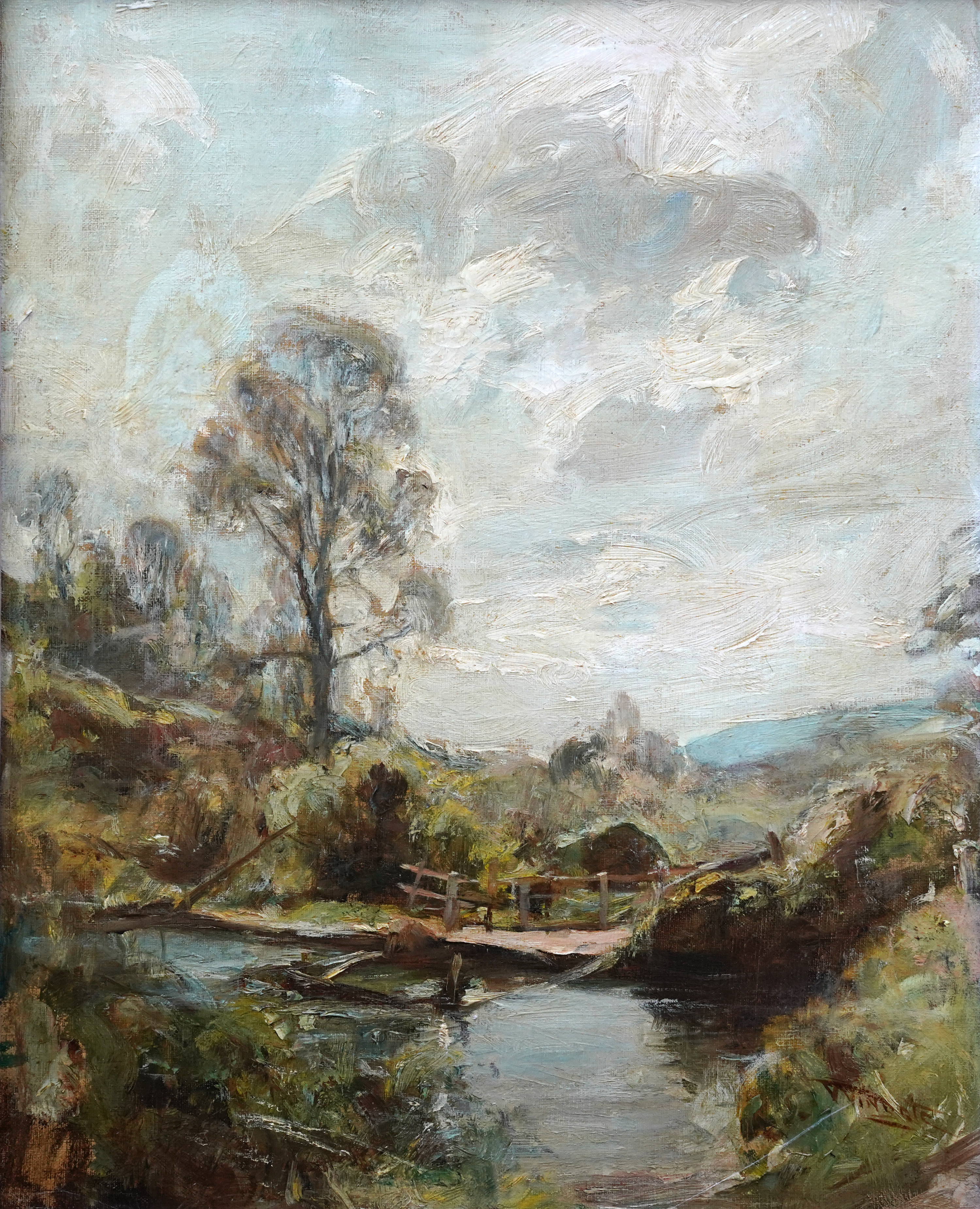 | Description | This lovely Scottish Victorian Impressionist oil painting is by noted artist Sir Charles Lawton Wingate. Painted circa 1890 the composition is a view over a pool towards a little bridge and countryside beyond. The impasto in the sky above, reflected in the waster, is superb. This is a charming Scottish Impressionist 19th century oil painting and a lovely example of Wingate's work. Signed lower right. |