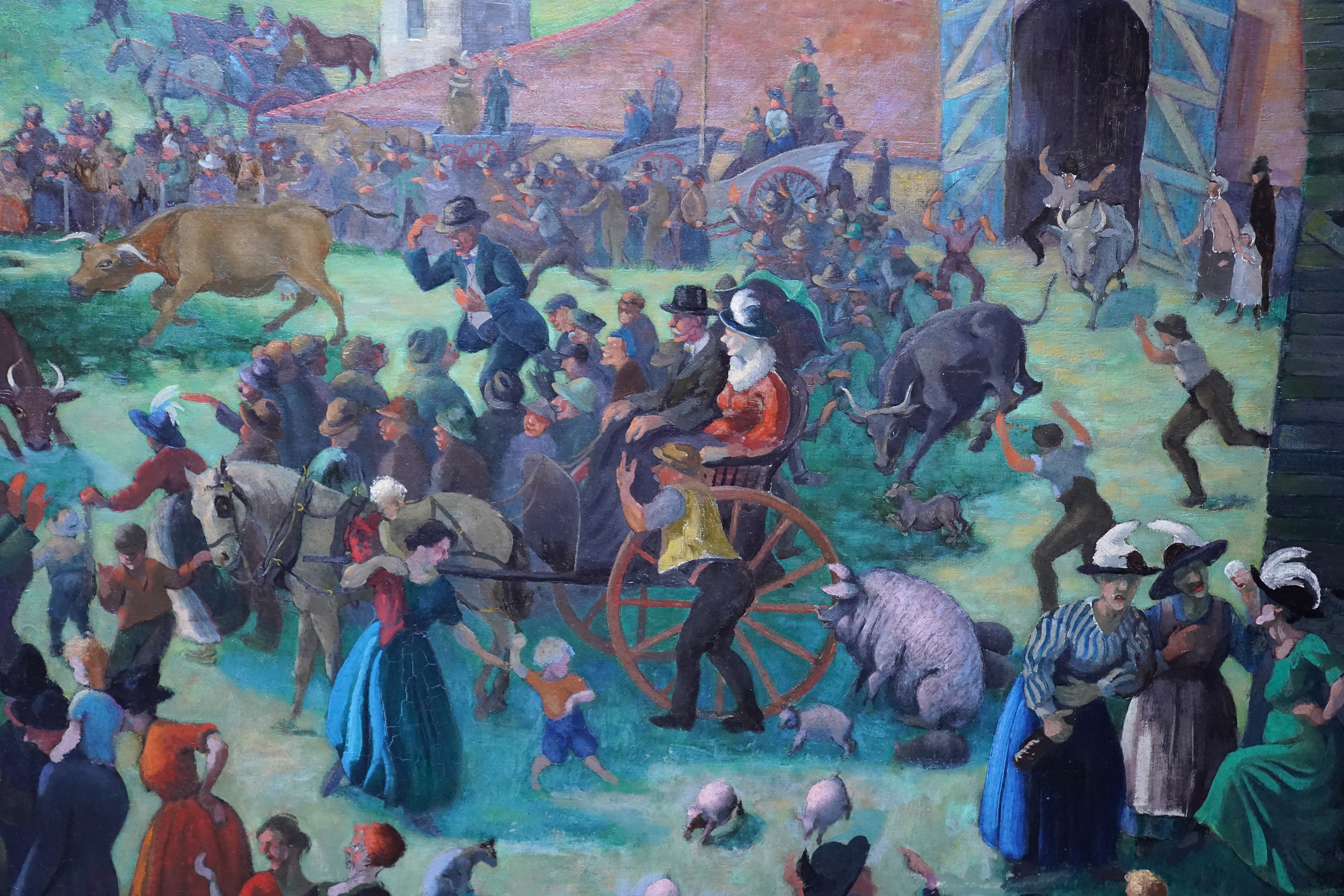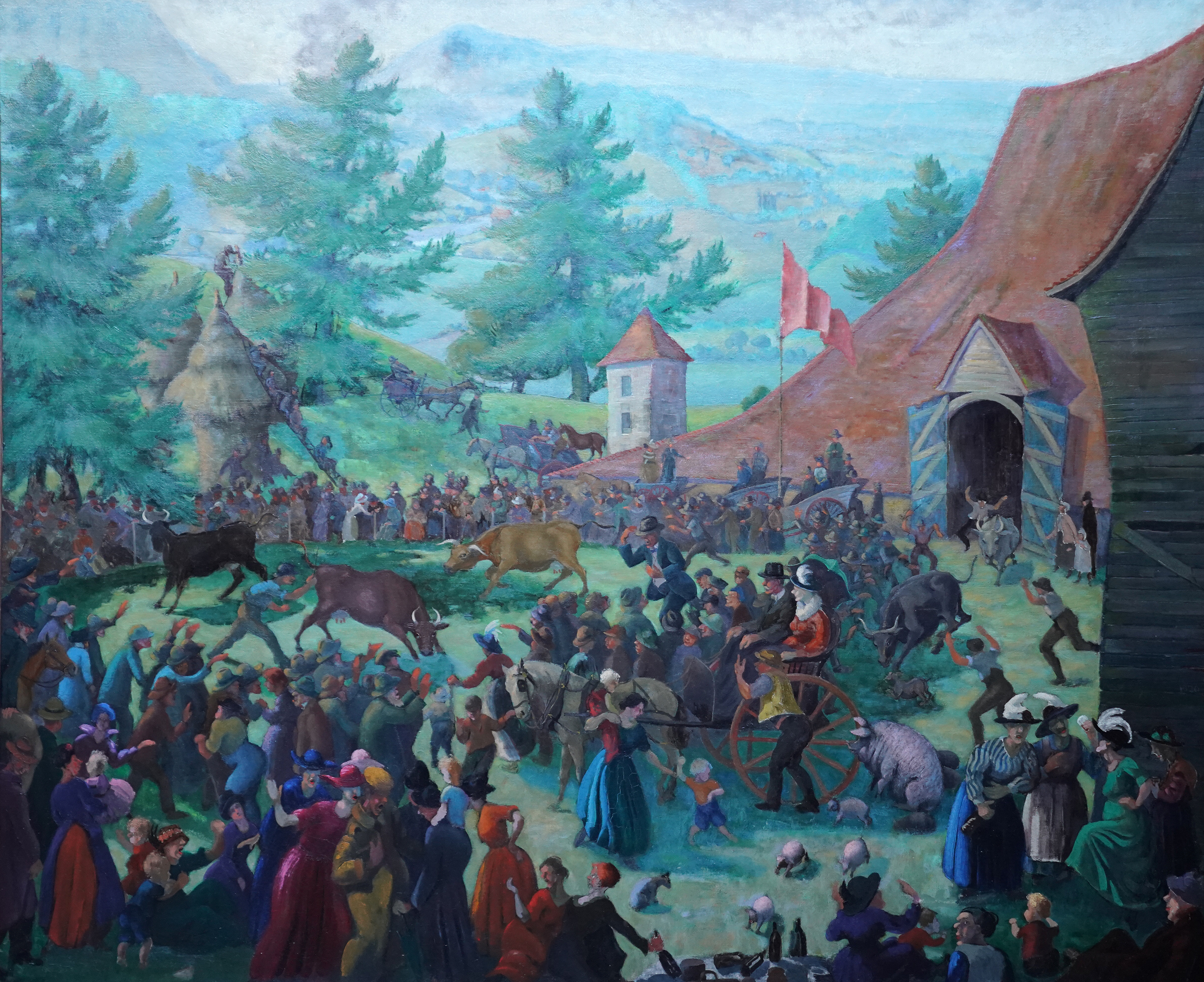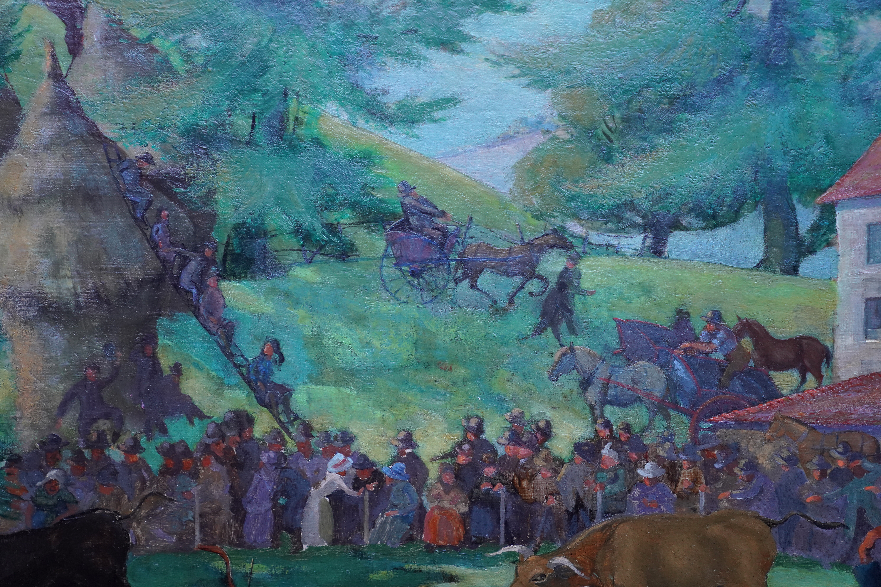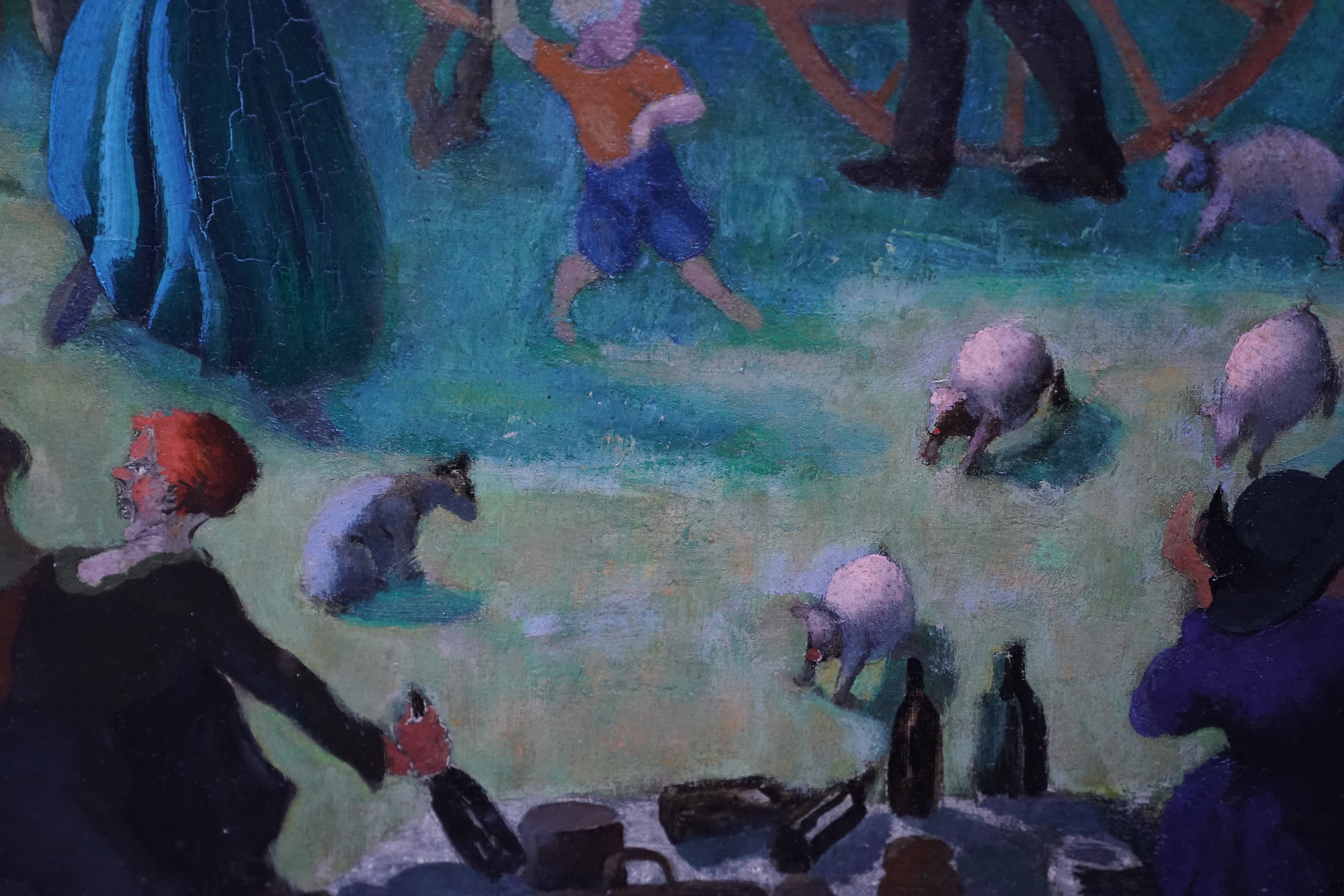 | Description | This superb, large and vibrant Modern British figurative landscape oil painting is by noted Slade School artist Franklin White. Painted in 1926 it was exhibited at the New England Art Club in 1926 as number 220 with title A Cattle Sale and has the original label verso. It is a masterpiece of inter war Breugal Britishness. The setting is a village auction and the painting is packed with numerous people, the ladies in their colourful finery, watching the entertainment, some from their carts. Cattle are in the ring and more animals seem to be escaping from the barn. Children climb the hay stacks behind the scene and the landscape disappears into the distance viewed between big fir trees. It looks like organised chaos but everyone is having fun. The painting is very vibrant and full of energy and light. This is a magnificent twenties Breugal-esque figurative landscape and an excellent example of Franklin White's work. |