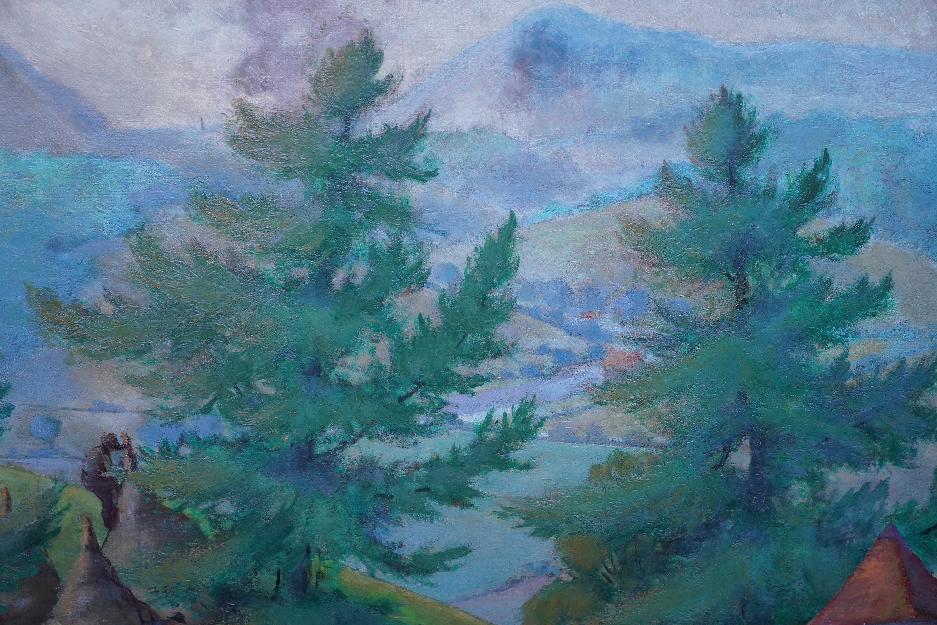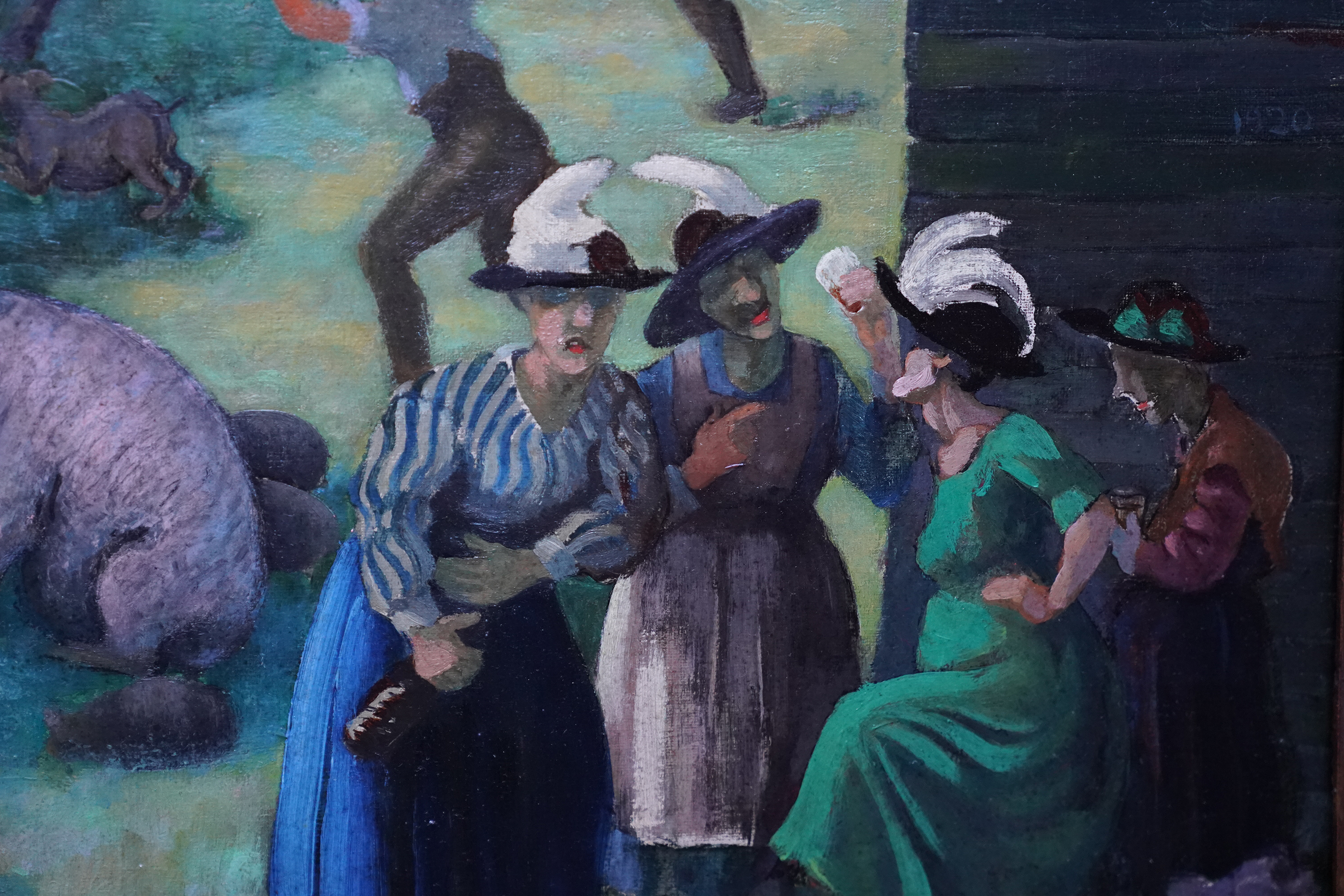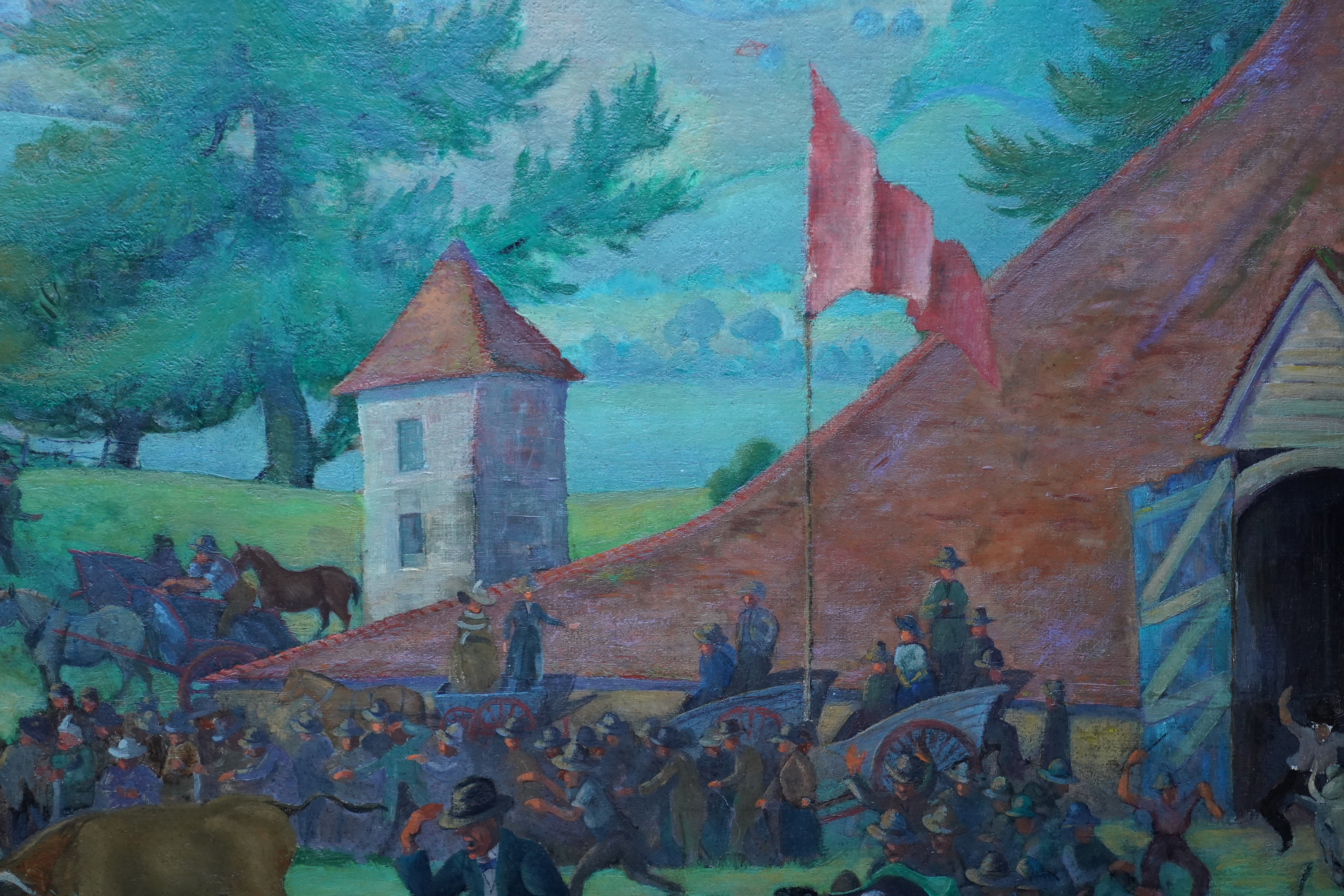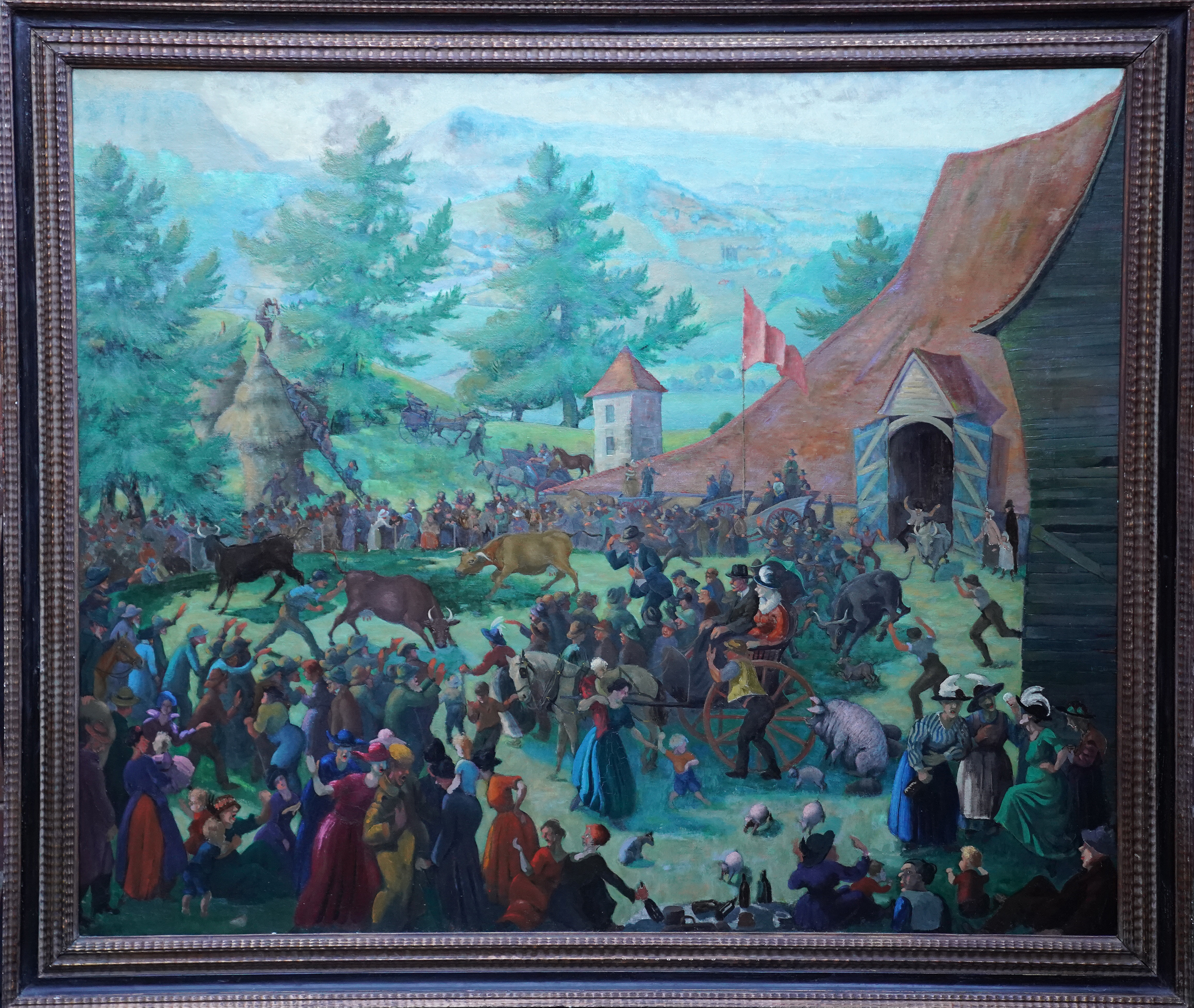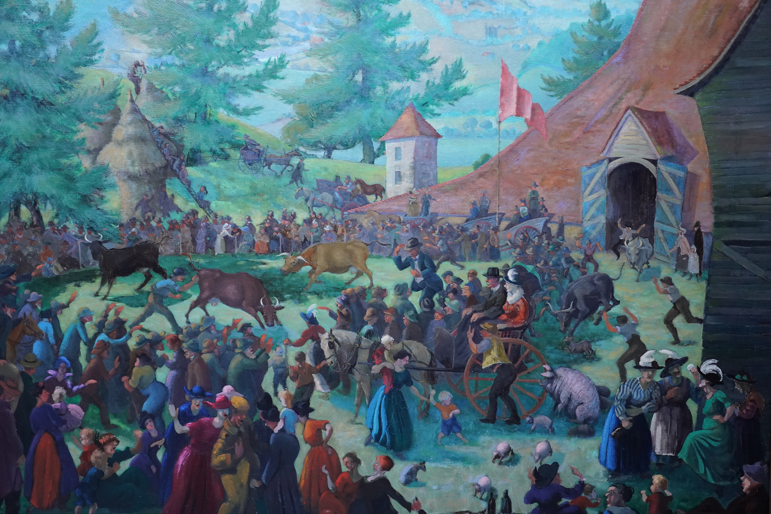 | Description | This superb, large and vibrant Modern British figurative landscape oil painting is by noted Slade School artist Franklin White. Painted in 1926 it was exhibited at the New England Art Club in 1926 as number 220 with title A Cattle Sale and has the original label verso. It is a masterpiece of inter war Breugal Britishness. The setting is a village auction and the painting is packed with numerous people, the ladies in their colourful finery, watching the entertainment, some from their carts. Cattle are in the ring and more animals seem to be escaping from the barn. Children climb the hay stacks behind the scene and the landscape disappears into the distance viewed between big fir trees. It looks like organised chaos but everyone is having fun. The painting is very vibrant and full of energy and light. This is a magnificent twenties Breugal-esque figurative landscape and an excellent example of Franklin White's work. |
